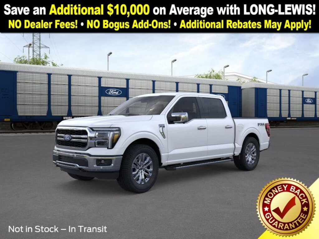 Star White Metallic Tri-Coat 2025 Ford F-150 Lariat 4WD 10-Speed Automatic 5.0L V8 4WD, 4-Wheel Disc Brakes, 4x4 FX4 Off-Road Bodyside Decal, 8 Speakers, ABS brakes, ActiveX Trimmed Bucket Seats, ActiveX Trimmed Smoked Truffle Bucket Seats, Adjustable pedals, Air Conditioning, Alloy wheels, AM/FM radio: SiriusXM with 360L, Auto High-beam Headlights, Auto-dimming door mirrors, Auto-dimming Rear-View mirror, Automatic temperature control, Brake assist, Bumpers: chrome, Chrome wheels, Compass, Delay-off headlights, Driver door bin, Driver vanity mirror, Dual front impact airbags, Dual front side impact airbags, Electronic Stability Control, Emergency communication system: SYNC 4 911 Assist, Front anti-roll bar, Front Bucket Seats, Front Center Armrest, Front dual zone A/C, Front fog lights, Front License Plate Bracket, Front reading lights, Front wheel independent suspension, Fully automatic headlights, FX4 Off-Road Package, Garage door transmitter, Heated door mirrors, Heated front seats, Heated steering wheel, Hill Descent Control, Illuminated entry, Low tire pressure warning, Memory seat, Monotube Rear Shocks, Navigation system: Connected Navigation, Occupant sensing airbag, Off-Road Tuned Front Shock Absorbers, Outside temperature display, Overhead airbag, Overhead console, Panic alarm, Passenger door bin, Passenger vanity mirror, Pedal memory, Power door mirrors, Power driver seat, Power passenger seat, Power steering, Power windows, Radio data system, Radio: B&O Sound System by Bang & Olufsen, Rain sensing wipers, Rear reading lights, Rear seat center armrest, Rear step bumper, Rear window defroster, Remote keyless entry, Rock Crawl Mode, Security system, Speed control, Split folding rear seat, Steering wheel mounted audio controls, SYNC 4 w/Enhanced Voice Recognition, Tachometer, Telescoping steering wheel, Tilt steering wheel, Traction control, Tray Style Floor Liner w/o Carpet Mats, Trip computer, Turn signal indicator mirrors, Variably intermittent wipers, Ventilated front seats, Voltmeter, Wheels: 18" Chrome-Like PVD, 4WD.