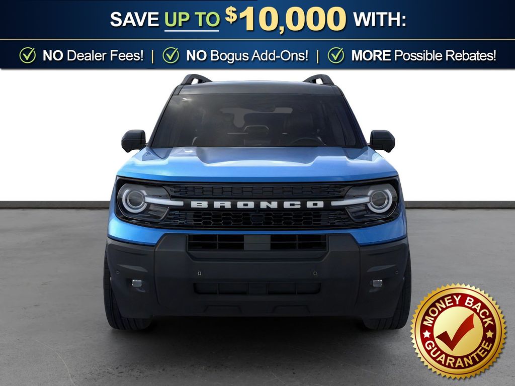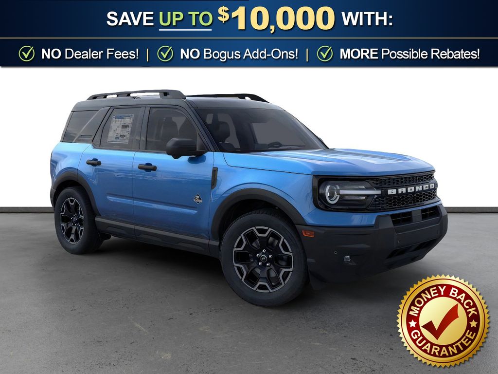 Velocity Blue Metallic 2026 Ford Bronco Sport Outer Banks NFT 4WD 8-Speed Automatic 1.5L EcoBoost 2nd Row Carpeted Seatback, 360-Degree Camera with Trail View, 4-Wheel Disc Brakes, 6 Speakers, ABS brakes, Air Conditioning, Alloy wheels, AM/FM radio: SiriusXM with 360L, AM/FM Stereo, Apple CarPlay/Android Auto, Auto High-beam Headlights, Auto-dimming Rear-View mirror, Automatic temperature control, Brake assist, Compass, Connected Navigation (1-Year Included), Delay-off headlights, Driver door bin, Driver vanity mirror, Dual front impact airbags, Dual front side impact airbags, Electronic Stability Control, Emergency communication system: SYNC 4 911 Assist, Exterior Parking Camera Rear, Ford Connectivity Package (1-Year Included), Four wheel independent suspension, Front anti-roll bar, Front Bucket Seats, Front Center Armrest, Front Driver/Passenger Seat Back Map Pockets, Front dual zone A/C, Front fog lights, Front License Plate Bracket, Front Parking Sensors, Front reading lights, Fully automatic headlights, Heated door mirrors, Heated front seats, Heated steering wheel, Illuminated entry, Internet access capable: 5G Modem - Ford Connectivity Package, Knee airbag, Low tire pressure warning, Memory seat, Occupant sensing airbag, Outer Banks Tech Package+, Outside temperature display, Overhead airbag, Overhead console, Panic alarm, Passenger door bin, Passenger vanity mirror, Power door mirrors, Power driver seat, Power Moonroof, Power passenger seat, Power steering, Power windows, Premium Trimmed Heated Front Sport Contour Bucket Seats, Radio data system, Radio: HD w/B&O Sound System by Bang & Olufsen, Rear anti-roll bar, Rear Parking Sensors, Rear reading lights, Rear seat center armrest, Rear window defroster, Rear window wiper, Remote keyless entry, Reverse Brake Assist, Security system, SiriusXM with 360L, Speed control, Speed-sensing steering, Speed-Sensitive Wipers, Split folding rear seat, Steering wheel mounted audio controls, SYNC 4 with Enhanced Voice Recognition, Tachometer, Telescoping steering wheel, Tilt steering wheel, Traction control, Trip computer, Variably intermittent wipers, Wheels: 18" Ebony Black.