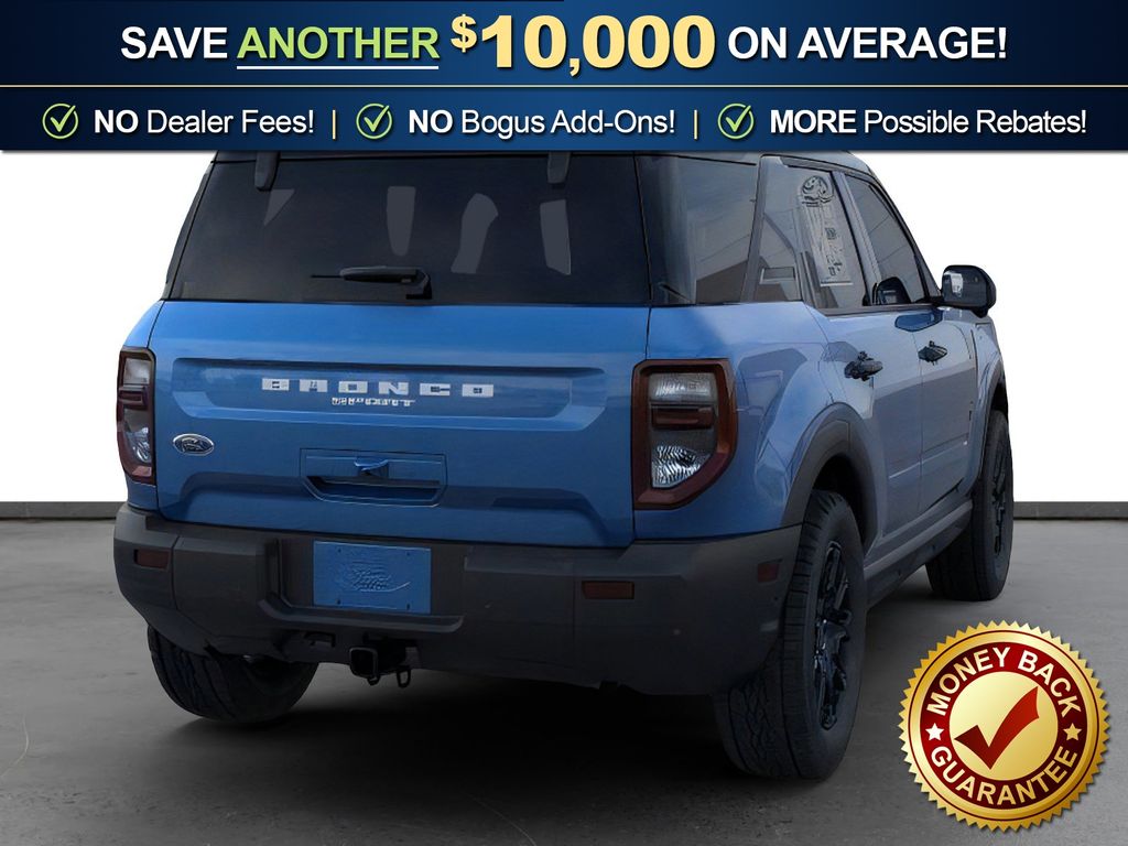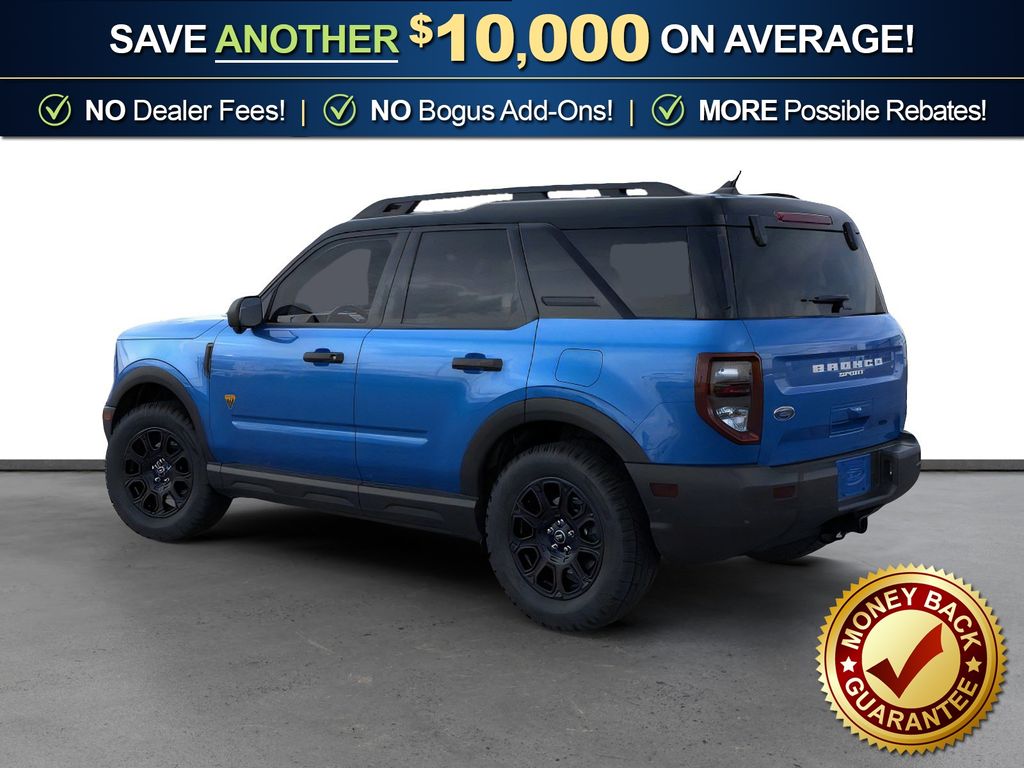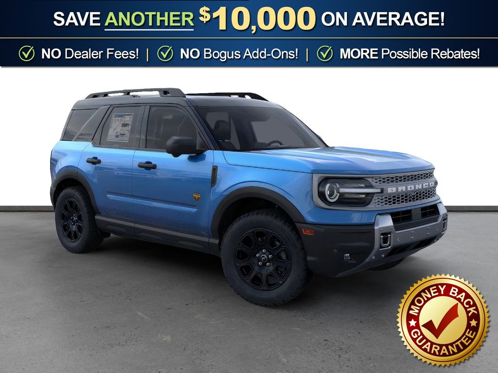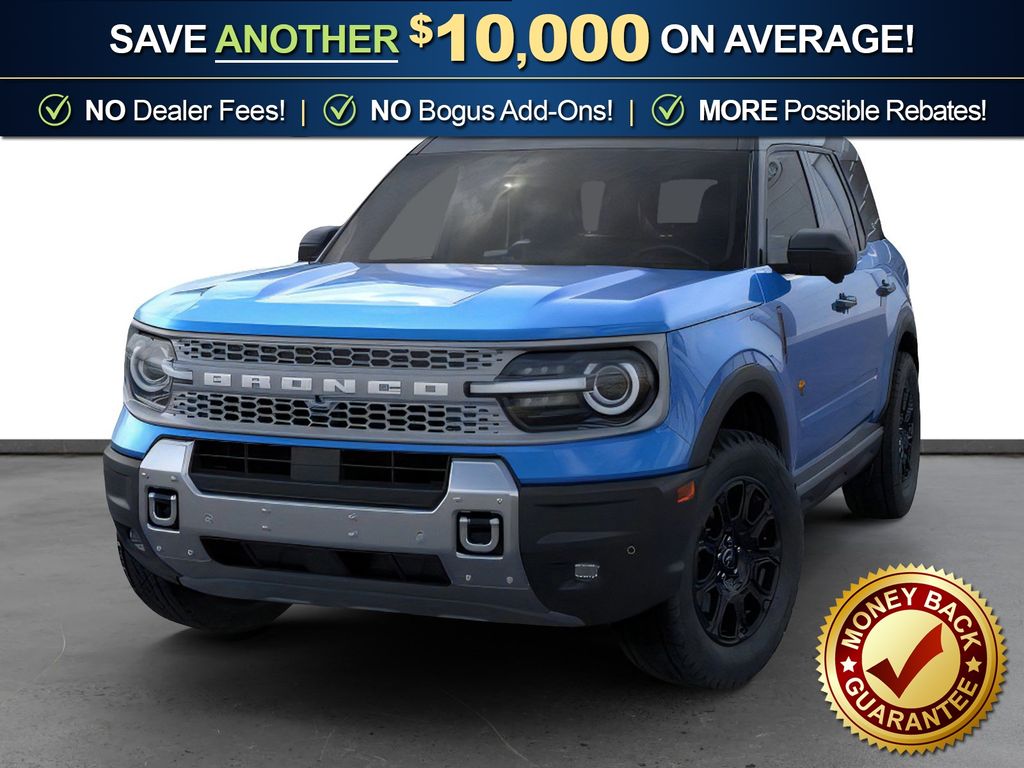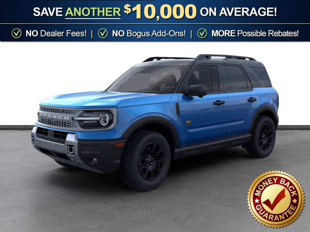 Velocity Blue Metallic 2026 Ford Bronco Sport Badlands NFT 4WD 8-Speed Automatic EcoBoost 2.0L I4 GTDi DOHC Turbocharged VCT 4-Wheel Disc Brakes, 6 Speakers, ABS brakes, Air Conditioning, Alloy wheels, AM/FM radio: SiriusXM with 360L, AM/FM Stereo, Apple CarPlay/Android Auto, Auto High-beam Headlights, Auto-dimming Rear-View mirror, Automatic temperature control, Badlands Tech Package, Brake assist, Compass, Connected Navigation (1-Year Included), Delay-off headlights, Driver door bin, Driver vanity mirror, Dual front impact airbags, Dual front side impact airbags, Electronic Stability Control, Emergency communication system: SYNC 4 911 Assist, Exterior Parking Camera Rear, Ford Connectivity Package (1-Year Included), Four wheel independent suspension, Front anti-roll bar, Front Bucket Seats, Front Center Armrest, Front fog lights, Front License Plate Bracket, Front reading lights, Fully automatic headlights, Heated door mirrors, Heated front seats, Heated steering wheel, Illuminated entry, Internet access capable: 5G Modem - Ford Connectivity Package, Knee airbag, Leather-Trimmed Heated Front Sport Contour Bucket Seats, Low tire pressure warning, Memory seat, Noise Reduction Module, Occupant sensing airbag, Outside temperature display, Overhead airbag, Overhead console, Panic alarm, Passenger door bin, Passenger vanity mirror, Power door mirrors, Power driver seat, Power Moonroof, Power passenger seat, Power steering, Power windows, Radio data system, Radio: HD w/B&O Sound System by Bang & Olufsen, Rear anti-roll bar, Rear reading lights, Rear seat center armrest, Rear window defroster, Rear window wiper, Remote keyless entry, Security system, SiriusXM with 360L, Speed control, Speed-sensing steering, Speed-Sensitive Wipers, Split folding rear seat, Steering wheel mounted audio controls, SYNC 4 with Enhanced Voice Recognition, Tachometer, Telescoping steering wheel, Tilt steering wheel, Traction control, Trip computer, Variably intermittent wipers, Wheels: 17" Matte Black-Painted Aluminum.
