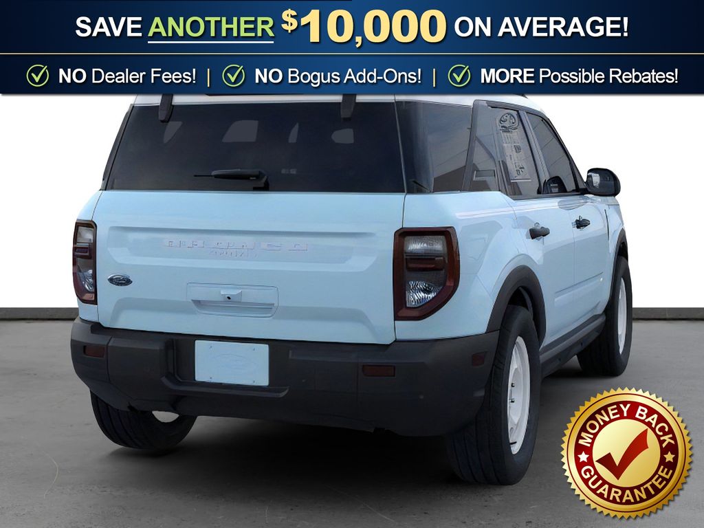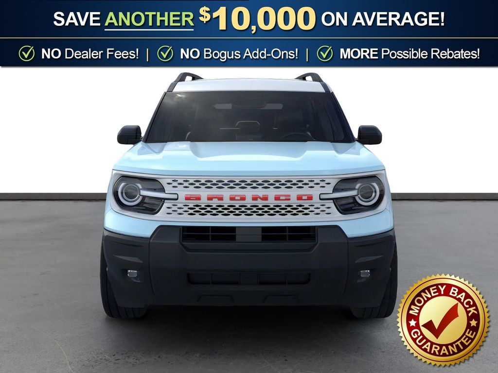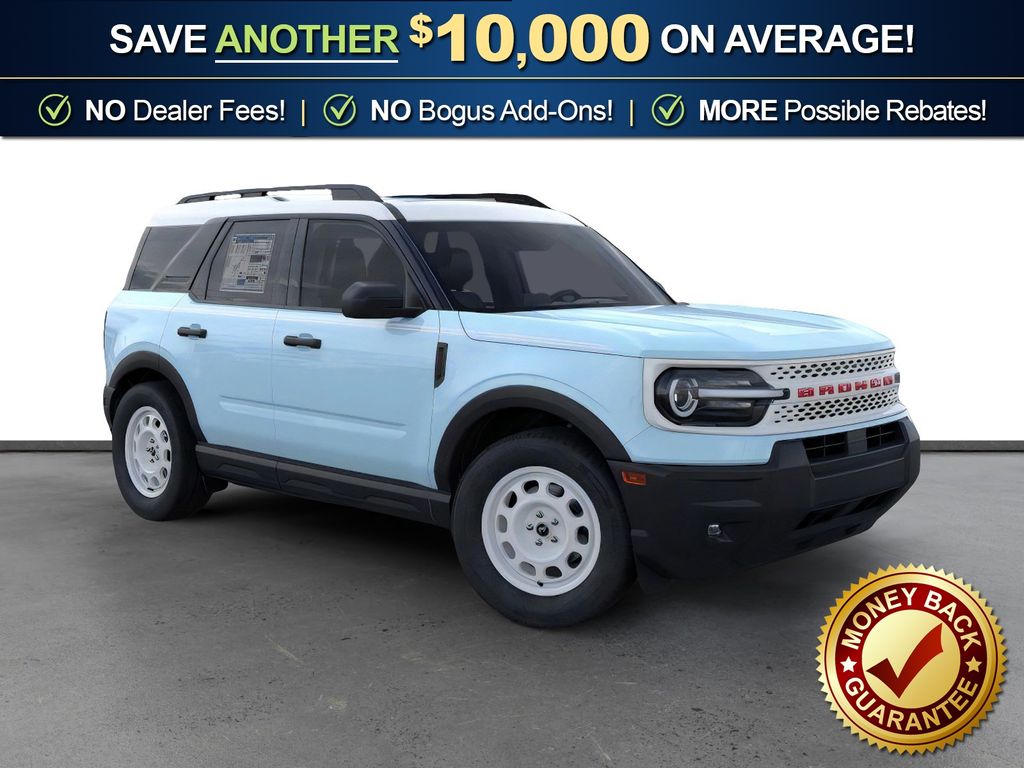 Robins Egg Blue 2026 Ford Bronco Sport Heritage NFT 4WD 8-Speed Automatic 1.5L EcoBoost 4-Wheel Disc Brakes, 6 Speakers, ABS brakes, Air Conditioning, Alloy wheels, AM/FM radio: SiriusXM with 360L, AM/FM Stereo, Apple CarPlay/Android Auto, Auto High-beam Headlights, Automatic temperature control, Brake assist, Compass, Convenience Package, Delay-off headlights, Driver door bin, Driver vanity mirror, Dual front impact airbags, Dual front side impact airbags, Electronic Stability Control, Emergency communication system: SYNC 4 911 Assist, Exterior Parking Camera Rear, Ford Connectivity Package (1-Year Included), Four wheel independent suspension, Front anti-roll bar, Front Bucket Seats, Front Center Armrest, Front Driver/Passenger Seat Back Map Pockets, Front License Plate Bracket, Front reading lights, Fully automatic headlights, Heated 8-Way Power Driver's Seat, Heated door mirrors, Illuminated entry, Internet access capable: 5G Modem - Ford Connectivity Package, Knee airbag, LED Fog Lamps, Low tire pressure warning, Occupant sensing airbag, Outside temperature display, Overhead airbag, Overhead console, Panic alarm, Passenger door bin, Passenger vanity mirror, Plaid Cloth Front Bucket Seats, Power door mirrors, Power Moonroof, Power steering, Power windows, Premium Wrapped Steering Wheel, Radio data system, Rear anti-roll bar, Rear Parking Sensors, Rear reading lights, Rear seat center armrest, Rear window defroster, Rear window wiper, Remote keyless entry, Security system, SiriusXM with 360L, Speed control, Speed-sensing steering, Speed-Sensitive Wipers, Split folding rear seat, Steering wheel mounted audio controls, SYNC 4 with Enhanced Voice Recognition, Tachometer, Telescoping steering wheel, Tilt steering wheel, Traction control, Trip computer, Variably intermittent wipers, Wheels: 17" Oxford White-Painted Aluminum.