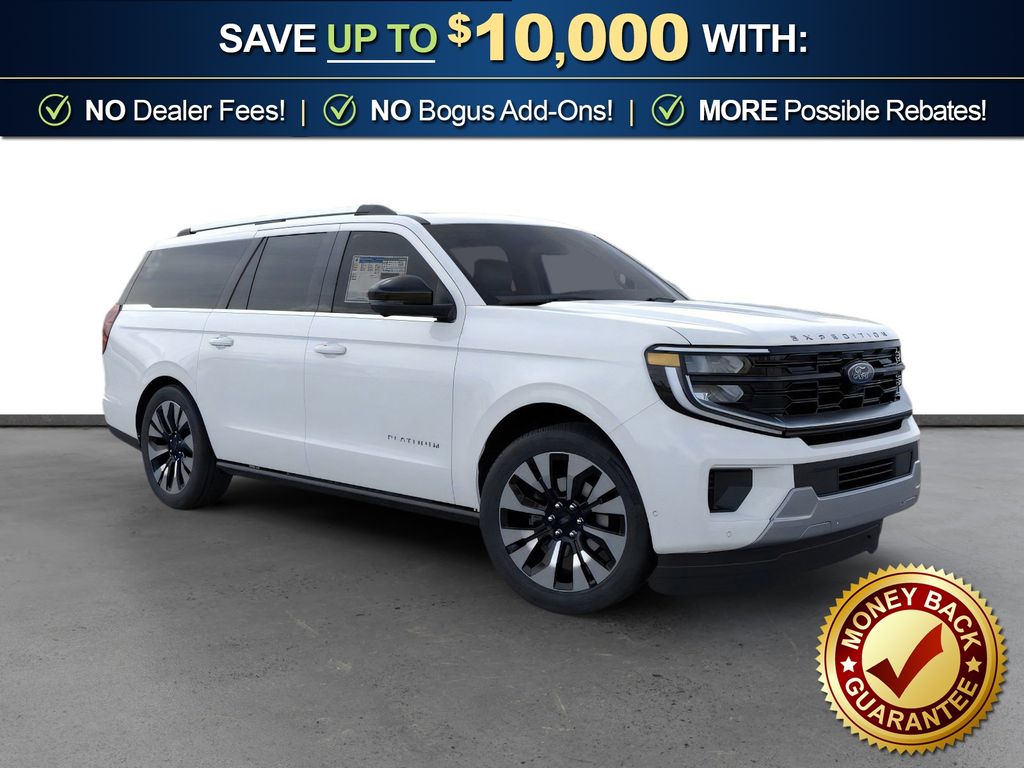 Oxford White 2026 Ford Expedition Max Platinum NFT 4WD 10-Speed Automatic EcoBoost 3.5L V6 GTDi DOHC 24V Twin Turbocharged 10 Speakers, 2nd Row Power-Folding Captain's Chairs, 3.73 Axle Ratio, 3rd row seats: split-bench, 4-Wheel Disc Brakes, ABS brakes, Air Conditioning, Alloy wheels, AM/FM radio: SiriusXM with 360L, Apple CarPlay/Android Auto, Auto High-beam Headlights, Auto-dimming door mirrors, Auto-dimming Rear-View mirror, Automatic temperature control, Black Onyx Painted Power Deployable Running Boards, Brake assist, Bumpers: body-color, Compass, Delay-off headlights, Driver door bin, Driver vanity mirror, Driver's Package, Dual front impact airbags, Dual front side impact airbags, Electronic Stability Control, Emergency communication system: 911 Assist, Exterior Parking Camera Rear, Ford Connectivity Package (1-Year Included), Ford Digital Experience, Four wheel independent suspension, Front anti-roll bar, Front Bucket Seats, Front Center Armrest, Front dual zone A/C, Front License Plate Bracket, Front reading lights, Fully automatic headlights, Garage door transmitter, Genuine wood dashboard insert, Genuine wood door panel insert, Heated and Ventilated Leather Front Captain's Chairs, Heated door mirrors, Heated front seats, Heated rear seats, Heated steering wheel, Illuminated entry, Intersection Assist, Leather steering wheel, Low tire pressure warning, Memory seat, Multicontour Active Motion Lthr Frnt Captains Chairs, Navigation System, Occupant sensing airbag, Outside temperature display, Overhead airbag, Overhead console, Panic alarm, Passenger door bin, Passenger vanity mirror, Power door mirrors, Power driver seat, Power moonroof: Vista Roof, Power passenger seat, Power steering, Power windows, Radio data system, Radio: B&O Play Unleashed, Radio: B&O Sound System by Bang and Olufsen, Rain sensing wipers, Rear air conditioning, Rear anti-roll bar, Rear reading lights, Rear window defroster, Rear window wiper, Reclining 3rd row seat, Remote keyless entry, Security system, SiriusXM with 360L, Speed control, Speed-sensing steering, Speed-Sensitive Wipers, Split folding rear seat, Spoiler, Steering wheel memory, Steering wheel mounted audio controls, Tachometer, Telescoping steering wheel, Tilt steering wheel, Traction control, Trip computer, Turn signal indicator mirrors, Variably intermittent wipers, Ventilated front seats, Voltmeter, Wheels: 20" x 8.5" Ebony Bright Machined Aluminum, Wheels: 22" x 9.0" Ebony Bright Machined Face Aluminum.