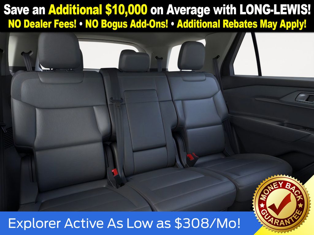 Star White Metallic Tri-Coat 2026 Ford Explorer Active NFT RWD 10-Speed Automatic 2.3L EcoBoost I-4 2nd Row 35/30/35 Bench with E-Z Entry and Armrest, 3rd row seats: bench, 4-Wheel Disc Brakes, 6 Speakers, ABS brakes, Active Comfort Package, Air Conditioning, Alloy wheels, AM/FM radio: SiriusXM with 360L, AM/FM Stereo, Apple CarPlay/Android Auto, Auto High-beam Headlights, Automatic temperature control, Brake assist, Bumpers: body-color, Compass, Delay-off headlights, Driver door bin, Driver vanity mirror, Dual front impact airbags, Dual front side impact airbags, Electronic Stability Control, Emergency communication system: 911 Assist, Exterior Parking Camera Rear, Four wheel independent suspension, Front anti-roll bar, Front Bucket Seats, Front Center Armrest, Front dual zone A/C, Front Fascia, Front License Plate Bracket, Front reading lights, Fully automatic headlights, Heated ActiveX Seating Material Captain's Chairs, Heated door mirrors, Heated Steering Wheel, Illuminated entry, Internet access capable: FordPass Connect 5G, Knee airbag, Low tire pressure warning, Navigation System, Occupant sensing airbag, Outside temperature display, Overhead airbag, Overhead console, Panic alarm, Passenger door bin, Passenger vanity mirror, Power driver seat, Power steering, Power windows, Rear air conditioning, Rear anti-roll bar, Rear reading lights, Rear window defroster, Rear window wiper, Remote keyless entry, Remote Start System, Second Row Hvac Controls, SecuriCode Keyless Entry Keypad, Security system, Speed control, Speed-sensing steering, Speed-Sensitive Wipers, Split folding rear seat, Spoiler, Steering wheel mounted audio controls, Tachometer, Telescoping steering wheel, Tilt steering wheel, Traction control, Trip computer, Unique Cloth Captain's Chairs, Variably intermittent wipers, Wheels: 18" Sparkle Silver-Painted Aluminum.