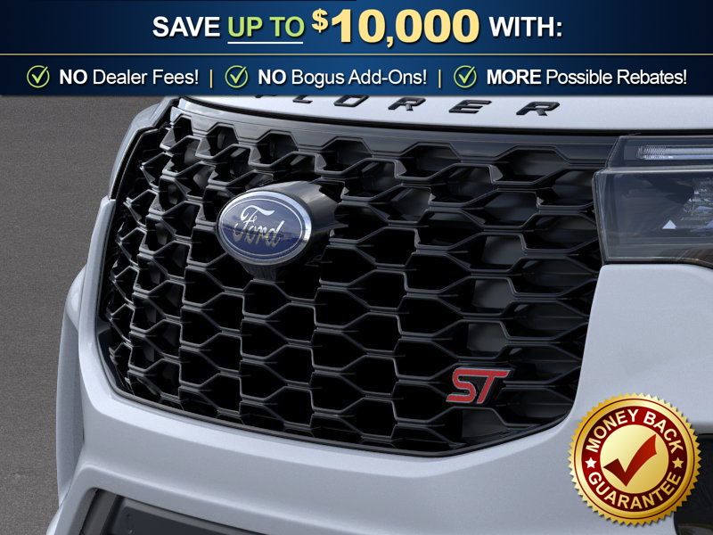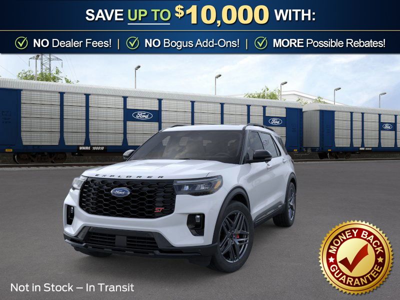 Space White Metallic 2026 Ford Explorer ST NFT 4WD 10-Speed Automatic 3.0L EcoBoost V6 4WD, 10 Speakers, 3rd row seats: bench, 4-Wheel Disc Brakes, ABS brakes, Air Conditioning, Alloy wheels, AM/FM radio: SiriusXM with 360L, Apple CarPlay/Android Auto, Auto High-beam Headlights, Auto-dimming door mirrors, Auto-dimming Rear-View mirror, Automatic temperature control, BlueCruise Equipped (1-Year + 90-Day Plan), Brake assist, Bumpers: body-color, Compass, Delay-off headlights, Driver door bin, Driver vanity mirror, Dual front impact airbags, Dual front side impact airbags, Electronic Stability Control, Emergency communication system: 911 Assist, Exterior Parking Camera Rear, Ford Connectivity Package (one-Time Purchase - 7 Years), Four wheel independent suspension, Front anti-roll bar, Front Bucket Seats, Front Center Armrest, Front dual zone A/C, Front fog lights, Front License Plate Bracket, Front reading lights, Fully automatic headlights, Garage door transmitter, Heated door mirrors, Heated front seats, Heated rear seats, Heated steering wheel, Heated/Ventilated Miko Suede Captain's Chairs, Illuminated entry, Knee airbag, Leather steering wheel, Low tire pressure warning, Memory seat, Multicontour Seats with Front Active Motion, Navigation System, Occupant sensing airbag, Outside temperature display, Overhead airbag, Overhead console, Panic alarm, Panoramic Fixed Glass Roof with Power Shade, Passenger door bin, Passenger vanity mirror, Power door mirrors, Power driver seat, Power Liftgate, Power passenger seat, Power steering, Power windows, Radio: B&O Sound System by Bang & Olufsen, Radio: B&O Sound System by Bang and Olufsen, Rain sensing wipers, Rear air conditioning, Rear anti-roll bar, Rear reading lights, Rear window defroster, Rear window wiper, Remote Control Front Windows, Remote keyless entry, SecuriCode Keyless Entry Keypad, Security system, Speed control, Speed-sensing steering, Speed-Sensitive Wipers, Split folding rear seat, Spoiler, Sport steering wheel, Steering wheel mounted audio controls, Sun and Sound Package, Tachometer, Telescoping steering wheel, Tilt steering wheel, Traction control, Trip computer, Turn signal indicator mirrors, Variably intermittent wipers, Ventilated front seats, Wheels: 21" Magnetite-Painted Aluminum, 4WD.