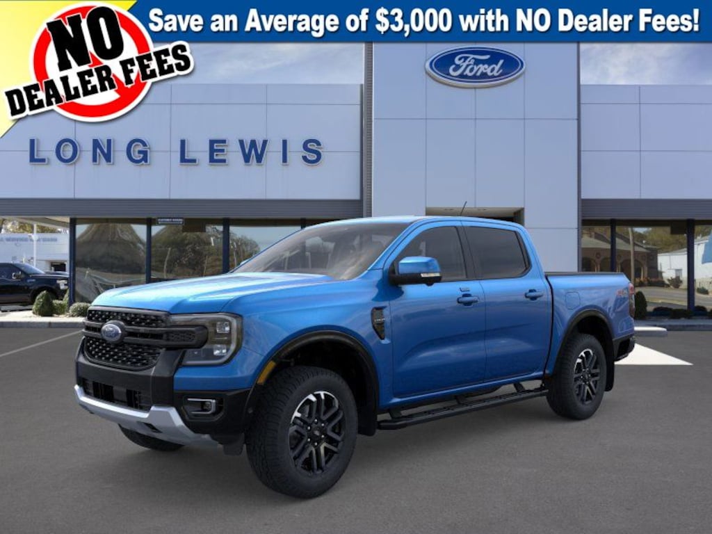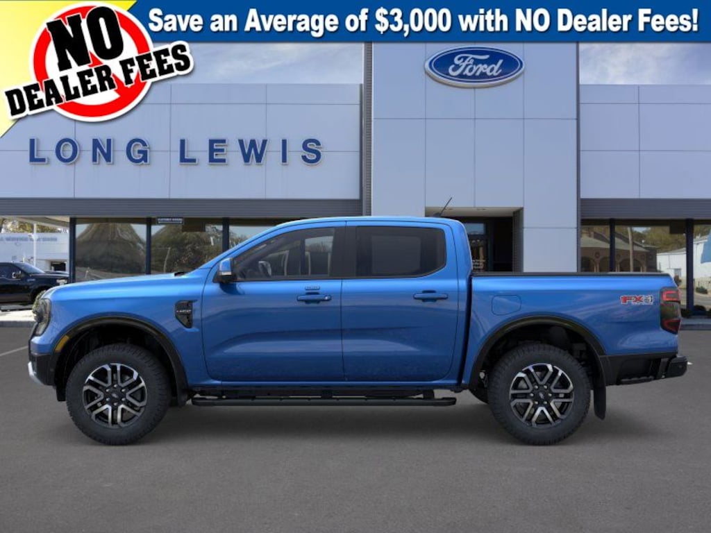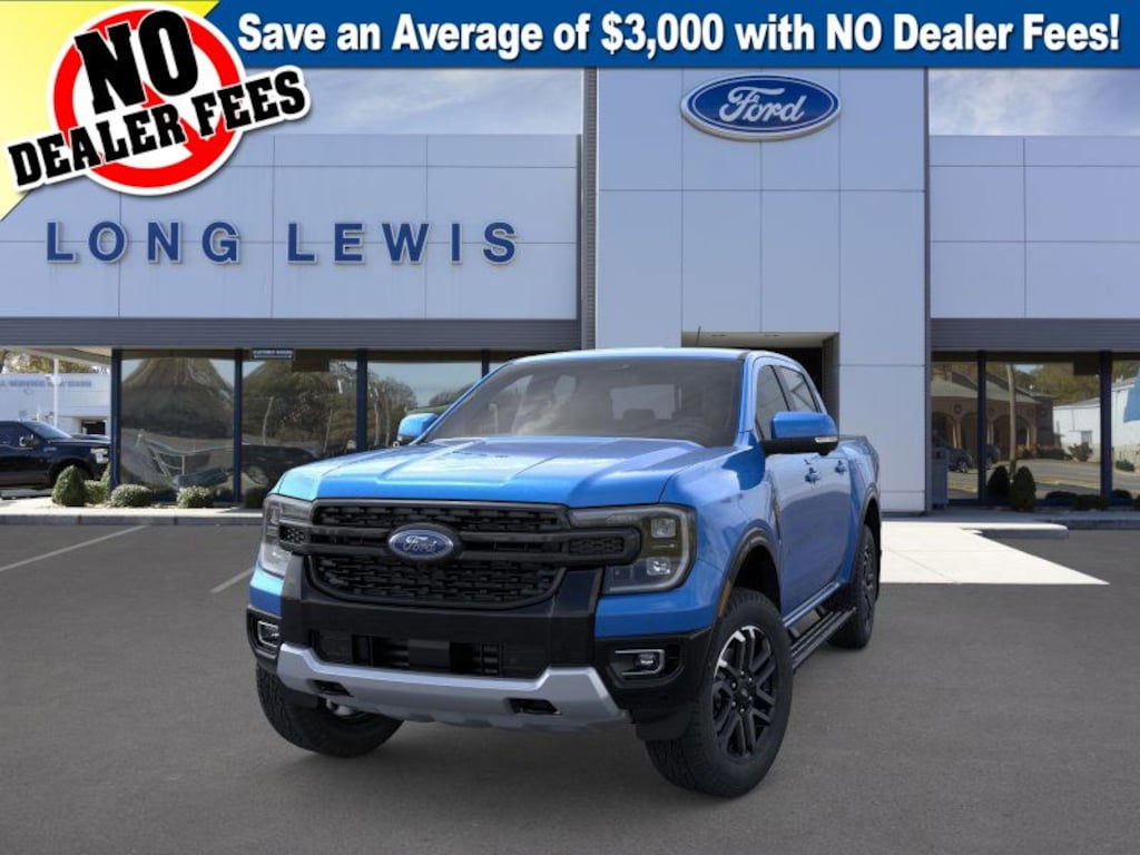 Velocity Blue Metallic 2024 Ford Ranger Lariat 4WD 10-Speed Automatic EcoBoost 2.3L I4 GTDi DOHC Turbocharged VCT 4WD, 10 Speakers, 3.73 Axle Ratio, 4-Wheel Disc Brakes, ABS brakes, Air Conditioning, Alloy wheels, AM/FM radio: SiriusXM, Auto High-beam Headlights, Auto-dimming Rear-View mirror, Automatic temperature control, Black Running Boards, Body-Color SecuriCode Keyless Entry Keypad, Brake assist, Class IV Trailer Hitch Receiver, Compass, Delay-off headlights, Driver door bin, Driver vanity mirror, Dual front impact airbags, Dual front side impact airbags, Electronic Stability Control, Electronic-Locking Rear Differential, Emergency communication system: SYNC 4 911 Assist, Equipment Group 500A Standard, Exterior Parking Camera Rear, Front & Rear Splash Guards/Mud Flaps, Front anti-roll bar, Front Bucket Seats, Front Center Armrest, Front dual zone A/C, Front fog lights, Front reading lights, Front wheel independent suspension, Fully automatic headlights, FX4 Off-Road Box Decal, FX4 Off-Road Package, FX4 Selectable Drive Modes, Garage door transmitter, Gray Painted Center Bar & Grille Surround, Gray Painted Front Fascia & Rear Bumper, Gray Painted Wheel Lip Molding, Heated door mirrors, Heated front seats, Heated steering wheel, Illuminated entry, Integrated Box Side Step, Leather Shift Knob, Leather steering wheel, Leather-Trimmed Front Heated Bucket Seats, Low tire pressure warning, Memory seat, Navigation system: Connected Navigation, Occupant sensing airbag, Off-Road Screen in Center Stack, Off-Road Tuned Shocks, Outside temperature display, Overhead airbag, Overhead console, Panic alarm, Passenger door bin, Passenger vanity mirror, Power door mirrors, Power driver seat, Power passenger seat, Power steering, Power windows, Radio: B&O Sound System by Bang & Olufsen, Rain sensing wipers, Rear reading lights, Rear seat center armrest, Rear step bumper, Rear window defroster, Remote keyless entry, Security system, SiriusXM Satellite Radio, Speed control, Speed-sensing steering, Sport Appearance Package, Sport Box Decal, Steering wheel mounted audio controls, SYNC 4A w/Connected Built-In Navigation, Telescoping steering wheel, Tilt steering wheel, Traction control, Trailer Tow Package, Trip computer, Turn signal indicator mirrors, Variably intermittent wipers, Voltmeter, Wheels: 18" Machined Aluminum w/Dark Pockets, 4WD.