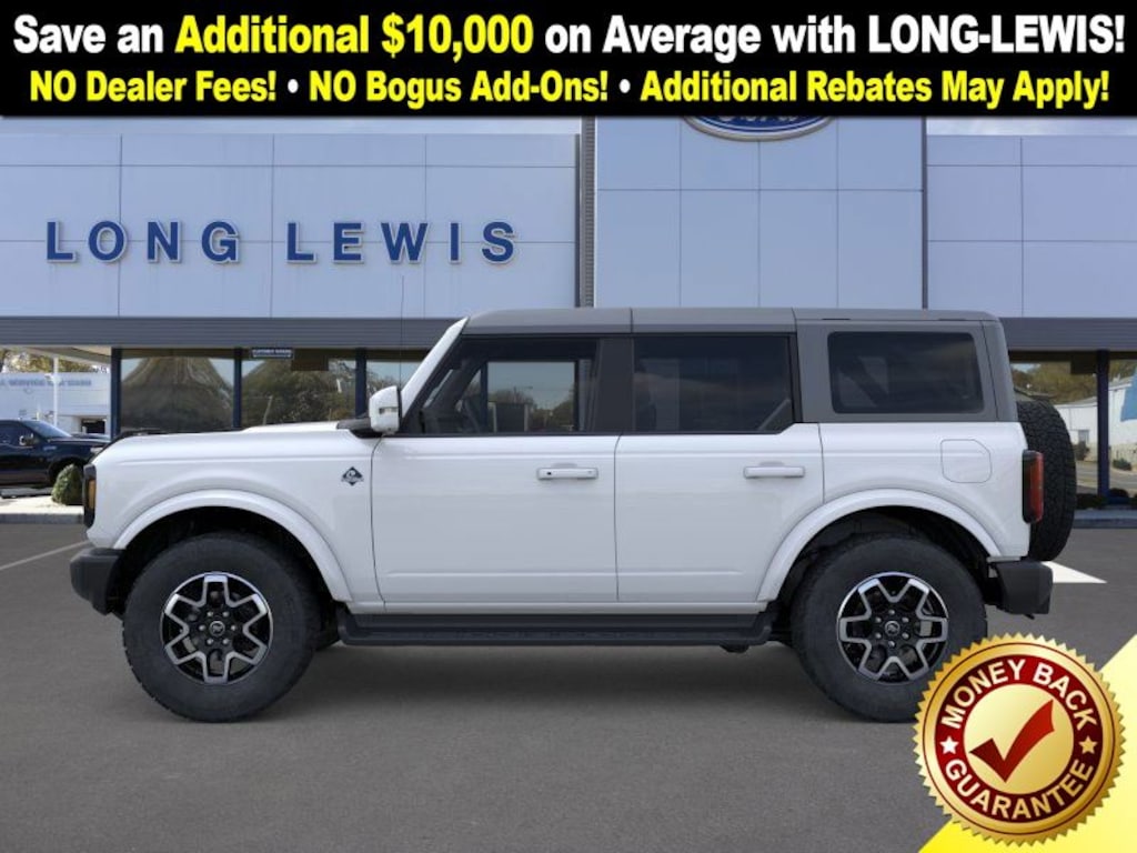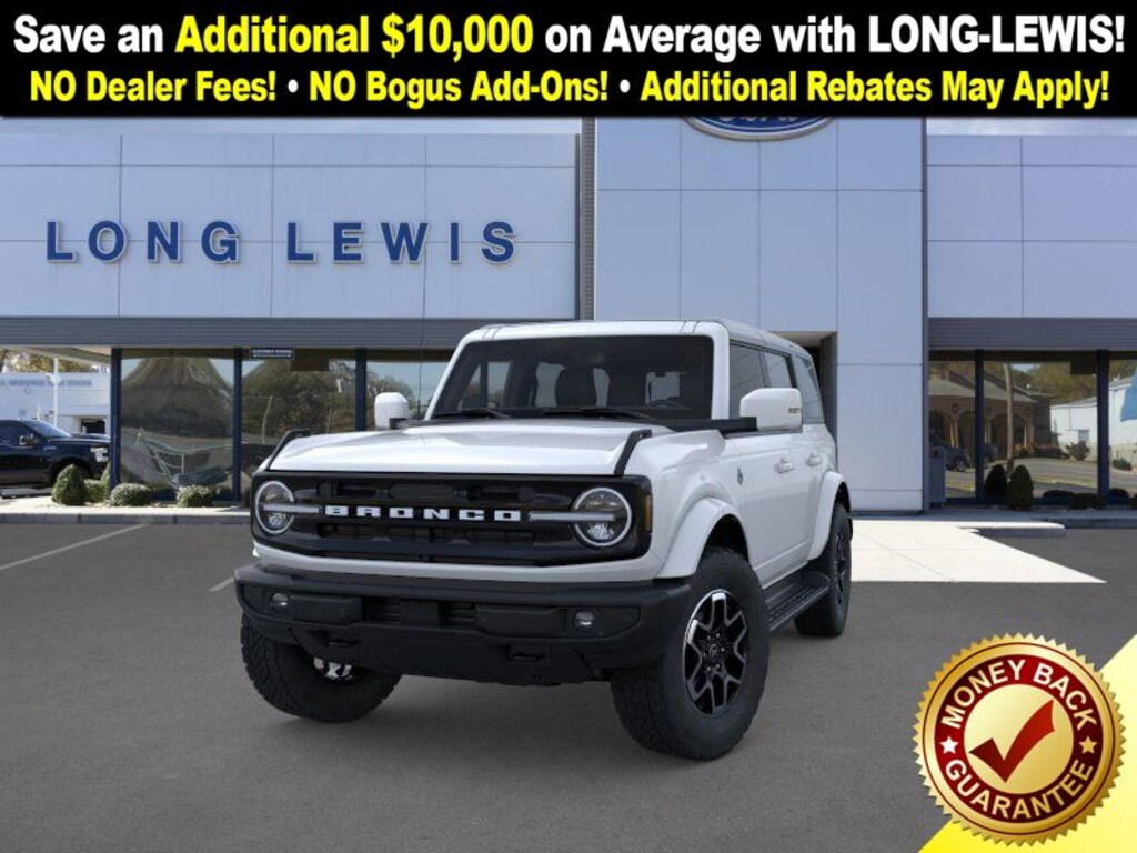 Oxford White 2025 Ford Bronco Outer Banks fctp 4WD 10-Speed Automatic 2.3L EcoBoost I-4 18" Bright Machined Aluminum Wheels, 3.73 Axle Ratio, 4-Wheel Disc Brakes, 7 Speakers, ABS brakes, Air Conditioning, Alloy wheels, AM/FM radio: SiriusXM with 360L, AM/FM Stereo, Auto High-beam Headlights, Auto-dimming Rear-View mirror, Automatic temperature control, Brake assist, Carbonized Gray Molded-In-Color Hard Top, Compass, Connected Navigation, Delay-off headlights, Driver door bin, Driver vanity mirror, Dual front impact airbags, Dual front side impact airbags, Electronic Stability Control, Emergency communication system: 911 Assist, Exterior Parking Camera Rear, Front anti-roll bar, Front Bucket Seats, Front Center Armrest, Front dual zone A/C, Front fog lights, Front License Plate Bracket, Front reading lights, Front wheel independent suspension, Fully automatic headlights, Hard Top Sound Deadening Headliner, Heated door mirrors, Heated front seats, Heated Leather-Trimmed/Vinyl Bucket Seats, Heated steering wheel, Illuminated entry, Integrated roll-over protection, Leather Shift Knob, Low tire pressure warning, Navigation system: Connected Navigation, Occupant sensing airbag, Outside temperature display, Overhead airbag, Overhead console, Panic alarm, Passenger door bin, Passenger vanity mirror, Power door mirrors, Power driver seat, Power passenger seat, Power steering, Power windows, Radio data system, Rear seat center armrest, Rear-Window Defroster & Washer, Remote keyless entry, Security system, SiriusXM w/360L, Speed control, Split folding rear seat, Steering wheel mounted audio controls, SYNC 4, Tachometer, Telescoping steering wheel, Tilt steering wheel, Traction control, Trip computer, Variably intermittent wipers, Voltmeter.