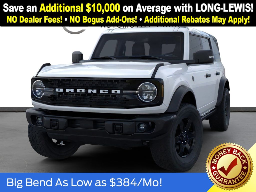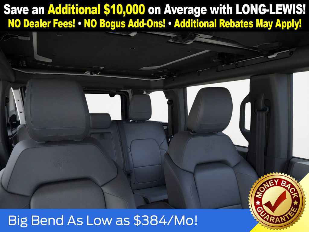 Oxford White 2025 Ford Bronco Big Bend FCT 4WD 7-Speed Manual 2.3L EcoBoost I-4 4-Wheel Disc Brakes, 7 Speakers, ABS brakes, Air Conditioning, Alloy wheels, AM/FM radio: SiriusXM with 360L, AM/FM Stereo, Auto High-beam Headlights, Auxiliary Switches, Black Appearance Package, Black Diamond Package, Black Molded-In-Color Door Handles, Black Molded-In-Color Fender Flares, Black Molded-In-Color Sideview Mirror Caps, Black-Painted Molded-In-Color Grille, Brake assist, Cloth Bucket Seats, Compass, Delay-off headlights, Driver door bin, Driver vanity mirror, Dual front impact airbags, Dual front side impact airbags, Electronic Stability Control, Emergency communication system: 911 Assist, Exterior Parking Camera Rear, Front anti-roll bar, Front Bucket Seats, Front Center Armrest, Front License Plate Bracket, Front reading lights, Front wheel independent suspension, Fully automatic headlights, Hard Top Sound Deadening Headliner, Heated door mirrors, Illuminated entry, Integrated roll-over protection, Leather Shift Knob, LED Fog Lamps, Low tire pressure warning, Occupant sensing airbag, Outside temperature display, Overhead airbag, Overhead console, Panic alarm, Passenger door bin, Passenger vanity mirror, Powder Coated Steel Front & Rear Bumpers, Power door mirrors, Power steering, Power windows, Radio data system, Rear-Window Defroster & Washer, Remote keyless entry, Rock Rails, Security system, Shadow Black Painted Hard Top, SiriusXM w/360L, Speed control, Split folding rear seat, Steering wheel mounted audio controls, SYNC 4, Tachometer, Telescoping steering wheel, Tilt steering wheel, Traction control, Trip computer, Variably intermittent wipers, Washout Capable Rubberized Flooring, Wheels: 17" Black High Gloss Painted Aluminum, Wheels: 17" Carbonized Gray-Painted Aluminum.