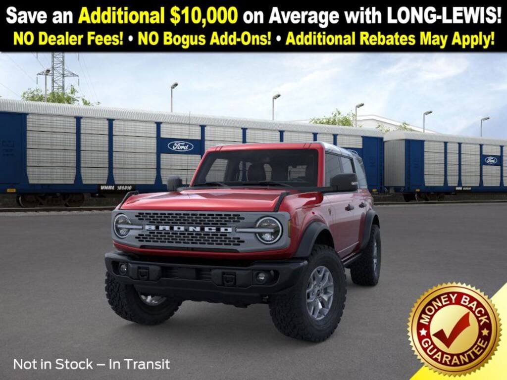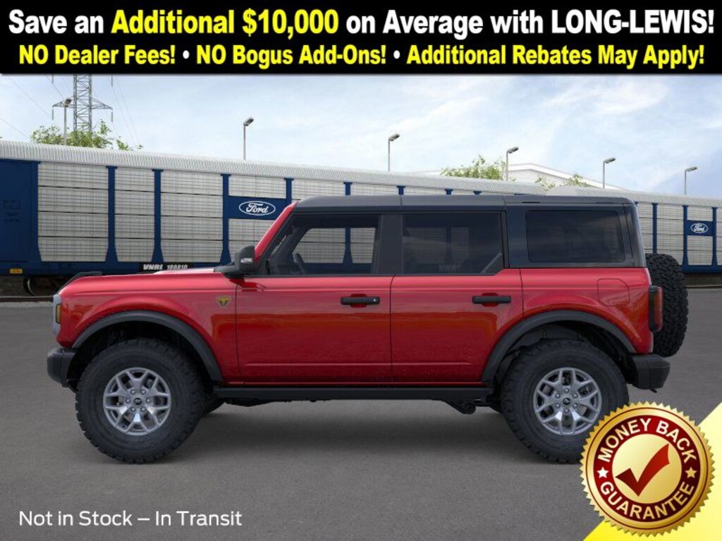 Dealer Discount of $3,727 off MSRP Ruby Red Metallic Tinted Clearcoat 2025 Ford Bronco Badlands 4WD 10-Speed Automatic 2.7L EcoBoost V6 4-Wheel Disc Brakes, 4.7 Axle Ratio, 7 Speakers, ABS brakes, Air Conditioning, Alloy wheels, AM/FM radio: SiriusXM with 360L, AM/FM Stereo, Auto High-beam Headlights, Auto-dimming Rear-View mirror, Brake assist, Compass, Delay-off headlights, Driver door bin, Driver vanity mirror, Dual front impact airbags, Dual front side impact airbags, Electronic Stability Control, Emergency communication system: 911 Assist, Exterior Parking Camera Rear, Front anti-roll bar, Front Bucket Seats, Front Center Armrest, Front fog lights, Front License Plate Bracket, Front reading lights, Front wheel independent suspension, Fully automatic headlights, Hard Top Sound Deadening Headliner, Heated door mirrors, Heated front seats, Heated steering wheel, Illuminated entry, Integrated roll-over protection, Leather Shift Knob, Leather-Trimmed/Vinyl Bucket Seats, Low tire pressure warning, Marine Grade Vinyl Heated Bucket Seats, Occupant sensing airbag, Outside temperature display, Overhead airbag, Overhead console, Panic alarm, Passenger door bin, Passenger vanity mirror, Power door mirrors, Power steering, Power windows, Radio data system, Rear-Window Defroster & Washer, Remote keyless entry, Security system, Shadow Black Painted Hard Top, SiriusXM w/360L, Speed control, Split folding rear seat, Steering wheel mounted audio controls, SYNC 4, Tachometer, Telescoping steering wheel, Tilt steering wheel, Traction control, Trip computer, Variably intermittent wipers, Voltmeter, Wheels: 17" Carbonized Gray-Painted Aluminum. Price includes: $2000 - Retail Bonus Cash. Exp. 01/05/2026