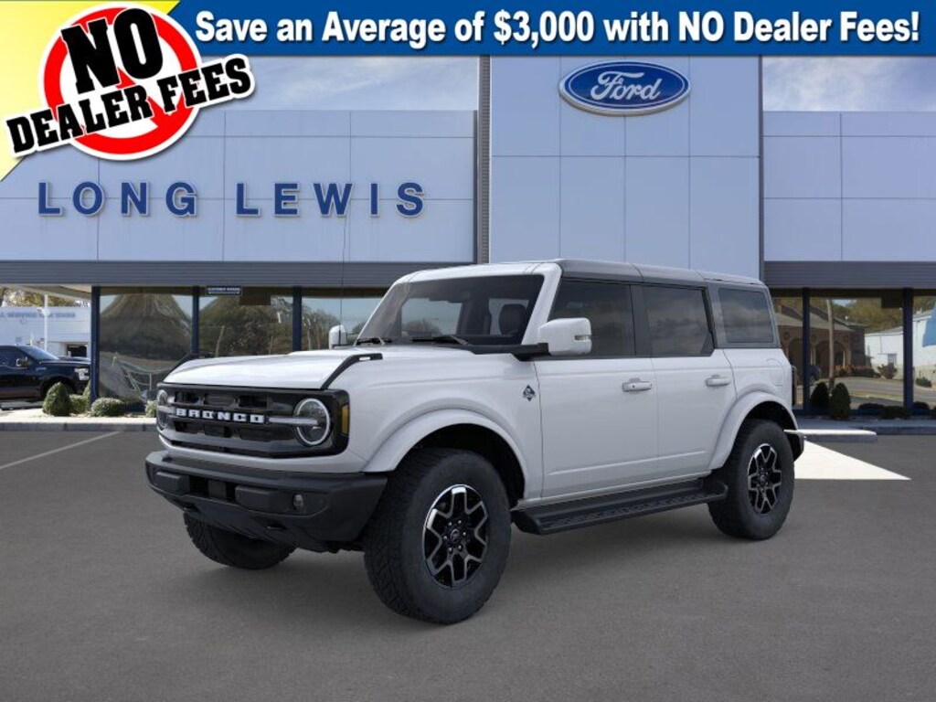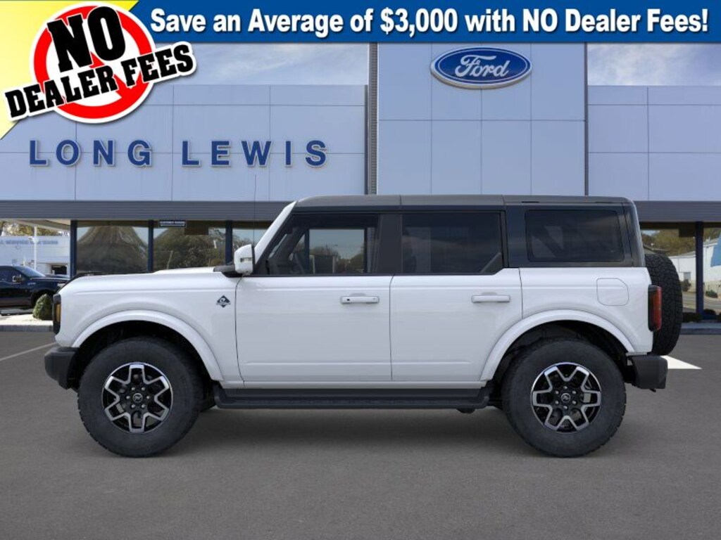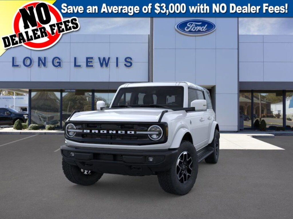 Oxford White 2025 Ford Bronco Outer Banks 4WD 10-Speed Automatic 2.7L EcoBoost V6 18" Bright Machined Aluminum Wheels, 3.73 Axle Ratio, 4-Wheel Disc Brakes, 7 Speakers, ABS brakes, Air Conditioning, Alloy wheels, AM/FM radio: SiriusXM with 360L, AM/FM Stereo, Auto High-beam Headlights, Auto-dimming Rear-View mirror, Automatic temperature control, Brake assist, Compass, Connected Navigation, Delay-off headlights, Driver door bin, Driver vanity mirror, Dual front impact airbags, Dual front side impact airbags, Electronic Stability Control, Emergency communication system: 911 Assist, Exterior Parking Camera Rear, Front anti-roll bar, Front Bucket Seats, Front Center Armrest, Front dual zone A/C, Front fog lights, Front License Plate Bracket, Front reading lights, Front wheel independent suspension, Fully automatic headlights, Hard Top Sound Deadening Headliner, Heated door mirrors, Heated front seats, Heated Leather-Trimmed/Vinyl Bucket Seats, Heated steering wheel, Illuminated entry, Integrated roll-over protection, Leather Shift Knob, Low tire pressure warning, Navigation system: Connected Navigation, Occupant sensing airbag, Outside temperature display, Overhead airbag, Overhead console, Panic alarm, Passenger door bin, Passenger vanity mirror, Power door mirrors, Power driver seat, Power passenger seat, Power steering, Power windows, Radio data system, Rear seat center armrest, Rear-Window Defroster & Washer, Remote keyless entry, Security system, Shadow Black-Painted Hard Top, SiriusXM w/360L, Speed control, Split folding rear seat, Steering wheel mounted audio controls, SYNC 4, Tachometer, Telescoping steering wheel, Tilt steering wheel, Traction control, Trip computer, Variably intermittent wipers, Voltmeter.