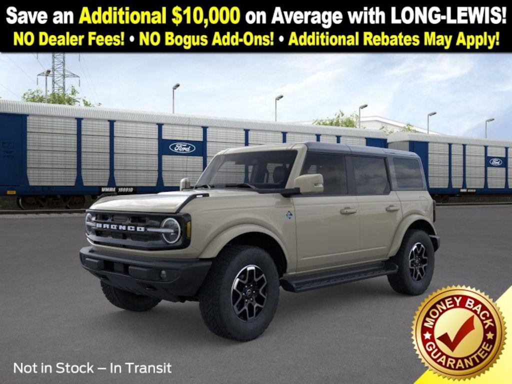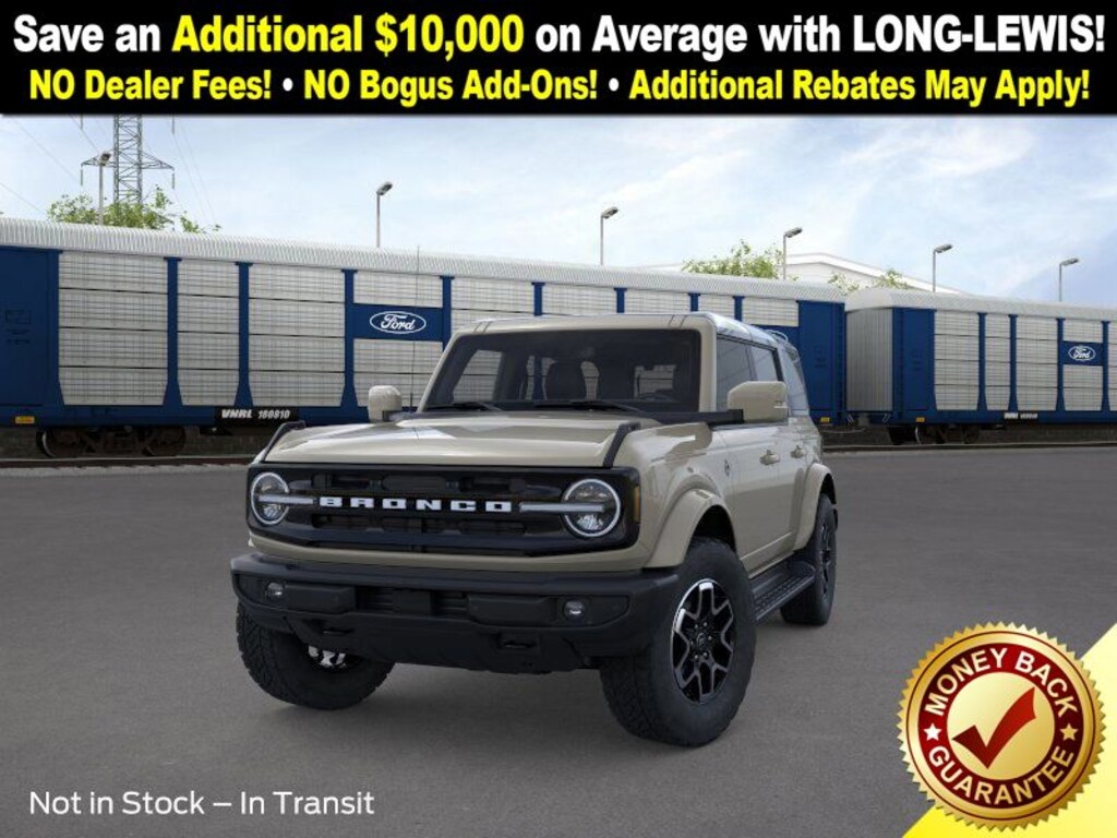 Dealer Discount of $3,166 off MSRP Desert Sand 2025 Ford Bronco Outer Banks NFT 4WD 10-Speed Automatic 2.7L EcoBoost V6 18" Bright Machined Aluminum Wheels, 3.73 Axle Ratio, 4-Wheel Disc Brakes, 7 Speakers, ABS brakes, Air Conditioning, Alloy wheels, AM/FM radio: SiriusXM with 360L, AM/FM Stereo, Auto High-beam Headlights, Auto-dimming Rear-View mirror, Automatic temperature control, Brake assist, Compass, Connected Navigation, Delay-off headlights, Driver door bin, Driver vanity mirror, Dual front impact airbags, Dual front side impact airbags, Electronic Stability Control, Emergency communication system: 911 Assist, Exterior Parking Camera Rear, Front anti-roll bar, Front Bucket Seats, Front Center Armrest, Front dual zone A/C, Front fog lights, Front License Plate Bracket, Front reading lights, Front wheel independent suspension, Fully automatic headlights, Hard Top Sound Deadening Headliner, Heated door mirrors, Heated front seats, Heated Leather-Trimmed/Vinyl Bucket Seats, Heated steering wheel, Illuminated entry, Integrated roll-over protection, Leather Shift Knob, Low tire pressure warning, Navigation system: Connected Navigation, Occupant sensing airbag, Outside temperature display, Overhead airbag, Overhead console, Panic alarm, Passenger door bin, Passenger vanity mirror, Power door mirrors, Power driver seat, Power passenger seat, Power steering, Power windows, Radio data system, Rear seat center armrest, Rear-Window Defroster & Washer, Remote keyless entry, Security system, Shadow Black-Painted Hard Top, SiriusXM w/360L, Speed control, Split folding rear seat, Steering wheel mounted audio controls, SYNC 4, Tachometer, Telescoping steering wheel, Tilt steering wheel, Traction control, Trip computer, Variably intermittent wipers, Voltmeter. Price includes: $2000 - Retail Bonus Cash. Exp. 01/05/2026