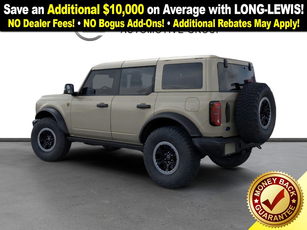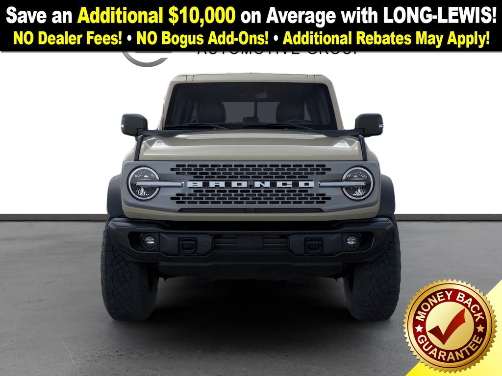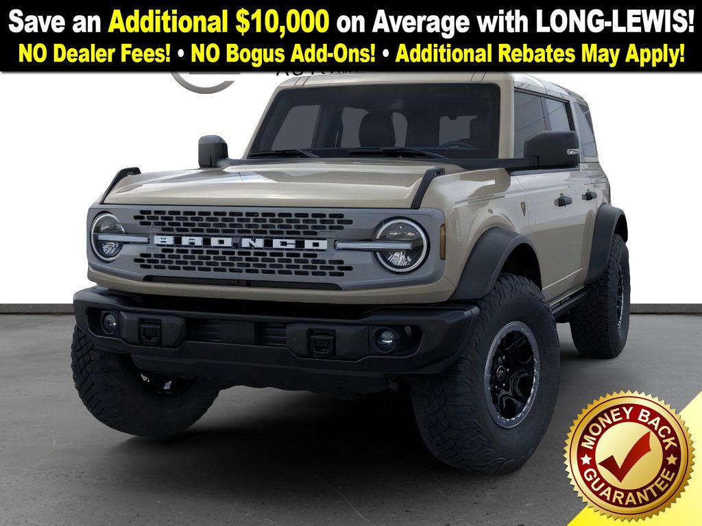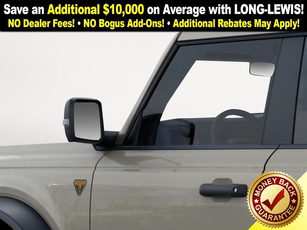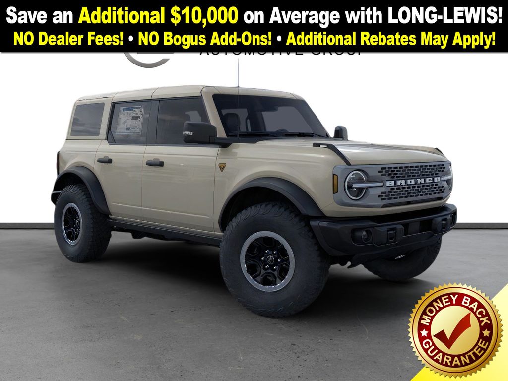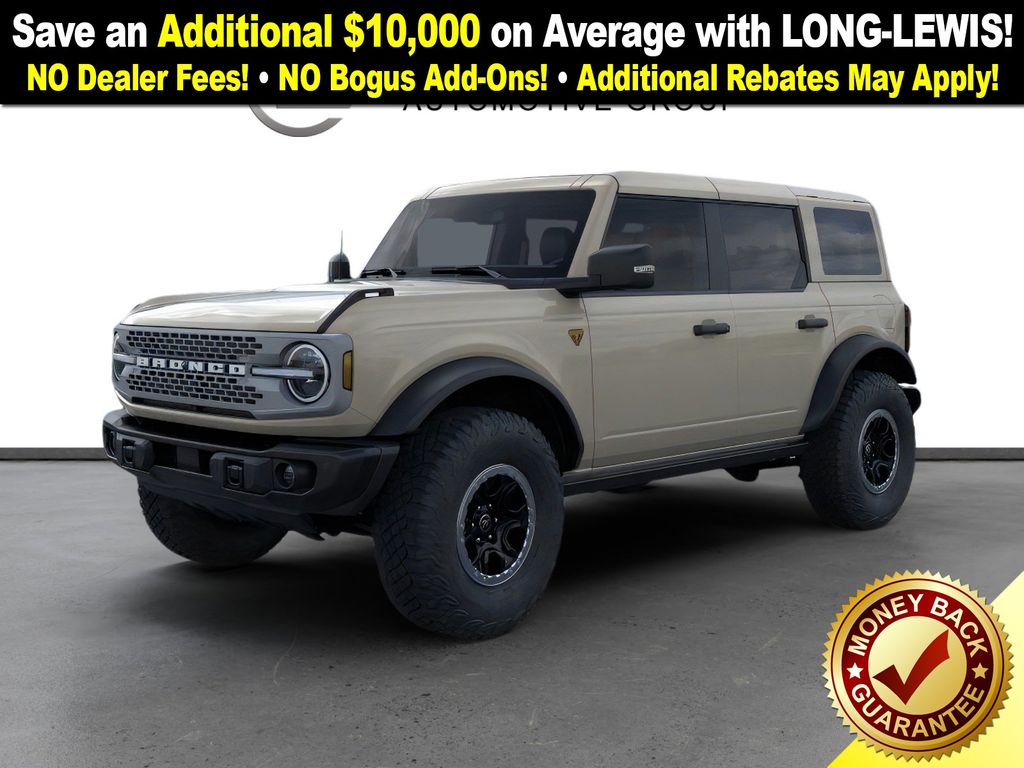 Desert Sand 2025 Ford Bronco Badlands FCT 4WD 10-Speed Automatic 2.7L EcoBoost V6 4-Wheel Disc Brakes, 7 Speakers, ABS brakes, Air Conditioning, Alloy wheels, AM/FM radio: SiriusXM with 360L, AM/FM Stereo, Auto High-beam Headlights, Auto-dimming Rear-View mirror, Body Color-Painted Hard Top, Brake assist, Compass, Delay-off headlights, Driver door bin, Driver vanity mirror, Dual front impact airbags, Dual front side impact airbags, Electronic Stability Control, Emergency communication system: 911 Assist, Exterior Parking Camera Rear, Front anti-roll bar, Front Bucket Seats, Front Center Armrest, Front fog lights, Front License Plate Bracket, Front reading lights, Front wheel independent suspension, Fully automatic headlights, Hard Top Sound Deadening Headliner, Heated door mirrors, Heated front seats, Heated steering wheel, High Clearance Fender Flares, High Clearance Suspension, Illuminated entry, Integrated roll-over protection, Internet access capable: FordPass Connect, Leather Shift Knob, Low tire pressure warning, Marine Grade Vinyl Heated Bucket Seats, Occupant sensing airbag, Outside temperature display, Overhead airbag, Overhead console, Panic alarm, Passenger door bin, Passenger vanity mirror, Position-Sensitive Bilstein Shock Absorbers, Power door mirrors, Power steering, Power windows, Radio data system, Rear-Window Defroster & Washer, Remote keyless entry, Sasquatch Package, Security system, SiriusXM w/360L, Speed control, Split folding rear seat, Steering wheel mounted audio controls, SYNC 4, Tachometer, Telescoping steering wheel, Tilt steering wheel, Traction control, Trip computer, Variably intermittent wipers, Voltmeter, Wheels: 17" Black High Gloss-Painted Aluminum (64X), Wheels: 17" Carbonized Gray Painted Aluminum, Wheels: 17" Carbonized Gray-Painted Aluminum.