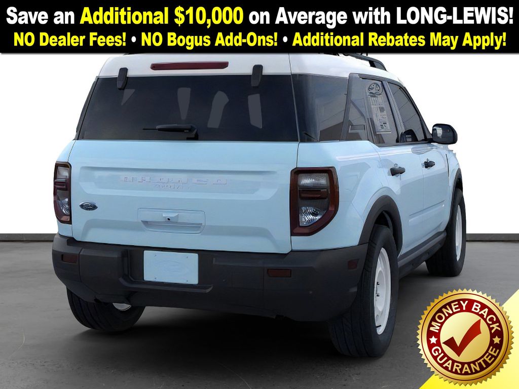 Robins Egg Blue 2025 Ford Bronco Sport Heritage fctp 4WD 8-Speed Automatic 1.5L EcoBoost 4-Wheel Disc Brakes, 6 Speakers, ABS brakes, Air Conditioning, Alloy wheels, AM/FM radio: SiriusXM, AM/FM Stereo, Auto High-beam Headlights, Automatic temperature control, Brake assist, Compass, Convenience Package, Delay-off headlights, Driver door bin, Driver vanity mirror, Dual front impact airbags, Dual front side impact airbags, Electronic Stability Control, Emergency communication system: SYNC 4 911 Assist, Four wheel independent suspension, Front anti-roll bar, Front Bucket Seats, Front Center Armrest, Front Driver/Passenger Seat Back Map Pockets, Front License Plate Bracket, Front reading lights, Fully automatic headlights, Heated 8-Way Power Driver's Seat, Heated door mirrors, Illuminated entry, Knee airbag, LED Fog Lamps, Low tire pressure warning, Occupant sensing airbag, Outside temperature display, Overhead airbag, Overhead console, Panic alarm, Passenger door bin, Passenger vanity mirror, Plaid Cloth Front Bucket Seats, Power door mirrors, Power steering, Power windows, Premium Wrapped Steering Wheel, Radio data system, Rear anti-roll bar, Rear Parking Sensors, Rear reading lights, Rear seat center armrest, Rear window defroster, Rear window wiper, Remote keyless entry, Security system, SiriusXM, Speed control, Speed-sensing steering, Speed-Sensitive Wipers, Split folding rear seat, Steering wheel mounted audio controls, SYNC 4 w/Enhanced Voice Recognition, Tachometer, Telescoping steering wheel, Tilt steering wheel, Traction control, Trip computer, Universal Garage Door Opener (UGDO), Variably intermittent wipers, Wheels: 17" Oxford White-Painted Aluminum.