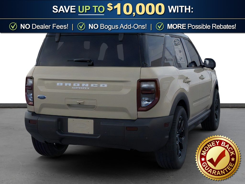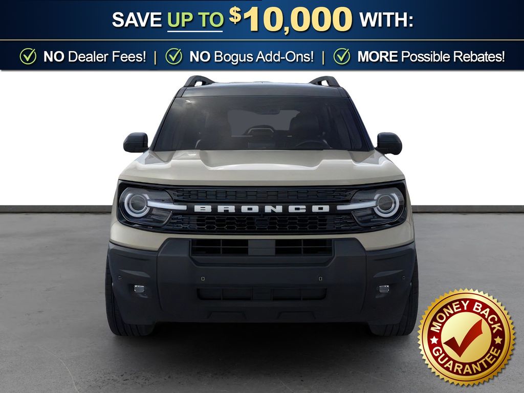Desert Sand 2025 Ford Bronco Sport Outer Banks fctp 4WD 8-Speed Automatic 1.5L EcoBoost 360-Degree Camera w/Trail & Split View, 4-Wheel Disc Brakes, 6 Speakers, ABS brakes, Air Conditioning, Alloy wheels, AM/FM radio: SiriusXM, AM/FM Stereo, Auto High-beam Headlights, Auto-dimming Rear-View mirror, Automatic temperature control, B&O Sound System by Bang & Olufsen, Brake assist, Compass, Connected Navigation, Delay-off headlights, Driver door bin, Driver vanity mirror, Dual front impact airbags, Dual front side impact airbags, Electronic Stability Control, Emergency communication system: SYNC 4 911 Assist, Four wheel independent suspension, Front anti-roll bar, Front Bucket Seats, Front Center Armrest, Front Driver/Passenger Seat Back Map Pockets, Front dual zone A/C, Front fog lights, Front License Plate Bracket, Front Parking Sensors, Front reading lights, Fully automatic headlights, Garage door transmitter, HD Radio, Heated door mirrors, Heated front seats, Heated steering wheel, Illuminated entry, Knee airbag, Low tire pressure warning, Memory seat, Occupant sensing airbag, Outer Banks Tech Package+, Outside temperature display, Overhead airbag, Overhead console, Panic alarm, Passenger door bin, Passenger vanity mirror, Power door mirrors, Power driver seat, Power passenger seat, Power steering, Power windows, Premium Trimmed Front Bucket Seats w/Ebony/Roast, Radio data system, Rain sensing wipers, Rear anti-roll bar, Rear Parking Sensors, Rear reading lights, Rear seat center armrest, Rear window defroster, Rear window wiper, Remote keyless entry, Reverse Brake Assist, Security system, SiriusXM, Speed control, Speed-sensing steering, Speed-Sensitive Wipers, Split folding rear seat, Steering wheel mounted audio controls, SYNC 4 w/Enhanced Voice Recognition, Tachometer, Telescoping steering wheel, Tilt steering wheel, Traction control, Trip computer, Variably intermittent wipers, Wheels: 18" Ebony Black-Painted Aluminum.