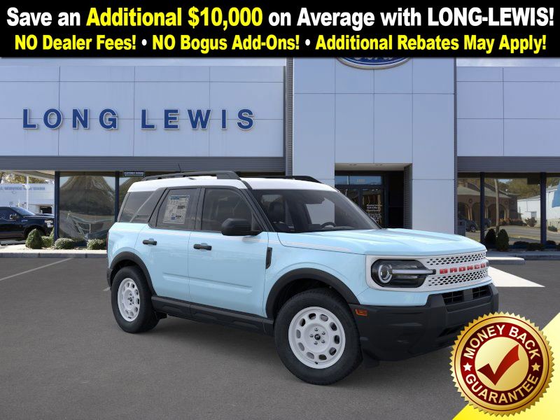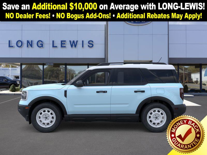 Robins Egg Blue 2025 Ford Bronco Sport Heritage FCT 4WD 8-Speed Automatic 1.5L EcoBoost 4-Wheel Disc Brakes, 6 Speakers, ABS brakes, Air Conditioning, Alloy wheels, AM/FM radio: SiriusXM, AM/FM Stereo, Auto High-beam Headlights, Automatic temperature control, Brake assist, Compass, Delay-off headlights, Driver door bin, Driver vanity mirror, Dual front impact airbags, Dual front side impact airbags, Electronic Stability Control, Emergency communication system: SYNC 4 911 Assist, Four wheel independent suspension, Front anti-roll bar, Front Bucket Seats, Front Center Armrest, Front Driver/Passenger Seat Back Map Pockets, Front License Plate Bracket, Front reading lights, Fully automatic headlights, Heated door mirrors, Illuminated entry, Knee airbag, Low tire pressure warning, Occupant sensing airbag, Outside temperature display, Overhead airbag, Overhead console, Panic alarm, Passenger door bin, Passenger vanity mirror, Plaid Cloth Front Bucket Seats, Power door mirrors, Power steering, Power windows, Radio data system, Rear anti-roll bar, Rear Parking Sensors, Rear reading lights, Rear seat center armrest, Rear window defroster, Rear window wiper, Remote keyless entry, Security system, SiriusXM, Speed control, Speed-sensing steering, Speed-Sensitive Wipers, Split folding rear seat, Steering wheel mounted audio controls, SYNC 4 w/Enhanced Voice Recognition, Tachometer, Telescoping steering wheel, Tilt steering wheel, Traction control, Trip computer, Variably intermittent wipers, Wheels: 17" Oxford White-Painted Aluminum.