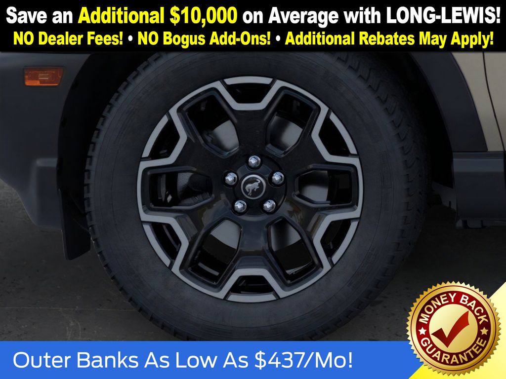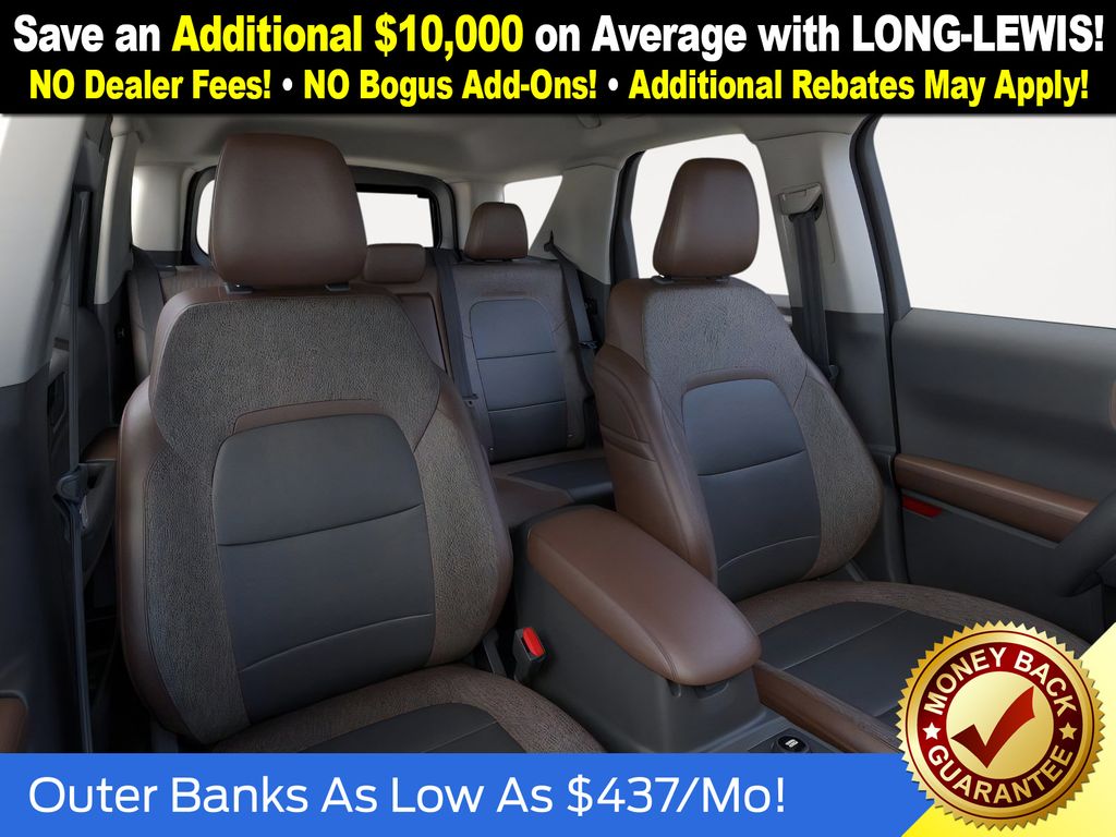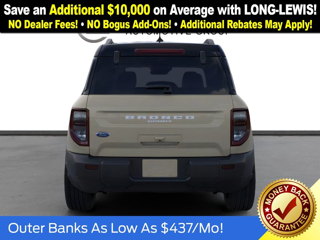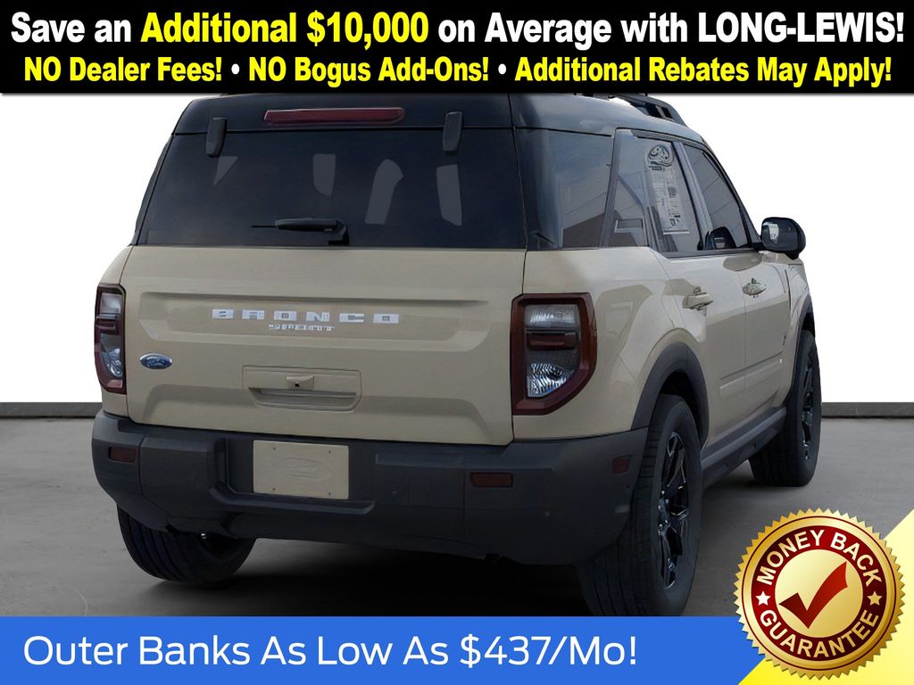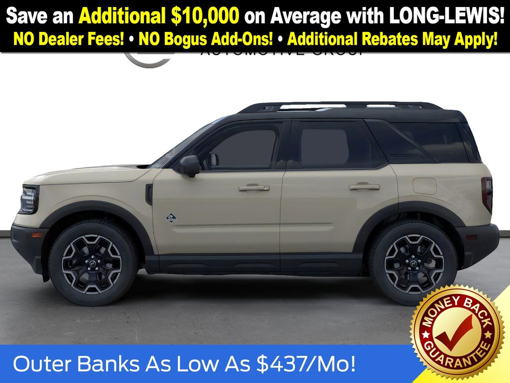 Desert Sand 2025 Ford Bronco Sport Outer Banks fctp 4WD 8-Speed Automatic 1.5L EcoBoost 360-Degree Camera w/Trail & Split View, 4-Wheel Disc Brakes, 6 Speakers, ABS brakes, Air Conditioning, Alloy wheels, AM/FM radio: SiriusXM, AM/FM Stereo, Auto High-beam Headlights, Auto-dimming Rear-View mirror, Automatic temperature control, B&O Sound System by Bang & Olufsen, Brake assist, Compass, Connected Navigation, Delay-off headlights, Driver door bin, Driver vanity mirror, Dual front impact airbags, Dual front side impact airbags, Electronic Stability Control, Emergency communication system: SYNC 4 911 Assist, Four wheel independent suspension, Front anti-roll bar, Front Bucket Seats, Front Center Armrest, Front Driver/Passenger Seat Back Map Pockets, Front dual zone A/C, Front fog lights, Front License Plate Bracket, Front Parking Sensors, Front reading lights, Fully automatic headlights, Garage door transmitter, HD Radio, Heated door mirrors, Heated front seats, Heated steering wheel, Illuminated entry, Knee airbag, Low tire pressure warning, Memory seat, Occupant sensing airbag, Outer Banks Tech Package+, Outside temperature display, Overhead airbag, Overhead console, Panic alarm, Passenger door bin, Passenger vanity mirror, Power door mirrors, Power driver seat, Power Moonroof, Power passenger seat, Power steering, Power windows, Premium Trimmed Front Bucket Seats w/Ebony/Roast, Radio data system, Rain sensing wipers, Rear anti-roll bar, Rear Parking Sensors, Rear reading lights, Rear seat center armrest, Rear window defroster, Rear window wiper, Remote keyless entry, Reverse Brake Assist, Security system, SiriusXM, Speed control, Speed-sensing steering, Speed-Sensitive Wipers, Split folding rear seat, Steering wheel mounted audio controls, SYNC 4 w/Enhanced Voice Recognition, Tachometer, Telescoping steering wheel, Tilt steering wheel, Traction control, Trip computer, Variably intermittent wipers, Wheels: 18" Ebony Black-Painted Aluminum.