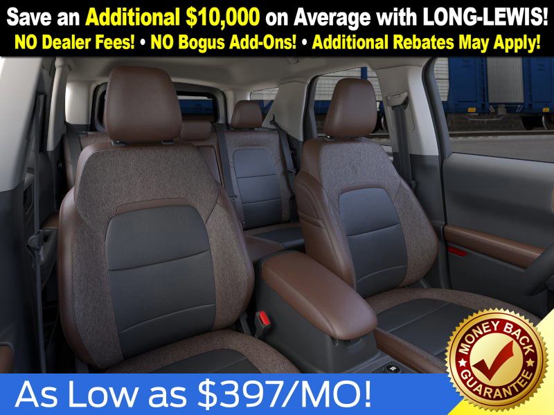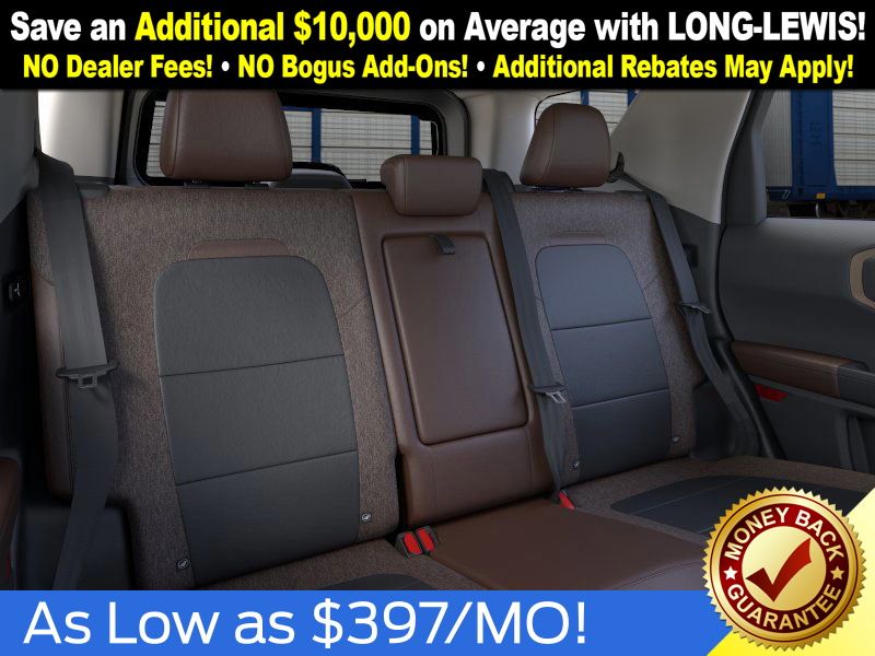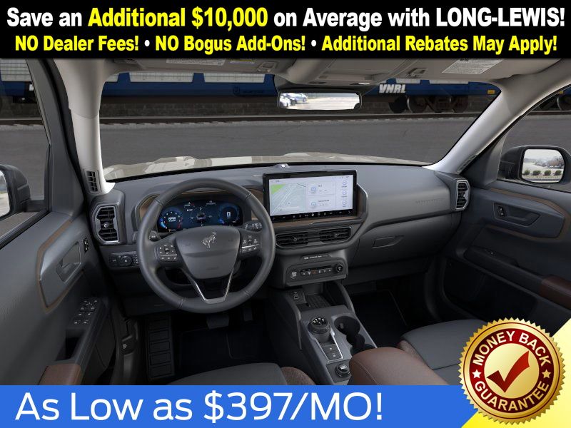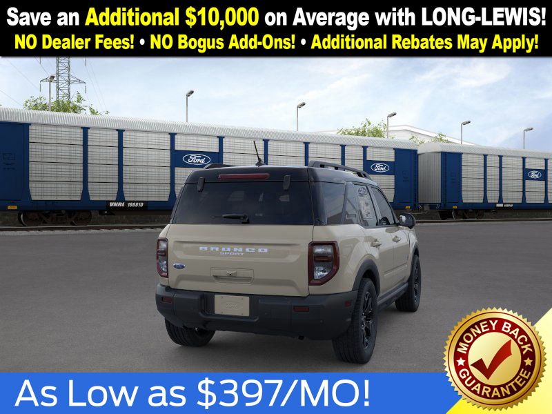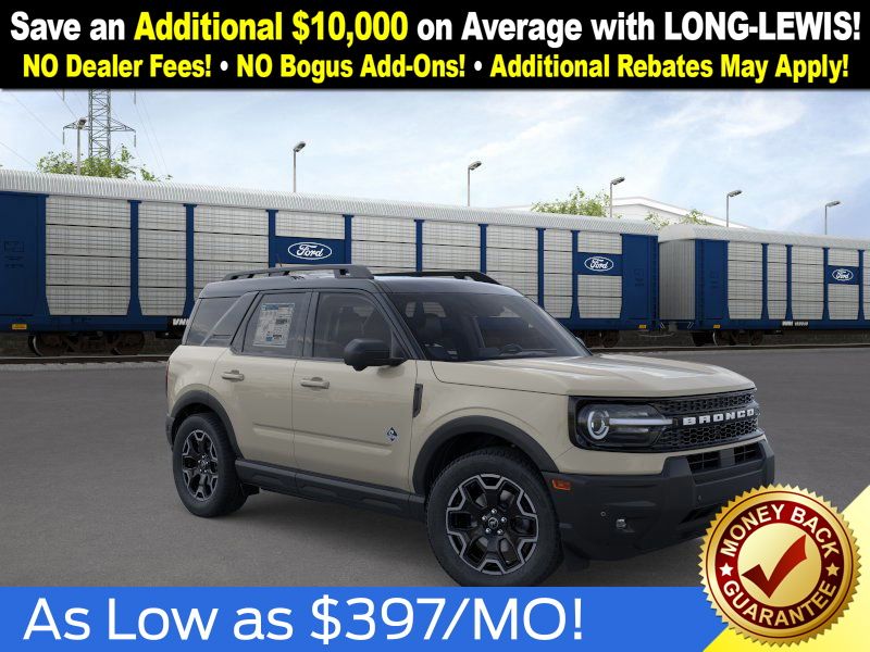 Desert Sand 2025 Ford Bronco Sport Outer Banks NFT 4WD 8-Speed Automatic 1.5L EcoBoost 360-Degree Camera w/Trail & Split View, 4-Wheel Disc Brakes, 6 Speakers, ABS brakes, Air Conditioning, Alloy wheels, AM/FM radio: SiriusXM, AM/FM Stereo, Auto High-beam Headlights, Auto-dimming Rear-View mirror, Automatic temperature control, B&O Sound System by Bang & Olufsen, Brake assist, Compass, Connected Navigation, Delay-off headlights, Driver door bin, Driver vanity mirror, Dual front impact airbags, Dual front side impact airbags, Electronic Stability Control, Emergency communication system: SYNC 4 911 Assist, Four wheel independent suspension, Front anti-roll bar, Front Bucket Seats, Front Center Armrest, Front Driver/Passenger Seat Back Map Pockets, Front dual zone A/C, Front fog lights, Front License Plate Bracket, Front Parking Sensors, Front reading lights, Fully automatic headlights, Garage door transmitter, HD Radio, Heated door mirrors, Heated front seats, Heated steering wheel, Illuminated entry, Knee airbag, Low tire pressure warning, Memory seat, Occupant sensing airbag, Outer Banks Tech Package+, Outside temperature display, Overhead airbag, Overhead console, Panic alarm, Passenger door bin, Passenger vanity mirror, Power door mirrors, Power driver seat, Power passenger seat, Power steering, Power windows, Premium Trimmed Front Bucket Seats w/Ebony/Roast, Radio data system, Rain sensing wipers, Rear anti-roll bar, Rear Parking Sensors, Rear reading lights, Rear seat center armrest, Rear window defroster, Rear window wiper, Remote keyless entry, Reverse Brake Assist, Security system, SiriusXM, Speed control, Speed-sensing steering, Speed-Sensitive Wipers, Split folding rear seat, Steering wheel mounted audio controls, SYNC 4 w/Enhanced Voice Recognition, Tachometer, Telescoping steering wheel, Tilt steering wheel, Traction control, Trip computer, Variably intermittent wipers, Wheels: 18" Ebony Black-Painted Aluminum.