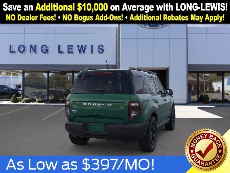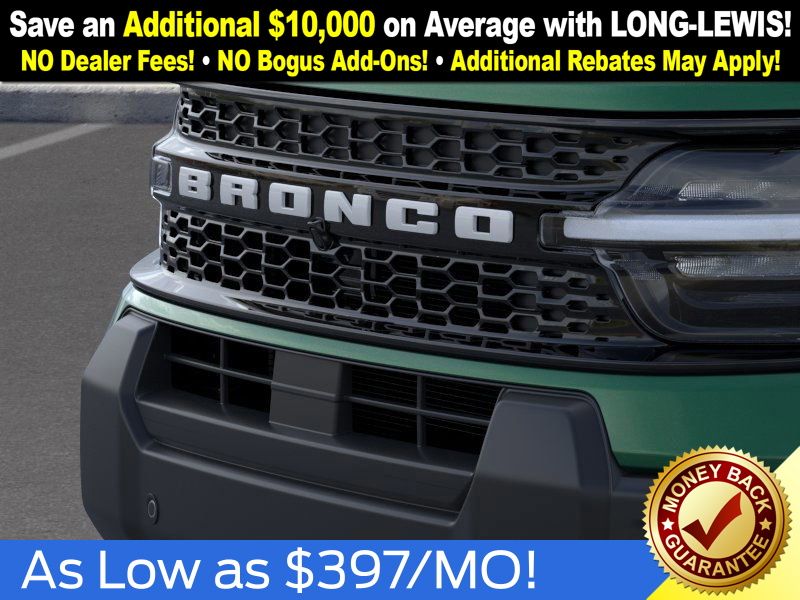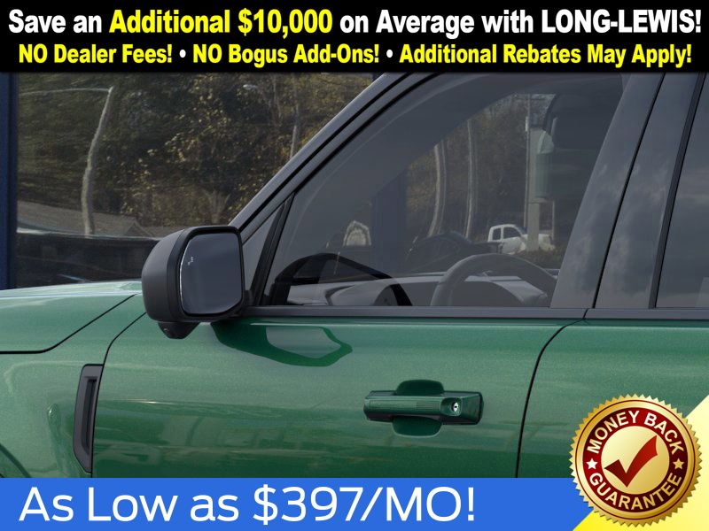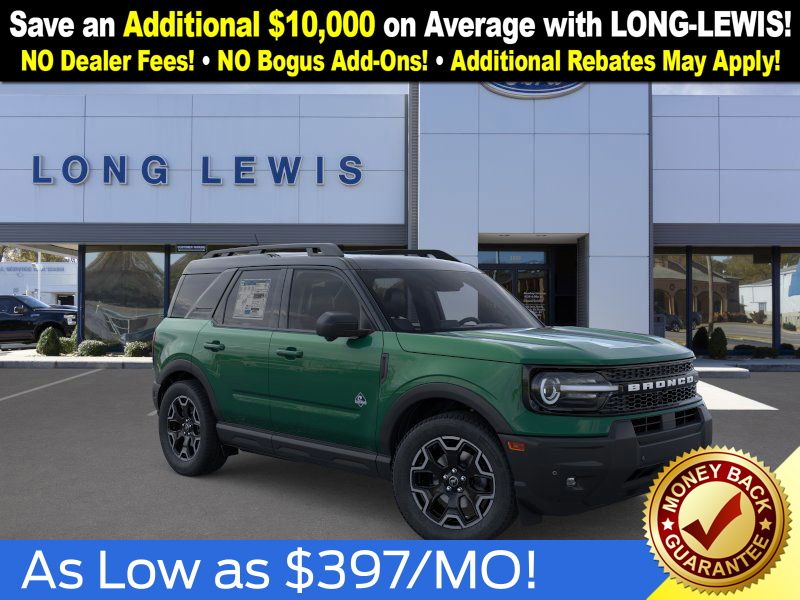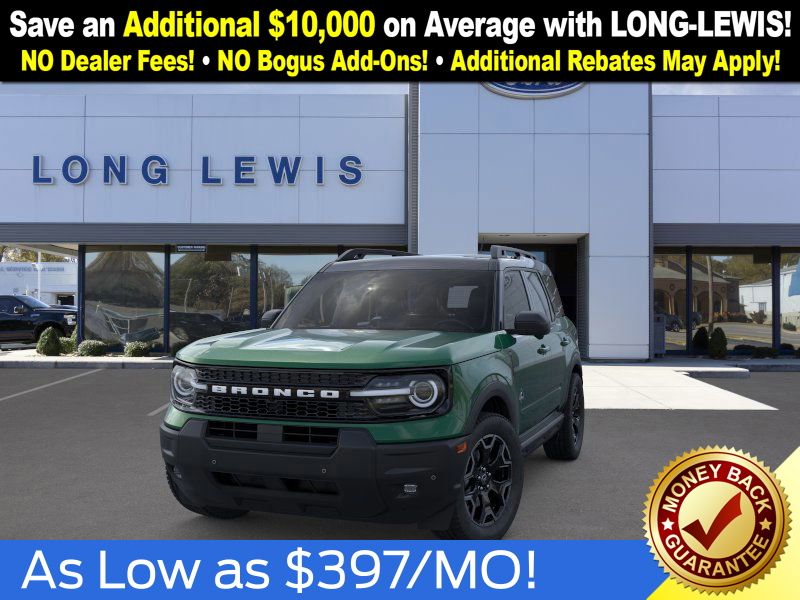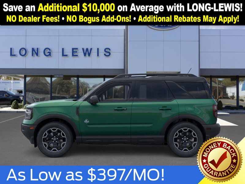 Eruption Green Metallic 2025 Ford Bronco Sport Outer Banks fctp 4WD 8-Speed Automatic 1.5L EcoBoost 4-Wheel Disc Brakes, 6 Speakers, ABS brakes, Air Conditioning, Alloy wheels, AM/FM radio: SiriusXM, AM/FM Stereo, Auto High-beam Headlights, Auto-dimming Rear-View mirror, Automatic temperature control, Brake assist, Compass, Delay-off headlights, Driver door bin, Driver vanity mirror, Dual front impact airbags, Dual front side impact airbags, Electronic Stability Control, Emergency communication system: SYNC 4 911 Assist, Four wheel independent suspension, Front anti-roll bar, Front Bucket Seats, Front Center Armrest, Front Driver/Passenger Seat Back Map Pockets, Front dual zone A/C, Front fog lights, Front reading lights, Fully automatic headlights, Garage door transmitter, Heated door mirrors, Heated front seats, Heated steering wheel, Illuminated entry, Knee airbag, Low tire pressure warning, Memory seat, Occupant sensing airbag, Outside temperature display, Overhead airbag, Overhead console, Panic alarm, Passenger door bin, Passenger vanity mirror, Power door mirrors, Power driver seat, Power passenger seat, Power steering, Power windows, Premium Trimmed Front Bucket Seats w/Ebony/Roast, Radio data system, Rain sensing wipers, Rear anti-roll bar, Rear Parking Sensors, Rear reading lights, Rear seat center armrest, Rear window defroster, Rear window wiper, Remote keyless entry, Security system, SiriusXM, Speed control, Speed-sensing steering, Speed-Sensitive Wipers, Split folding rear seat, Steering wheel mounted audio controls, SYNC 4 w/Enhanced Voice Recognition, Tachometer, Telescoping steering wheel, Tilt steering wheel, Traction control, Trip computer, Variably intermittent wipers, Wheels: 18" Ebony Black-Painted Aluminum.