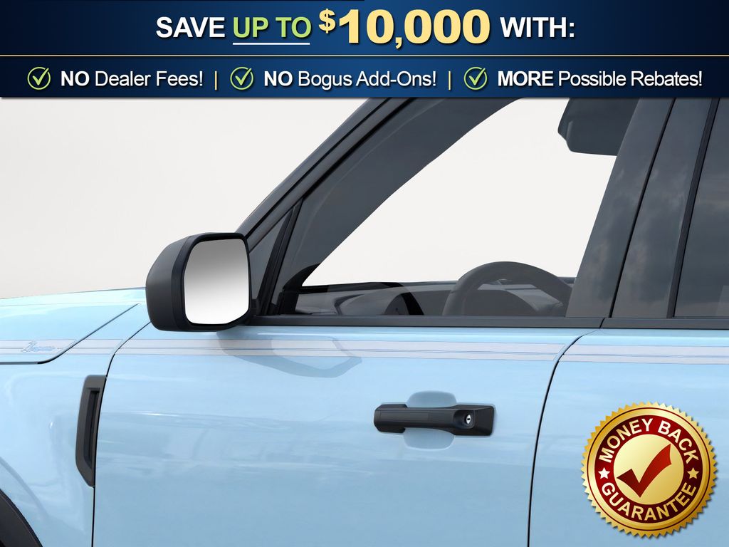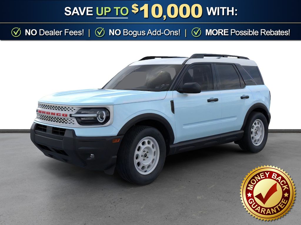 Robins Egg Blue 2025 Ford Bronco Sport Heritage fctp 4WD 8-Speed Automatic 1.5L EcoBoost 4-Wheel Disc Brakes, 6 Speakers, ABS brakes, Air Conditioning, Alloy wheels, AM/FM radio: SiriusXM, AM/FM Stereo, Auto High-beam Headlights, Automatic temperature control, Brake assist, Compass, Convenience Package, Delay-off headlights, Driver door bin, Driver vanity mirror, Dual front impact airbags, Dual front side impact airbags, Electronic Stability Control, Emergency communication system: SYNC 4 911 Assist, Four wheel independent suspension, Front anti-roll bar, Front Bucket Seats, Front Center Armrest, Front Driver/Passenger Seat Back Map Pockets, Front License Plate Bracket, Front reading lights, Fully automatic headlights, Heated 8-Way Power Driver's Seat, Heated door mirrors, Illuminated entry, Knee airbag, LED Fog Lamps, Low tire pressure warning, Occupant sensing airbag, Outside temperature display, Overhead airbag, Overhead console, Panic alarm, Passenger door bin, Passenger vanity mirror, Plaid Cloth Front Bucket Seats, Power door mirrors, Power Moonroof, Power steering, Power windows, Premium Wrapped Steering Wheel, Radio data system, Rear anti-roll bar, Rear Parking Sensors, Rear reading lights, Rear seat center armrest, Rear window defroster, Rear window wiper, Remote keyless entry, Security system, SiriusXM, Speed control, Speed-sensing steering, Speed-Sensitive Wipers, Split folding rear seat, Steering wheel mounted audio controls, SYNC 4 w/Enhanced Voice Recognition, Tachometer, Telescoping steering wheel, Tilt steering wheel, Traction control, Trip computer, Universal Garage Door Opener (UGDO), Variably intermittent wipers, Wheels: 17" Oxford White-Painted Aluminum.