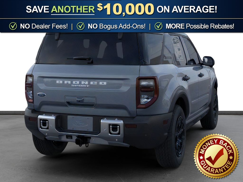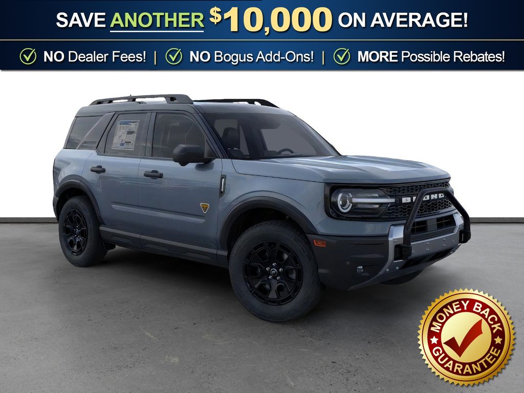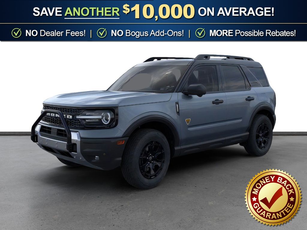 Azure Gray Metallic Tri-Coat 2025 Ford Bronco Sport Badlands fctp 4WD 8-Speed Automatic EcoBoost 2.0L I4 GTDi DOHC Turbocharged VCT 4-Wheel Disc Brakes, 6 Speakers, 850W Engine Cooling Fan, ABS brakes, Air Conditioning, Alloy wheels, AM/FM radio: SiriusXM, AM/FM Stereo, Auto High-beam Headlights, Auto-dimming Rear-View mirror, Automatic temperature control, Auxiliary Switches & Wiring, B&O Sound System by Bang & Olufsen, Badlands Tech Package, Brake assist, Brush Guard, Compass, Connected Navigation, Delay-off headlights, Driver door bin, Driver vanity mirror, Dual front impact airbags, Dual front side impact airbags, Electronic Stability Control, Emergency communication system: SYNC 4 911 Assist, Fender Tie Downs, Four wheel independent suspension, Front anti-roll bar, Front Bucket Seats, Front Center Armrest, Front fog lights, Front License Plate Bracket, Front reading lights, Fully automatic headlights, Garage door transmitter, HD Radio, Heated door mirrors, Heated front seats, Heated steering wheel, High Clearance Fender Flares, HOSS 3.0 Off-Road Suspension, Illuminated entry, Knee airbag, Leather Trimmed Front Bucket Seats, Low tire pressure warning, Memory seat, Occupant sensing airbag, Outside temperature display, Overhead airbag, Overhead console, Panic alarm, Passenger door bin, Passenger vanity mirror, Power door mirrors, Power driver seat, Power Moonroof, Power passenger seat, Power steering, Power windows, Radio data system, Rear anti-roll bar, Rear Black Bumpers, Rear reading lights, Rear seat center armrest, Rear window defroster, Rear window wiper, Recovery Hooks, Remote keyless entry, Sasquatch Badlands Package, Security system, SiriusXM, Speed control, Speed-sensing steering, Speed-Sensitive Wipers, Split folding rear seat, Steering wheel mounted audio controls, SYNC 4 w/Enhanced Voice Recognition, Tachometer, Telescoping steering wheel, Tilt steering wheel, Traction control, Trip computer, Variably intermittent wipers, Wheels: 17" Ebony Black-Painted Aluminum, Wheels: 17" Matte Black-Painted Aluminum.