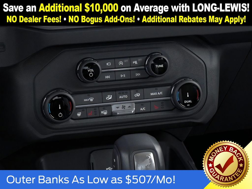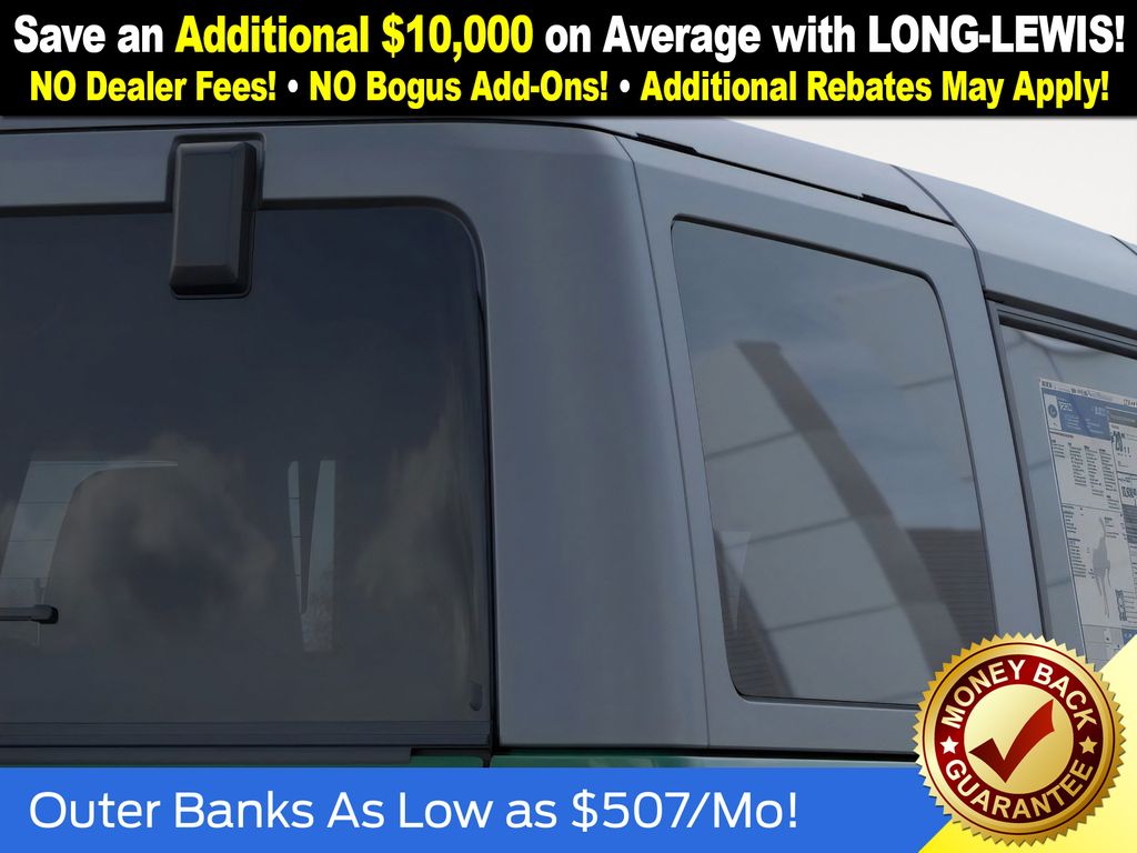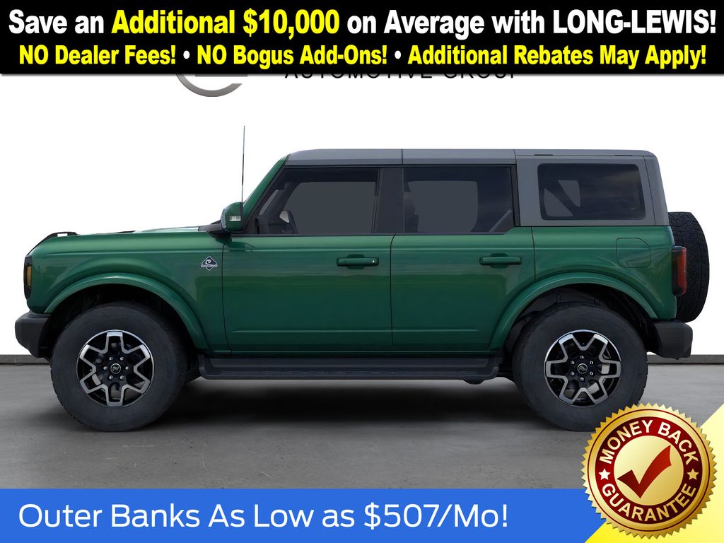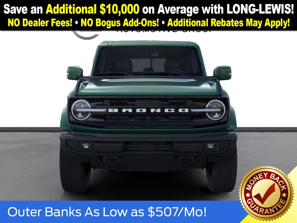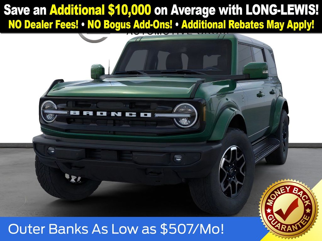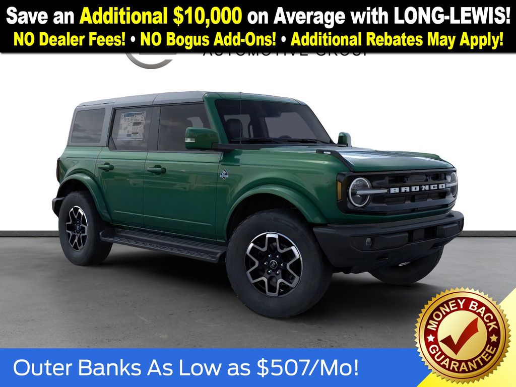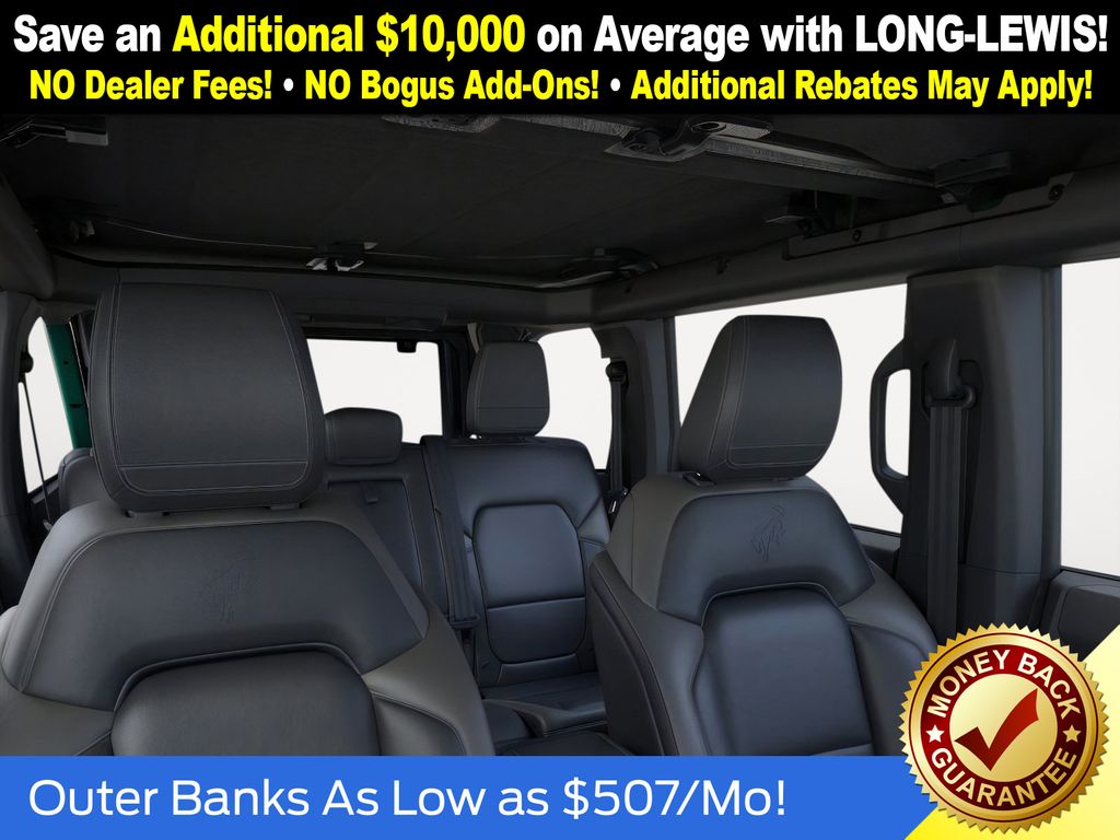 Eruption Green Metallic 2025 Ford Bronco Outer Banks FCT 4WD 10-Speed Automatic 2.7L EcoBoost V6 18" Bright Machined Aluminum Wheels, 3.73 Axle Ratio, 4-Wheel Disc Brakes, 7 Speakers, ABS brakes, Air Conditioning, Alloy wheels, AM/FM radio: SiriusXM with 360L, AM/FM Stereo, Auto High-beam Headlights, Auto-dimming Rear-View mirror, Automatic temperature control, Brake assist, Carbonized Gray Molded-In-Color Hard Top, Compass, Connected Navigation, Delay-off headlights, Driver door bin, Driver vanity mirror, Dual front impact airbags, Dual front side impact airbags, Electronic Stability Control, Emergency communication system: 911 Assist, Exterior Parking Camera Rear, Front anti-roll bar, Front Bucket Seats, Front Center Armrest, Front dual zone A/C, Front fog lights, Front License Plate Bracket, Front reading lights, Front wheel independent suspension, Fully automatic headlights, Hard Top Sound Deadening Headliner, Heated door mirrors, Heated front seats, Heated Leather-Trimmed/Vinyl Bucket Seats, Heated steering wheel, Illuminated entry, Integrated roll-over protection, Leather Shift Knob, Low tire pressure warning, Navigation system: Connected Navigation, Occupant sensing airbag, Outside temperature display, Overhead airbag, Overhead console, Panic alarm, Passenger door bin, Passenger vanity mirror, Power door mirrors, Power driver seat, Power passenger seat, Power steering, Power windows, Radio data system, Rear seat center armrest, Rear-Window Defroster & Washer, Remote keyless entry, Security system, SiriusXM w/360L, Speed control, Split folding rear seat, Steering wheel mounted audio controls, SYNC 4, Tachometer, Telescoping steering wheel, Tilt steering wheel, Traction control, Trip computer, Variably intermittent wipers, Voltmeter.