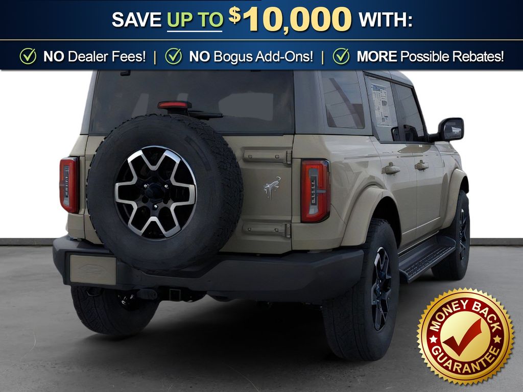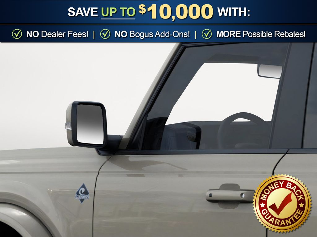 Desert Sand 2025 Ford Bronco Outer Banks fctp 4WD 10-Speed Automatic 2.7L EcoBoost V6 18" Bright Machined Aluminum Wheels, 3.73 Axle Ratio, 4-Wheel Disc Brakes, 7 Speakers, ABS brakes, Air Conditioning, Alloy wheels, AM/FM radio: SiriusXM with 360L, AM/FM Stereo, Auto High-beam Headlights, Auto-dimming Rear-View mirror, Automatic temperature control, Brake assist, Carbonized Gray Molded-In-Color Hard Top, Compass, Connected Navigation, Delay-off headlights, Driver door bin, Driver vanity mirror, Dual front impact airbags, Dual front side impact airbags, Electronic Stability Control, Emergency communication system: 911 Assist, Exterior Parking Camera Rear, Front anti-roll bar, Front Bucket Seats, Front Center Armrest, Front dual zone A/C, Front fog lights, Front License Plate Bracket, Front reading lights, Front wheel independent suspension, Fully automatic headlights, Hard Top Sound Deadening Headliner, Heated door mirrors, Heated front seats, Heated Leather-Trimmed/Vinyl Bucket Seats, Heated steering wheel, Illuminated entry, Integrated roll-over protection, Leather Shift Knob, Low tire pressure warning, Navigation system: Connected Navigation, Occupant sensing airbag, Outside temperature display, Overhead airbag, Overhead console, Panic alarm, Passenger door bin, Passenger vanity mirror, Power door mirrors, Power driver seat, Power passenger seat, Power steering, Power windows, Radio data system, Rear seat center armrest, Rear-Window Defroster & Washer, Remote keyless entry, Security system, SiriusXM w/360L, Speed control, Split folding rear seat, Steering wheel mounted audio controls, SYNC 4, Tachometer, Telescoping steering wheel, Tilt steering wheel, Traction control, Trip computer, Variably intermittent wipers, Voltmeter.
