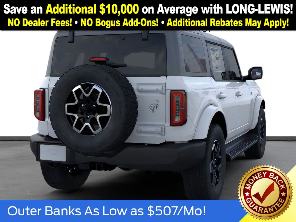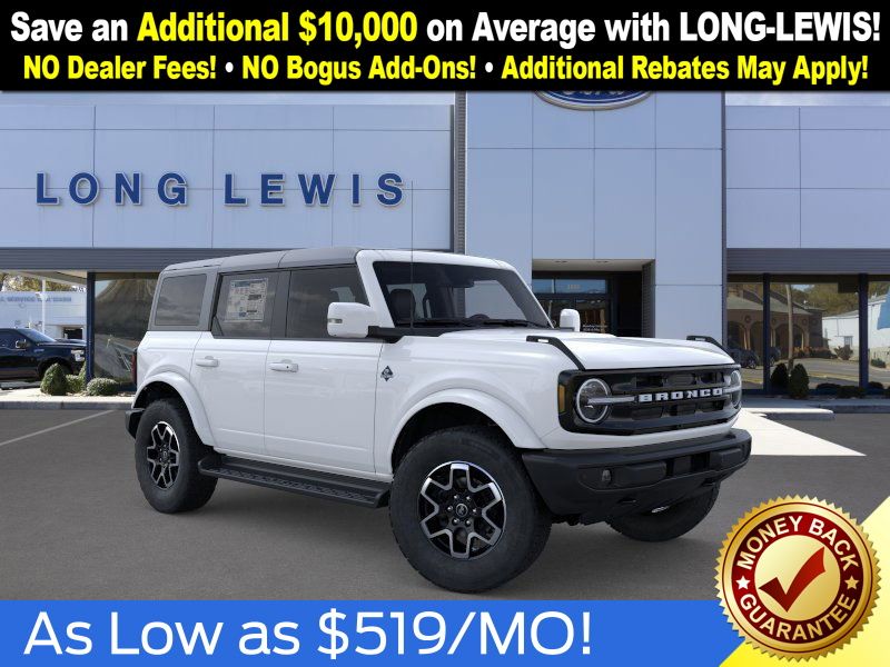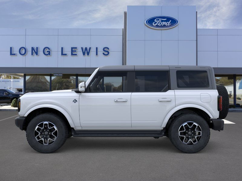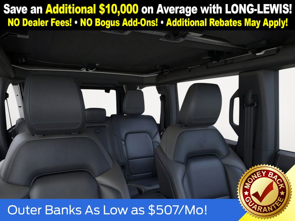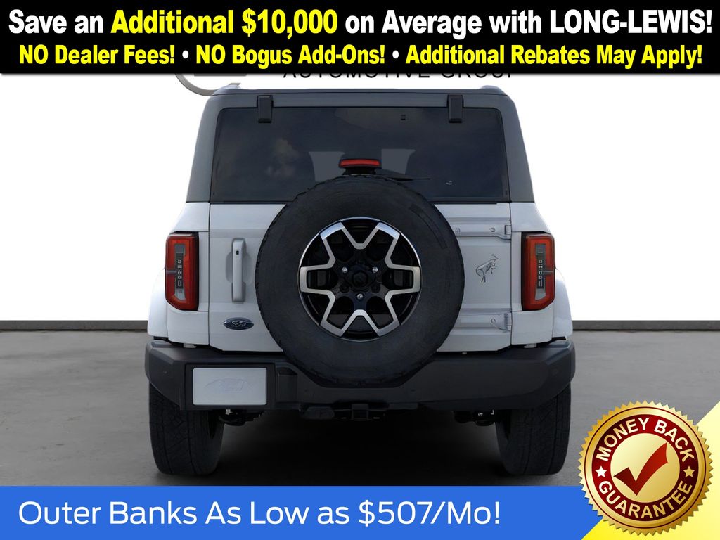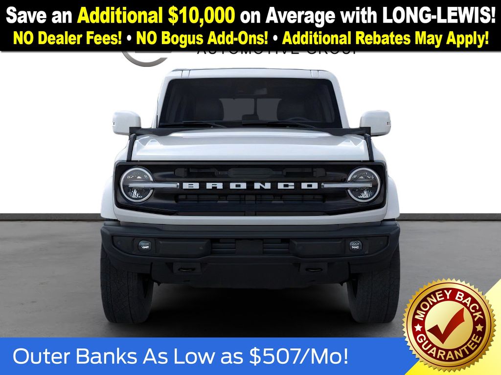 Oxford White 2025 Ford Bronco Outer Banks fctp 4WD 10-Speed Automatic 2.7L EcoBoost V6 18" Bright Machined Aluminum Wheels, 3.73 Axle Ratio, 4-Wheel Disc Brakes, 7 Speakers, ABS brakes, Air Conditioning, Alloy wheels, AM/FM radio: SiriusXM with 360L, AM/FM Stereo, Auto High-beam Headlights, Auto-dimming Rear-View mirror, Automatic temperature control, Brake assist, Compass, Connected Navigation, Delay-off headlights, Driver door bin, Driver vanity mirror, Dual front impact airbags, Dual front side impact airbags, Electronic Stability Control, Emergency communication system: 911 Assist, Exterior Parking Camera Rear, Front anti-roll bar, Front Bucket Seats, Front Center Armrest, Front dual zone A/C, Front fog lights, Front reading lights, Front wheel independent suspension, Fully automatic headlights, Heated door mirrors, Heated front seats, Heated Leather-Trimmed/Vinyl Bucket Seats, Heated steering wheel, Illuminated entry, Integrated roll-over protection, Leather Shift Knob, Low tire pressure warning, Navigation system: Connected Navigation, Occupant sensing airbag, Outside temperature display, Overhead airbag, Overhead console, Panic alarm, Passenger door bin, Passenger vanity mirror, Power door mirrors, Power driver seat, Power passenger seat, Power steering, Power windows, Radio data system, Rear seat center armrest, Remote keyless entry, Security system, SiriusXM w/360L, Speed control, Split folding rear seat, Steering wheel mounted audio controls, SYNC 4, Tachometer, Telescoping steering wheel, Tilt steering wheel, Traction control, Trip computer, Variably intermittent wipers, Voltmeter.