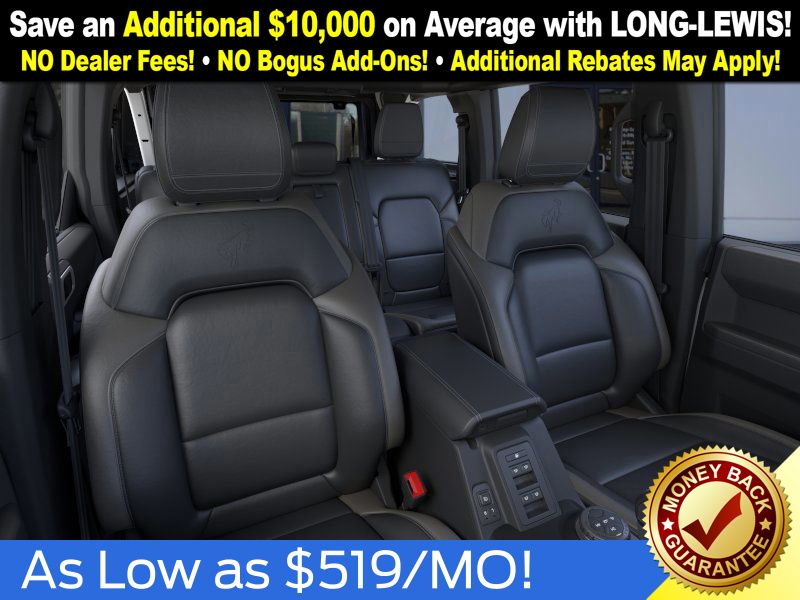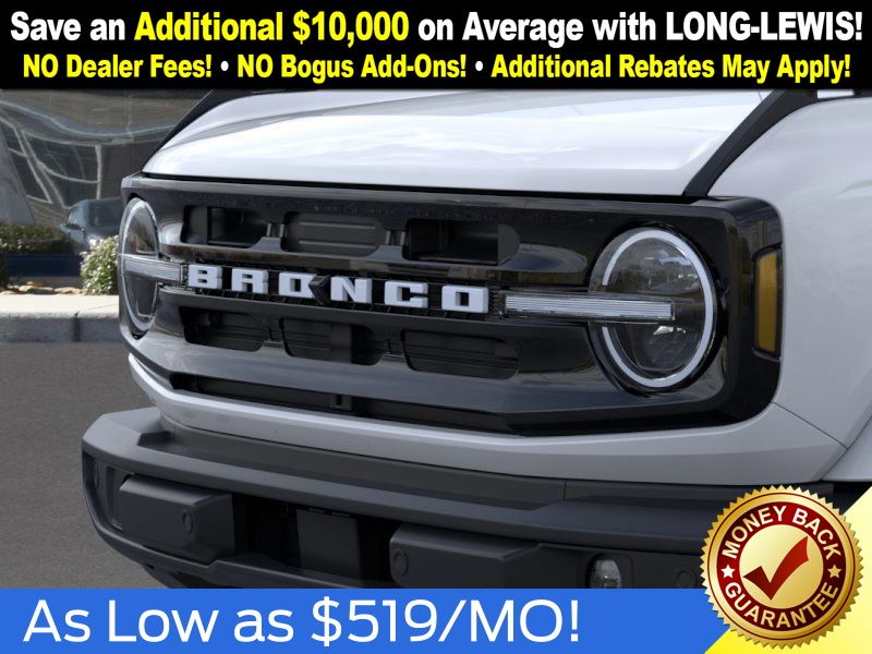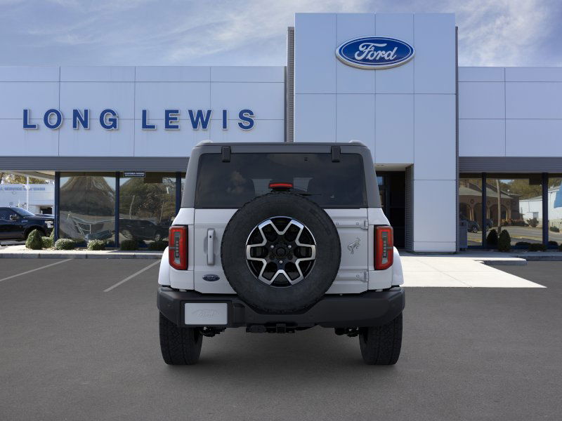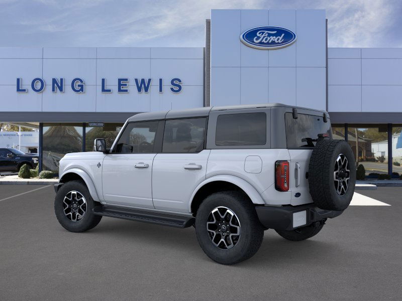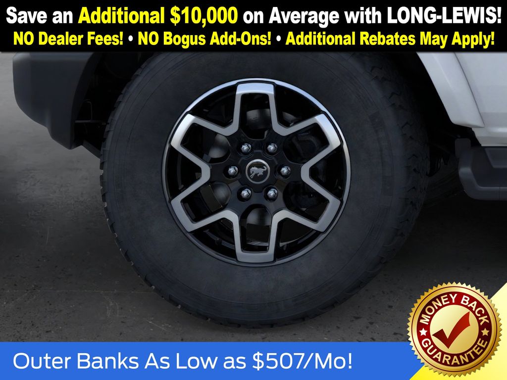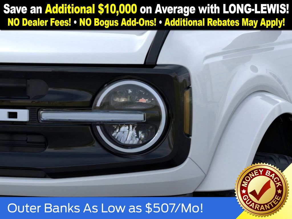 Oxford White 2025 Ford Bronco Outer Banks fctp 4WD 10-Speed Automatic 2.7L EcoBoost V6 18" Bright Machined Aluminum Wheels, 3.73 Axle Ratio, 4-Wheel Disc Brakes, 7 Speakers, ABS brakes, Air Conditioning, Alloy wheels, AM/FM radio: SiriusXM with 360L, AM/FM Stereo, Auto High-beam Headlights, Auto-dimming Rear-View mirror, Automatic temperature control, Brake assist, Compass, Connected Navigation, Delay-off headlights, Driver door bin, Driver vanity mirror, Dual front impact airbags, Dual front side impact airbags, Electronic Stability Control, Emergency communication system: 911 Assist, Exterior Parking Camera Rear, Front anti-roll bar, Front Bucket Seats, Front Center Armrest, Front dual zone A/C, Front fog lights, Front reading lights, Front wheel independent suspension, Fully automatic headlights, Heated door mirrors, Heated front seats, Heated Leather-Trimmed/Vinyl Bucket Seats, Heated steering wheel, Illuminated entry, Integrated roll-over protection, Leather Shift Knob, Low tire pressure warning, Navigation system: Connected Navigation, Occupant sensing airbag, Outside temperature display, Overhead airbag, Overhead console, Panic alarm, Passenger door bin, Passenger vanity mirror, Power door mirrors, Power driver seat, Power passenger seat, Power steering, Power windows, Radio data system, Rear seat center armrest, Remote keyless entry, Security system, SiriusXM w/360L, Speed control, Split folding rear seat, Steering wheel mounted audio controls, SYNC 4, Tachometer, Telescoping steering wheel, Tilt steering wheel, Traction control, Trip computer, Variably intermittent wipers, Voltmeter.