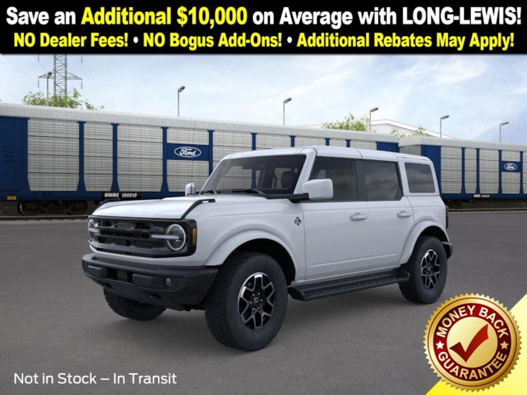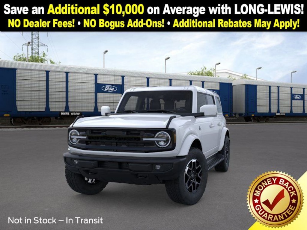Dealer Discount of $2,928 off MSRP Oxford White 2025 Ford Bronco Outer Banks 4WD 10-Speed Automatic 2.7L EcoBoost V6 18" Bright Machined Aluminum Wheels, 3.73 Axle Ratio, 4-Wheel Disc Brakes, 7 Speakers, ABS brakes, Air Conditioning, Alloy wheels, AM/FM radio: SiriusXM with 360L, AM/FM Stereo, Auto High-beam Headlights, Auto-dimming Rear-View mirror, Automatic temperature control, Brake assist, Compass, Connected Navigation, Delay-off headlights, Driver door bin, Driver vanity mirror, Dual front impact airbags, Dual front side impact airbags, Electronic Stability Control, Emergency communication system: 911 Assist, Exterior Parking Camera Rear, Front anti-roll bar, Front Bucket Seats, Front Center Armrest, Front dual zone A/C, Front fog lights, Front License Plate Bracket, Front reading lights, Front wheel independent suspension, Fully automatic headlights, Hard Top Sound Deadening Headliner, Heated door mirrors, Heated front seats, Heated Leather-Trimmed/Vinyl Bucket Seats, Heated steering wheel, Illuminated entry, Integrated roll-over protection, Leather Shift Knob, Low tire pressure warning, Navigation system: Connected Navigation, Occupant sensing airbag, Outside temperature display, Overhead airbag, Overhead console, Painted Hard Top, Panic alarm, Passenger door bin, Passenger vanity mirror, Power door mirrors, Power driver seat, Power passenger seat, Power steering, Power windows, Radio data system, Rear seat center armrest, Rear-Window Defroster & Washer, Remote keyless entry, Security system, SiriusXM w/360L, Speed control, Split folding rear seat, Steering wheel mounted audio controls, SYNC 4, Tachometer, Telescoping steering wheel, Tilt steering wheel, Traction control, Trip computer, Variably intermittent wipers, Voltmeter.