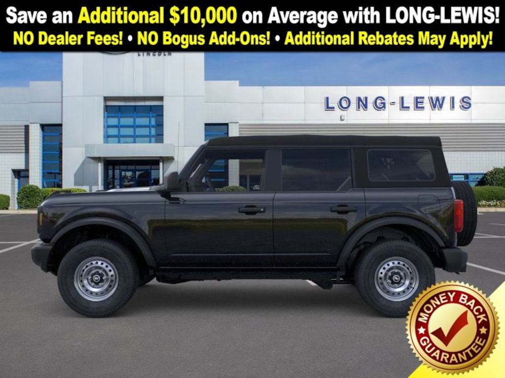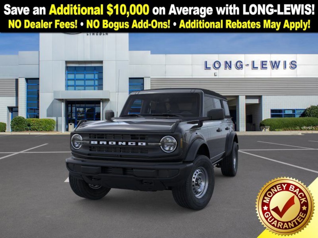 Dealer Discount of $1,465 off MSRP Shadow Black 2025 Ford Bronco FCT 4WD 7-Speed Manual 2.3L EcoBoost I-4 4-Wheel Disc Brakes, 4.46 Axle Ratio, 7 Speakers, ABS brakes, Air Conditioning, AM/FM radio: SiriusXM with 360L, AM/FM Stereo, Auto High-beam Headlights, Brake assist, Cloth Bucket Seats, Compass, Delay-off headlights, Driver door bin, Driver vanity mirror, Dual front impact airbags, Dual front side impact airbags, Electronic Stability Control, Emergency communication system: 911 Assist, Exterior Parking Camera Rear, Front anti-roll bar, Front Bucket Seats, Front Center Armrest, Front License Plate Bracket, Front reading lights, Front wheel independent suspension, Fully automatic headlights, Heated door mirrors, Illuminated entry, Integrated roll-over protection, Low tire pressure warning, Occupant sensing airbag, Outside temperature display, Overhead airbag, Overhead console, Panic alarm, Passenger door bin, Passenger vanity mirror, Power door mirrors, Power steering, Power windows, Radio data system, Remote keyless entry, Security system, SiriusXM w/360L, Speed control, Split folding rear seat, Steering wheel mounted audio controls, SYNC 4, Tachometer, Telescoping steering wheel, Tilt steering wheel, Traction control, Trip computer, Variably intermittent wipers, Wheels: 16" Bright Polished Silver-Painted Steel. Price includes: $2000 - Retail Bonus Cash. Exp. 01/05/2026