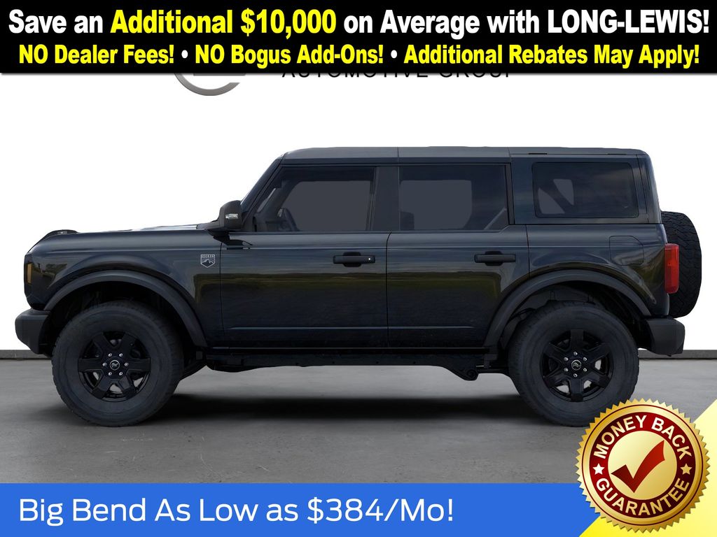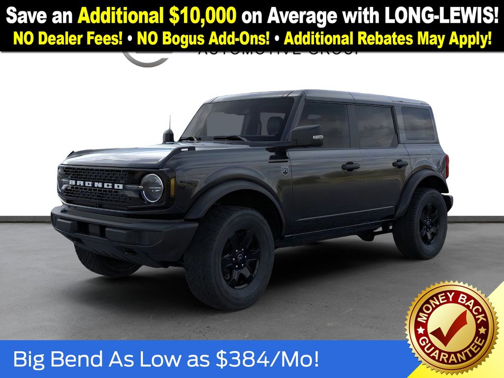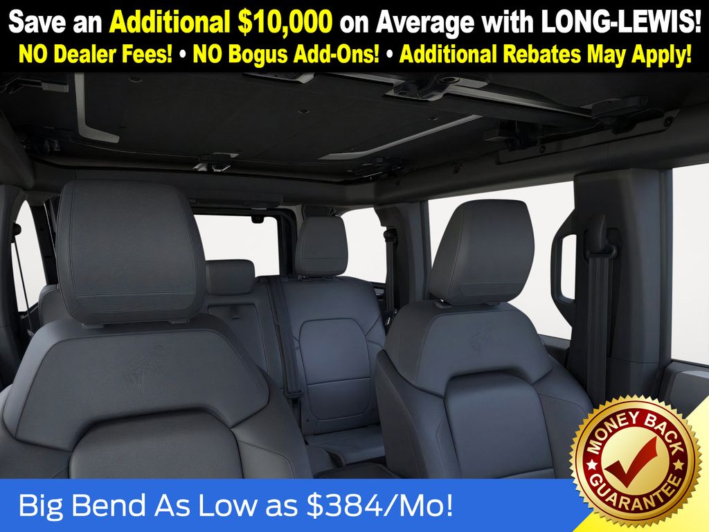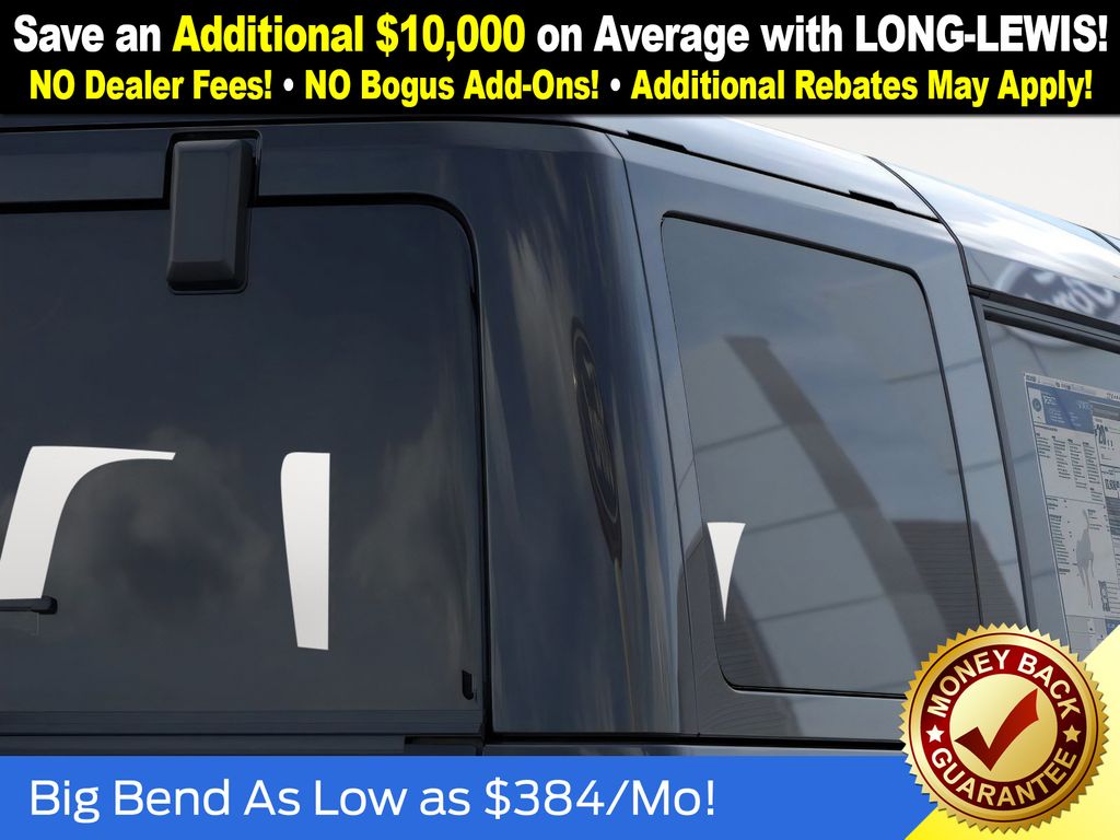 Shadow Black 2025 Ford Bronco Big Bend NFT 4WD 10-Speed Automatic 2.3L EcoBoost I-4 4-Wheel Disc Brakes, 4.46 Axle Ratio, 7 Speakers, ABS brakes, Air Conditioning, Alloy wheels, AM/FM radio: SiriusXM with 360L, AM/FM Stereo, Auto High-beam Headlights, Black Appearance Package, Black Molded-In-Color Door Handles, Black Molded-In-Color Fender Flares, Black Molded-In-Color Sideview Mirror Caps, Black-Painted Molded-In-Color Grille, Brake assist, Cloth Bucket Seats, Compass, Delay-off headlights, Driver door bin, Driver vanity mirror, Dual front impact airbags, Dual front side impact airbags, Electronic Stability Control, Emergency communication system: 911 Assist, Exterior Parking Camera Rear, Front anti-roll bar, Front Bucket Seats, Front Center Armrest, Front License Plate Bracket, Front reading lights, Front wheel independent suspension, Fully automatic headlights, Hard Top Sound Deadening Headliner, Heated door mirrors, Illuminated entry, Integrated roll-over protection, Internet access capable: FordPass Connect, Leather Shift Knob, Low tire pressure warning, Occupant sensing airbag, Outside temperature display, Overhead airbag, Overhead console, Panic alarm, Passenger door bin, Passenger vanity mirror, Power door mirrors, Power steering, Power windows, Radio data system, Rear-Window Defroster & Washer, Remote keyless entry, Security system, Shadow Black Painted Hard Top, SiriusXM w/360L, Speed control, Split folding rear seat, Steering wheel mounted audio controls, SYNC 4, Tachometer, Telescoping steering wheel, Tilt steering wheel, Traction control, Trip computer, Variably intermittent wipers, Wheels: 17" Carbonized Gray-Painted Aluminum.