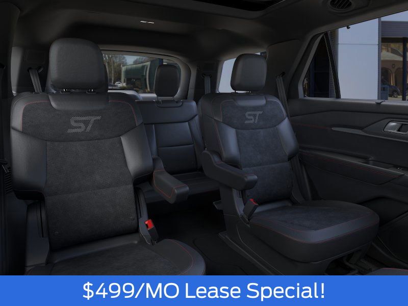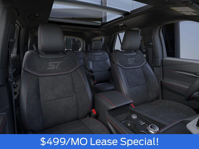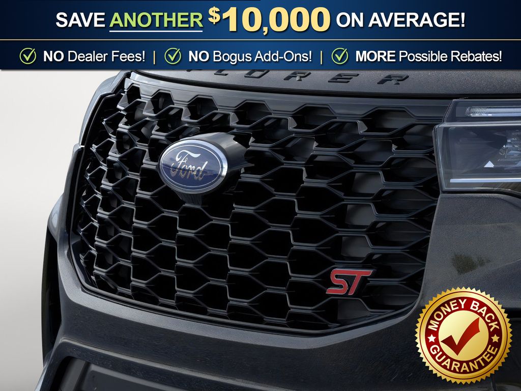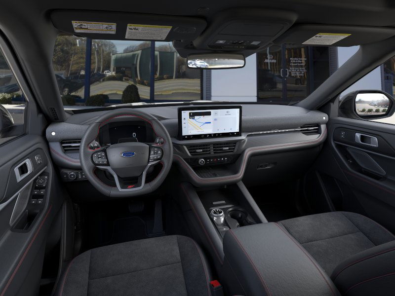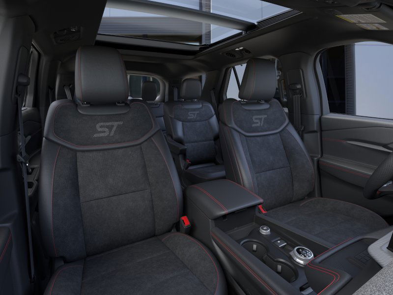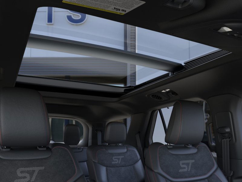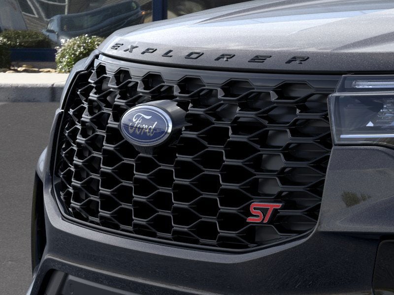 Agate Black Metallic 2025 Ford Explorer ST fctp 4WD 10-Speed Automatic 3.0L EcoBoost V6 4WD, 10 Speakers, 3.58 Non-Limited Slip Rear Axle, 3rd row seats: bench, 4-Wheel Disc Brakes, ABS brakes, Air Conditioning, Alloy wheels, Apple CarPlay/Android Auto, Auto High-beam Headlights, Auto-dimming door mirrors, Auto-dimming Rear-View mirror, Automatic temperature control, B&O Sound System by Bang & Olufsen, Brake assist, Bumpers: body-color, Compass, Delay-off headlights, Driver door bin, Driver vanity mirror, Dual front impact airbags, Dual front side impact airbags, Electronic Stability Control, Emergency communication system: 911 Assist, Exterior Parking Camera Rear, Four wheel independent suspension, Front anti-roll bar, Front Bucket Seats, Front Center Armrest, Front dual zone A/C, Front fog lights, Front License Plate Bracket, Front reading lights, Fully automatic headlights, Garage door transmitter, Heated door mirrors, Heated front seats, Heated rear seats, Heated steering wheel, Heated/Ventilated Miko Sport Captain's Chairs, Illuminated entry, Knee airbag, Leather steering wheel, Low tire pressure warning, Memory seat, Multicontour Seats w/Front Active Motion, Navigation System, Occupant sensing airbag, Outside temperature display, Overhead airbag, Overhead console, Panic alarm, Panoramic Vista Roof w/Power Shade, Passenger door bin, Passenger vanity mirror, Power door mirrors, Power driver seat, Power Liftgate, Power passenger seat, Power steering, Power windows, Radio: B&O Sound System by Bang & Olufsen, Rear air conditioning, Rear anti-roll bar, Rear reading lights, Rear window defroster, Rear window wiper, Remote keyless entry, SecuriCode Keyless Entry Keypad, Security system, Speed control, Speed-sensing steering, Speed-Sensitive Wipers, Split folding rear seat, Spoiler, Sport steering wheel, Steering wheel mounted audio controls, Sun and Sound Package, Tachometer, Telescoping steering wheel, Tilt steering wheel, Traction control, Trip computer, Turn signal indicator mirrors, Variably intermittent wipers, Ventilated front seats, Wheels: 21" Magnetite-Painted Aluminum, 4WD.