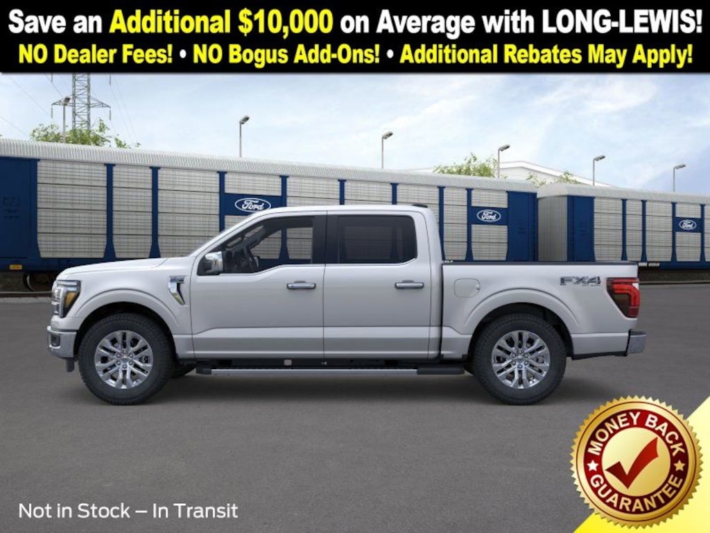 Iconic Silver Metallic 2025 Ford F-150 Lariat NFT 4WD 10-Speed Automatic 3.5L V6 EcoBoost 4WD, 4-Wheel Disc Brakes, 4x4 FX4 Off-Road Bodyside Decal, 8 Speakers, ABS brakes, ActiveX Trimmed Bucket Seats, Adjustable pedals, Air Conditioning, Alloy wheels, AM/FM radio: SiriusXM with 360L, Auto High-beam Headlights, Auto-dimming door mirrors, Auto-dimming Rear-View mirror, Automatic temperature control, Brake assist, Bumpers: chrome, Chrome wheels, Compass, Delay-off headlights, Driver door bin, Driver vanity mirror, Dual front impact airbags, Dual front side impact airbags, Electronic Stability Control, Emergency communication system: SYNC 4 911 Assist, Front anti-roll bar, Front Bucket Seats, Front Center Armrest, Front dual zone A/C, Front fog lights, Front reading lights, Front wheel independent suspension, Fully automatic headlights, FX4 Off-Road Package, Garage door transmitter, Heated door mirrors, Heated front seats, Heated steering wheel, Hill Descent Control, Illuminated entry, Low tire pressure warning, Memory seat, Monotube Rear Shocks, Navigation system: Connected Navigation, Occupant sensing airbag, Off-Road Tuned Front Shock Absorbers, Outside temperature display, Overhead airbag, Overhead console, Panic alarm, Passenger door bin, Passenger vanity mirror, Pedal memory, Power door mirrors, Power driver seat, Power passenger seat, Power steering, Power windows, Radio data system, Radio: B&O Sound System by Bang & Olufsen, Rain sensing wipers, Rear reading lights, Rear seat center armrest, Rear step bumper, Rear window defroster, Remote keyless entry, Rock Crawl Mode, Security system, Speed control, Split folding rear seat, Steering wheel mounted audio controls, SYNC 4 w/Enhanced Voice Recognition, Tachometer, Telescoping steering wheel, Tilt steering wheel, Tough Bed Spray-In Bedliner, Tow/Haul Package, Traction control, Tray Style Floor Liner w/o Carpet Mats, Trip computer, Turn signal indicator mirrors, Twin Panel Moonroof, Variably intermittent wipers, Ventilated front seats, Voltmeter, Wheel Well Liner, Wheels: 18" Chrome-Like PVD, 4WD.
