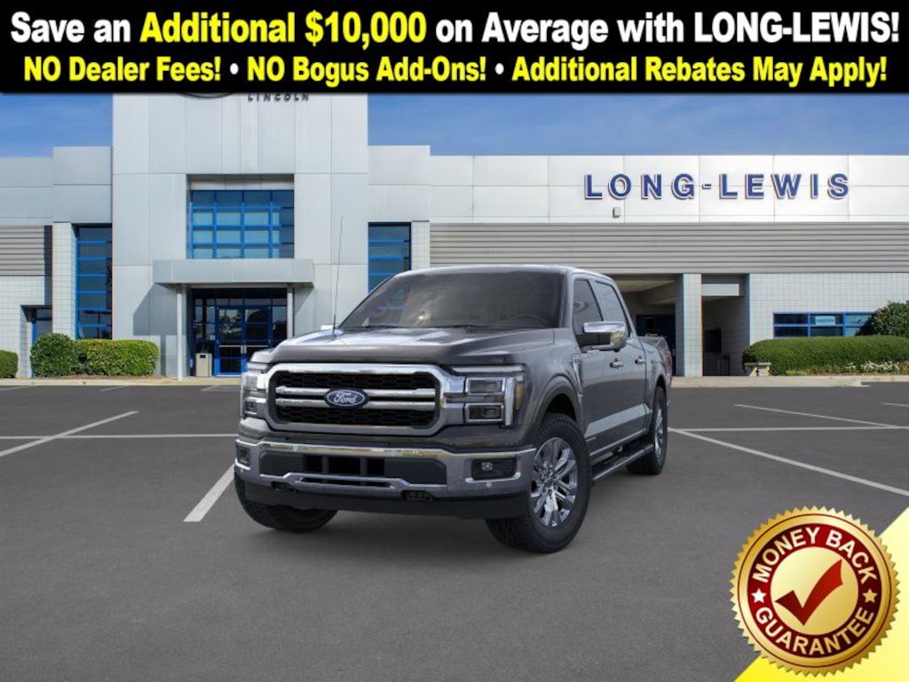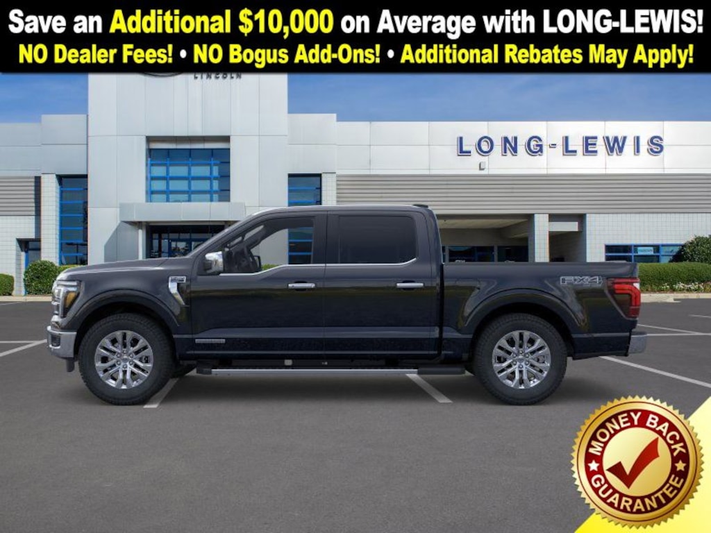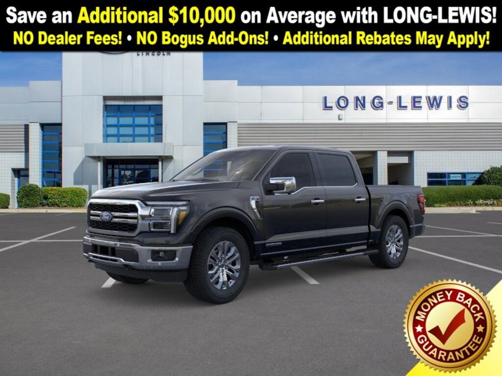 Dealer Discount of $8,840 off MSRP Agate Black Metallic 2025 Ford F-150 Lariat fctp 4WD 10-Speed Automatic 3.5L PowerBoost Full-Hybrid V6 3.5L PowerBoost Full-Hybrid V6, 4WD, 4 Pickup Box Tie-Down Plates, 4-Wheel Disc Brakes, 4x4 FX4 Off-Road Bodyside Decal, 6" Extended Running Boards, 8 Speakers, ABS brakes, ActiveX Trimmed Bucket Seats, Adjustable pedals, Air Conditioning, Alloy wheels, AM/FM radio: SiriusXM with 360L, Auto High-beam Headlights, Auto-dimming door mirrors, Auto-dimming Rear-View mirror, Automatic temperature control, Bed Utility Package, Brake assist, Bumpers: chrome, Chrome wheels, Compass, Delay-off headlights, Driver door bin, Driver vanity mirror, Dual front impact airbags, Dual front side impact airbags, Electronic Stability Control, Emergency communication system: SYNC 4 911 Assist, Equipment Group 502A High, Front anti-roll bar, Front Bucket Seats, Front Center Armrest, Front dual zone A/C, Front fog lights, Front License Plate Bracket, Front reading lights, Front wheel independent suspension, Fully automatic headlights, FX4 Off-Road Package, Garage door transmitter, Heated door mirrors, Heated front seats, Heated steering wheel, Hill Descent Control, Illuminated entry, LED Box Lighting, Low tire pressure warning, Memory seat, Monotube Rear Shocks, Navigation system: Connected Navigation, Occupant sensing airbag, Off-Road Tuned Front Shock Absorbers, Outside temperature display, Overhead airbag, Overhead console, Panic alarm, Passenger door bin, Passenger vanity mirror, Pedal memory, Power door mirrors, Power driver seat, Power passenger seat, Power steering, Power Tailgate, Power windows, Pro Access Tailgate, Pro Power Onboard - 7.2KW, Radio data system, Radio: B&O Sound System by Bang & Olufsen, Rain sensing wipers, Rear reading lights, Rear seat center armrest, Rear step bumper, Rear window defroster, Remote keyless entry, Rock Crawl Mode, Security system, Speed control, Split folding rear seat, Steering wheel mounted audio controls, SYNC 4 w/Enhanced Voice Recognition, Tachometer, Telescoping steering wheel, Tilt steering wheel, Tow/Haul Package, Traction control, Tray Style Floor Liner w/o Carpet Mats, Trip computer, Turn signal indicator mirrors, Variably intermittent wipers, Ventilated front seats, Voltmeter, Wheels: 18" Chrome-Like PVD, Wheels: 20" Chrome-Like PVD, 3.5L PowerBoost Full-Hybrid V6, 4WD.