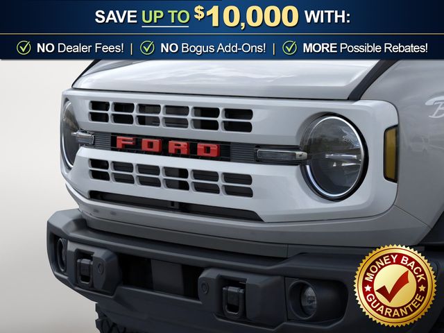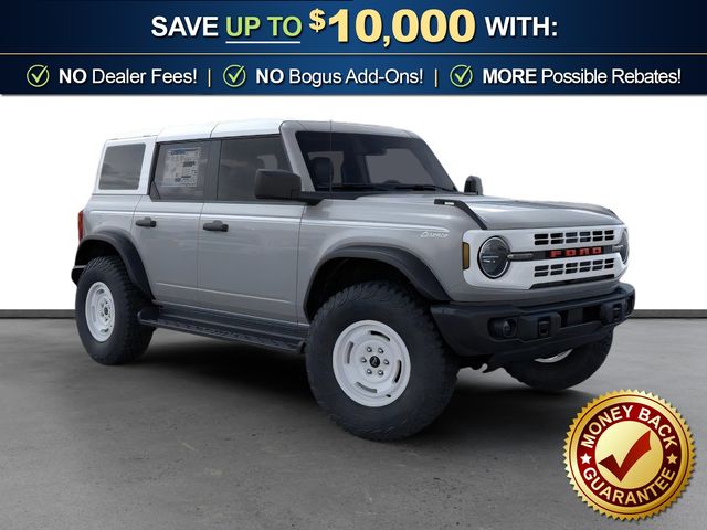 2026 Ford Bronco Heritage Edition NFT Avalanche Gray Heritage Edition NFT 4WD 10-Speed Automatic 2.7L EcoBoost V6 4-Wheel Disc Brakes, 7 Speakers, ABS brakes, Air Conditioning, Alloy wheels, AM/FM radio: SiriusXM with 360L, AM/FM Stereo, Auto High-beam Headlights, Auto-dimming Rear-View mirror, Automatic temperature control, Brake assist, Compass, Connected Navigation, Convertible HardTop, Convertible roof lining, Delay-off headlights, Driver door bin, Driver vanity mirror, Dual front impact airbags, Dual front side impact airbags, Electronic Stability Control, Emergency communication system: 911 Assist, Exterior Parking Camera Rear, Ford Connectivity Package (1-Year Included), Front anti-roll bar, Front Bucket Seats, Front Center Armrest, Front dual zone A/C, Front fog lights, Front reading lights, Front wheel independent suspension, Fully automatic headlights, Glass rear window, Heated door mirrors, Heated front seats, Heated steering wheel, Illuminated entry, Integrated roll-over protection, Low tire pressure warning, Navigation system: Connected Navigation, Occupant sensing airbag, Outside temperature display, Overhead airbag, Overhead console, Panic alarm, Passenger door bin, Passenger vanity mirror, Plaid Cloth Front Heated Bucket Seats, Power door mirrors, Power steering, Power windows, Radio data system, Rear window defroster, Rear window wiper, Remote keyless entry, Security system, SiriusXM with 360L, Speed control, Split folding rear seat, Steering wheel mounted audio controls, SYNC 4, Tachometer, Telescoping steering wheel, Tilt steering wheel, Traction control, Trip computer, Variably intermittent wipers, Wheels: 17" Unique White.