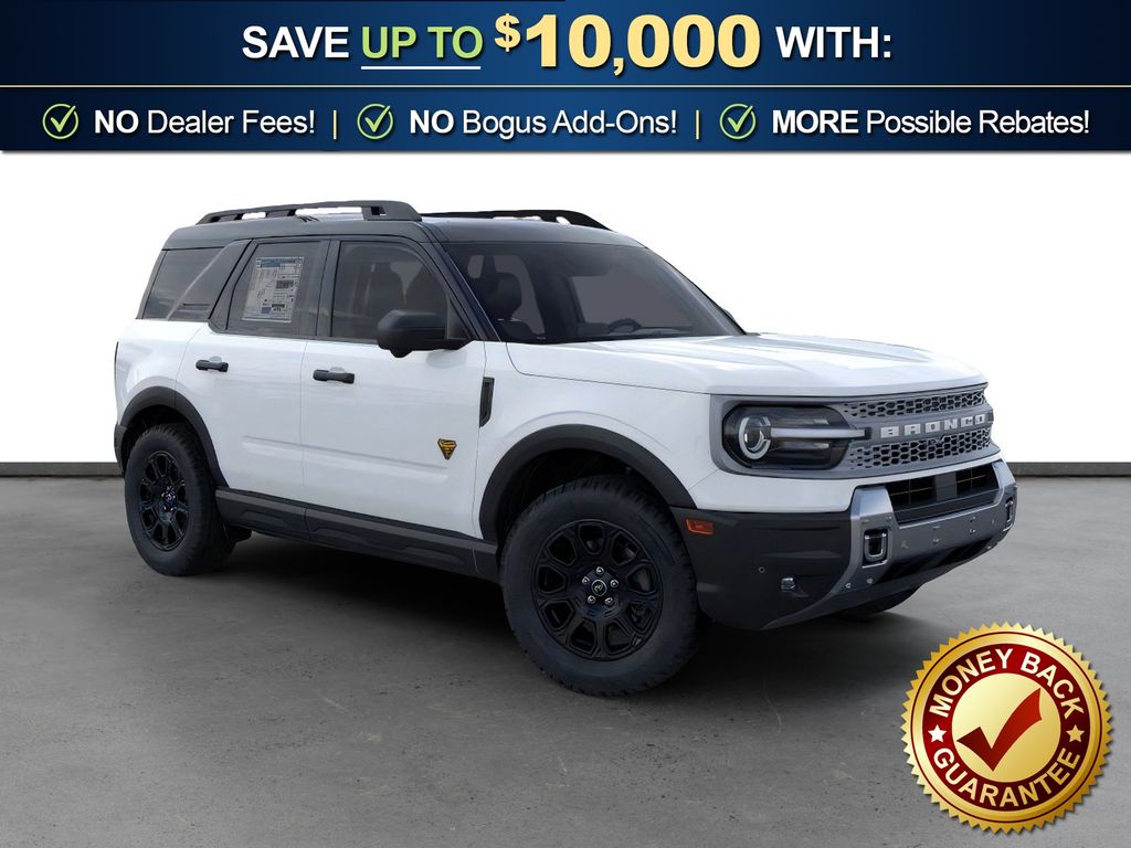 Oxford White 2026 Ford Bronco Sport Badlands NFT 4WD 8-Speed Automatic EcoBoost 2.0L I4 GTDi DOHC Turbocharged VCT 4-Wheel Disc Brakes, 6 Speakers, ABS brakes, Air Conditioning, Alloy wheels, AM/FM radio: SiriusXM with 360L, AM/FM Stereo, Apple CarPlay/Android Auto, Auto High-beam Headlights, Auto-dimming Rear-View mirror, Automatic temperature control, Badlands Tech Package, Brake assist, Compass, Connected Navigation (1-Year Included), Delay-off headlights, Driver door bin, Driver vanity mirror, Dual front impact airbags, Dual front side impact airbags, Electronic Stability Control, Emergency communication system: SYNC 4 911 Assist, Exterior Parking Camera Rear, Ford Connectivity Package (1-Year Included), Four wheel independent suspension, Front anti-roll bar, Front Bucket Seats, Front Center Armrest, Front fog lights, Front License Plate Bracket, Front reading lights, Fully automatic headlights, Heated door mirrors, Heated front seats, Heated steering wheel, Illuminated entry, Internet access capable: 5G Modem - Ford Connectivity Package, Knee airbag, Leather-Trimmed Heated Front Sport Contour Bucket Seats, Low tire pressure warning, Memory seat, Noise Reduction Module, Occupant sensing airbag, Outside temperature display, Overhead airbag, Overhead console, Panic alarm, Passenger door bin, Passenger vanity mirror, Power door mirrors, Power driver seat, Power Moonroof, Power passenger seat, Power steering, Power windows, Radio data system, Radio: HD w/B&O Sound System by Bang & Olufsen, Rear anti-roll bar, Rear reading lights, Rear seat center armrest, Rear window defroster, Rear window wiper, Remote keyless entry, Security system, SiriusXM with 360L, Speed control, Speed-sensing steering, Speed-Sensitive Wipers, Split folding rear seat, Steering wheel mounted audio controls, SYNC 4 with Enhanced Voice Recognition, Tachometer, Telescoping steering wheel, Tilt steering wheel, Traction control, Trip computer, Variably intermittent wipers, Wheels: 17" Matte Black-Painted Aluminum.