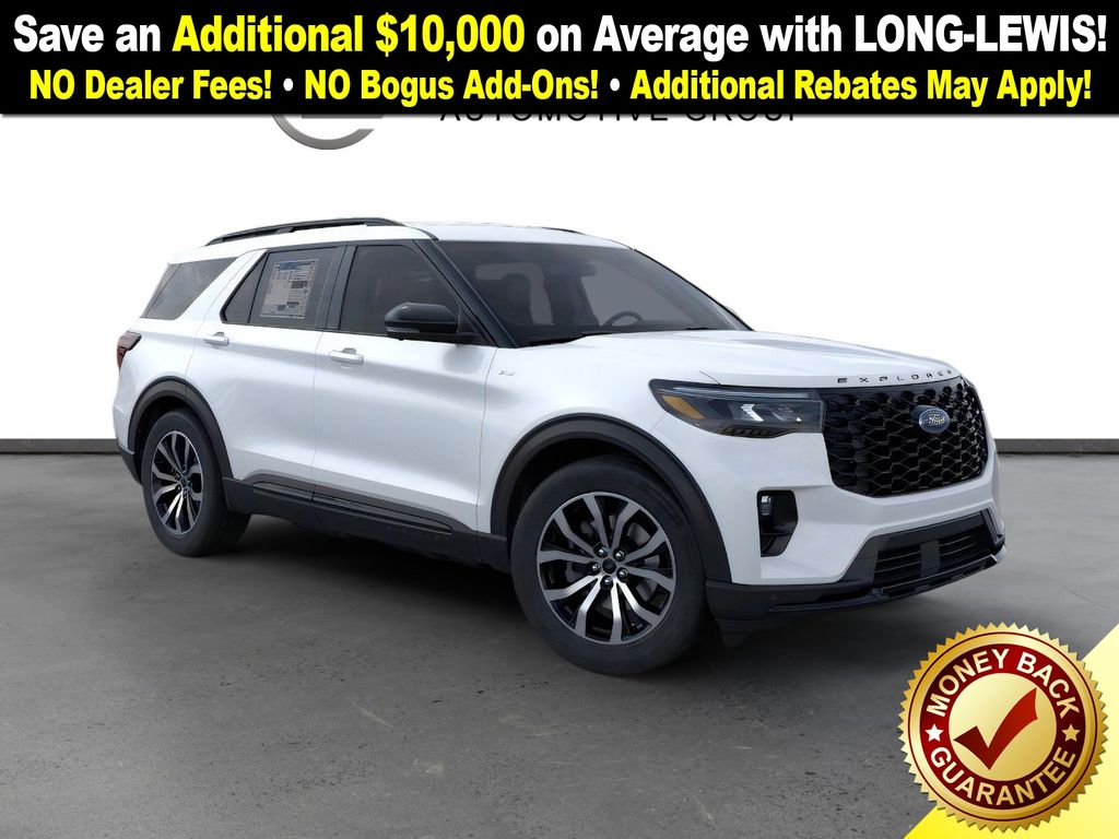 Star White Metallic Tri-Coat 2026 Ford Explorer ST-Line FCT RWD 10-Speed Automatic 2.3L EcoBoost I-4 10 Speakers, 110V/150W AC Power Outlet, 2nd Row Heated Seats, 3rd row seats: bench, 4-Wheel Disc Brakes, ABS brakes, Air Conditioning, Alloy wheels, AM/FM radio: SiriusXM with 360L, Ambient Lighting, Apple CarPlay/Android Auto, Auto High-beam Headlights, Auto-Dimming Interior Rear-View Mirror, Automatic temperature control, Brake assist, Bumpers: body-color, Compass, Delay-off headlights, Driver door bin, Driver vanity mirror, Dual front impact airbags, Dual front side impact airbags, Electronic Stability Control, Emergency communication system: 911 Assist, Equipment Group 300A Standard Package, Exterior Parking Camera Rear, Four wheel independent suspension, Front anti-roll bar, Front Bucket Seats, Front Center Armrest, Front dual zone A/C, Front fog lights, Front License Plate Bracket, Front reading lights, Fully automatic headlights, Garage door transmitter, Heated door mirrors, Heated front seats, Heated steering wheel, Heated Unique Cloth Captain's Chairs, Illuminated entry, Knee airbag, Leather steering wheel, Low tire pressure warning, Manual-Folding Sideview Mirrors, Memory Driver's Seat, Navigation System, Occupant sensing airbag, Outside temperature display, Overhead airbag, Overhead console, Panic alarm, Passenger door bin, Passenger vanity mirror, Power door mirrors, Power driver seat, Power Liftgate, Power passenger seat, Power steering, Power windows, Premium Package, Radio: B&O Sound System by Bang and Olufsen, Rain-Sensing Wipers (front Only), Rear air conditioning, Rear anti-roll bar, Rear reading lights, Rear window defroster, Rear window wiper, Remote keyless entry, SecuriCode Keyless Entry Keypad, Security system, Speed control, Speed-sensing steering, Speed-Sensitive Wipers, Split folding rear seat, Spoiler, Steering wheel mounted audio controls, Tachometer, Telescoping steering wheel, Tilt steering wheel, Traction control, Trip computer, Variably intermittent wipers, Wheels: 20" Ebony-Painted Machined Aluminum.