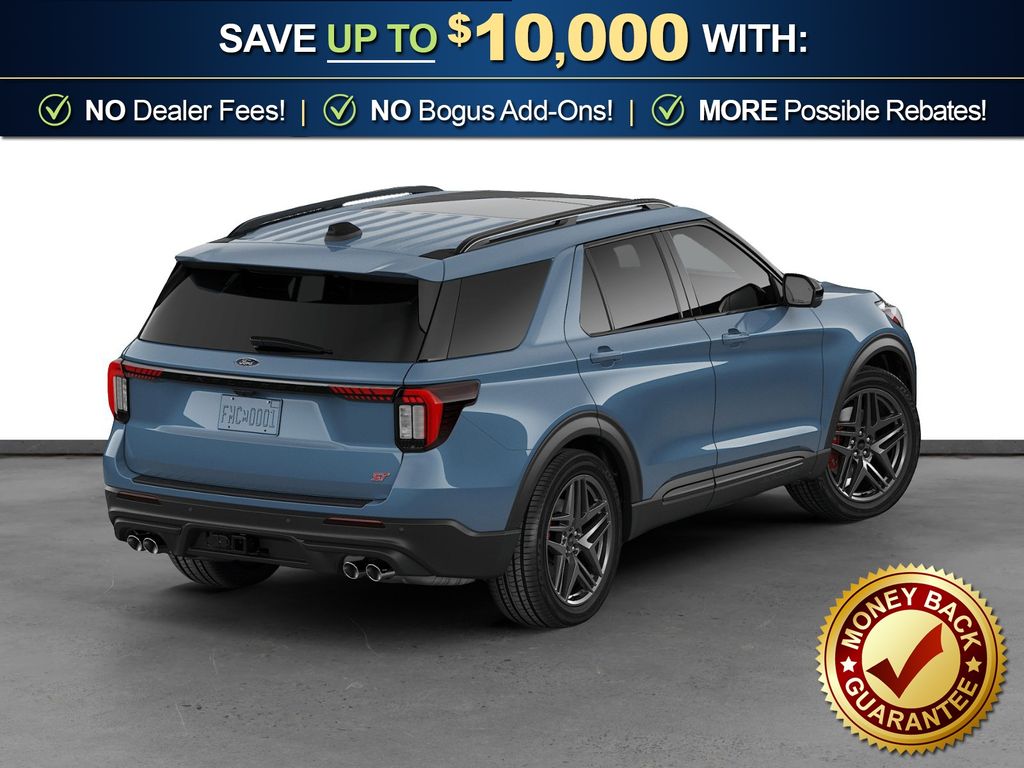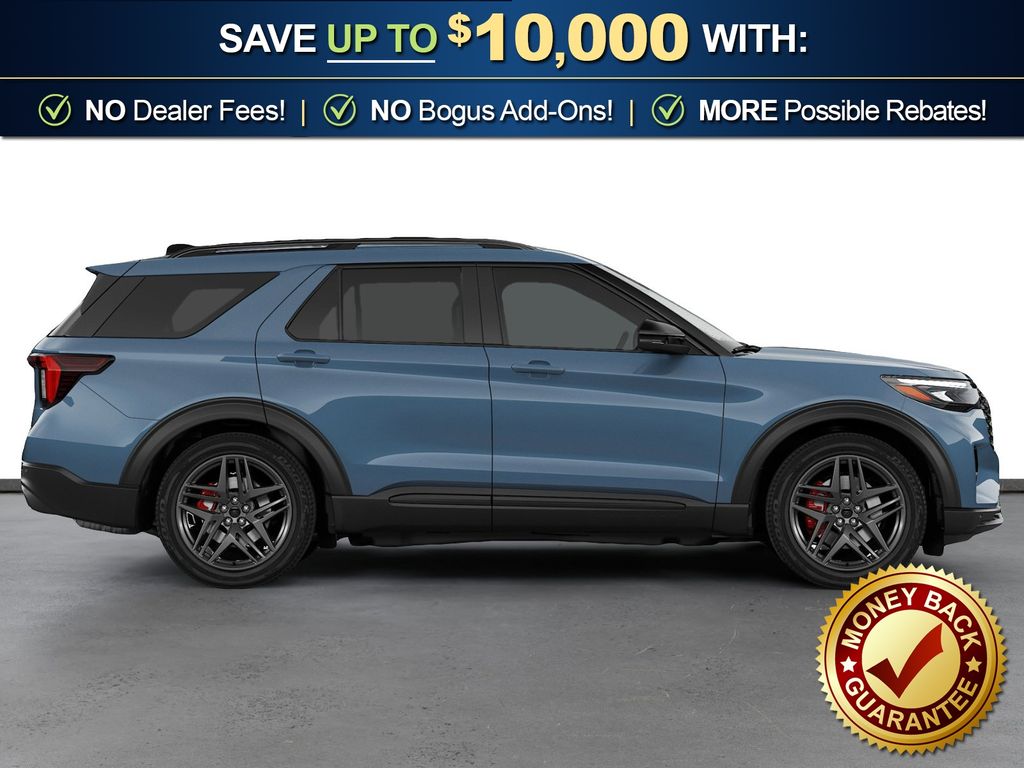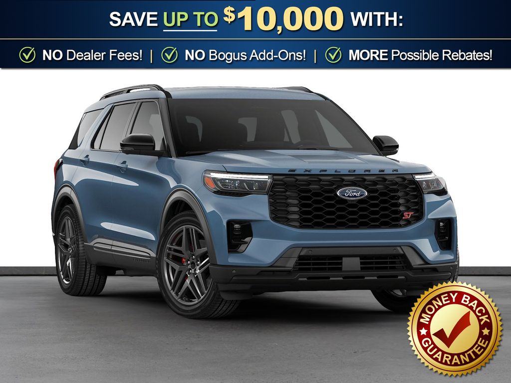Vapor Blue Metallic 2026 Ford Explorer ST NFT 4WD 10-Speed Automatic 3.0L EcoBoost V6 4WD, 10 Speakers, 3rd row seats: bench, 4-Wheel Disc Brakes, ABS brakes, Air Conditioning, Alloy wheels, AM/FM radio: SiriusXM with 360L, Apple CarPlay/Android Auto, Auto High-beam Headlights, Auto-dimming door mirrors, Auto-dimming Rear-View mirror, Automatic temperature control, BlueCruise Equipped (1-Year + 90-Day Plan), Brake assist, Bumpers: body-color, Compass, Delay-off headlights, Driver door bin, Driver vanity mirror, Dual front impact airbags, Dual front side impact airbags, Electronic Stability Control, Emergency communication system: 911 Assist, Exterior Parking Camera Rear, Ford Connectivity Package (one-Time Purchase - 7 Years), Four wheel independent suspension, Front anti-roll bar, Front Bucket Seats, Front Center Armrest, Front dual zone A/C, Front fog lights, Front License Plate Bracket, Front reading lights, Fully automatic headlights, Garage door transmitter, Heated door mirrors, Heated front seats, Heated rear seats, Heated steering wheel, Heated/Ventilated Miko Suede Captain's Chairs, Illuminated entry, Knee airbag, Leather steering wheel, Low tire pressure warning, Memory seat, Multicontour Seats with Front Active Motion, Navigation System, Occupant sensing airbag, Outside temperature display, Overhead airbag, Overhead console, Panic alarm, Panoramic Fixed Glass Roof with Power Shade, Passenger door bin, Passenger vanity mirror, Power door mirrors, Power driver seat, Power Liftgate, Power passenger seat, Power steering, Power windows, Radio: B&O Sound System by Bang & Olufsen, Radio: B&O Sound System by Bang and Olufsen, Rain sensing wipers, Rear air conditioning, Rear anti-roll bar, Rear reading lights, Rear window defroster, Rear window wiper, Remote Control Front Windows, Remote keyless entry, SecuriCode Keyless Entry Keypad, Security system, Speed control, Speed-sensing steering, Speed-Sensitive Wipers, Split folding rear seat, Spoiler, Sport steering wheel, Steering wheel mounted audio controls, Sun and Sound Package, Tachometer, Telescoping steering wheel, Tilt steering wheel, Traction control, Trip computer, Turn signal indicator mirrors, Variably intermittent wipers, Ventilated front seats, Wheels: 21" Magnetite-Painted Aluminum, 4WD.