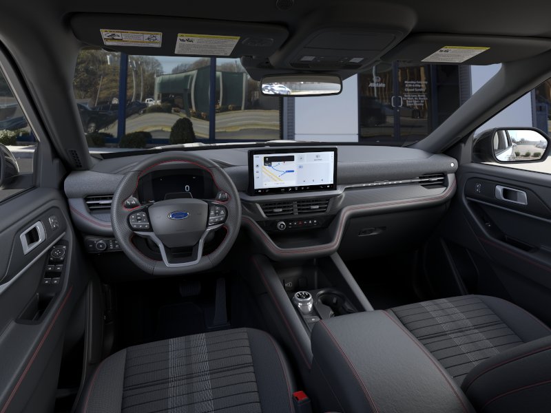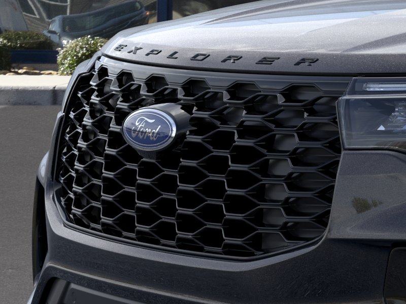 Agate Black Metallic 2026 Ford Explorer ST-Line NFT RWD 10-Speed Automatic 2.3L EcoBoost I-4 10 Speakers, 110V/150W AC Power Outlet, 2nd Row Captain's Chairs w/E-Z Entry and Armrest, 2nd Row Heated Seats, 3rd row seats: bench, 4-Wheel Disc Brakes, ABS brakes, Air Conditioning, Alloy wheels, AM/FM radio: SiriusXM with 360L, Ambient Lighting, Apple CarPlay/Android Auto, Auto High-beam Headlights, Auto-Dimming Interior Rear-View Mirror, Automatic temperature control, BlueCruise (equipment + 1-Year + 90-Day Plan), BlueCruise Hardware, Brake assist, Bumpers: body-color, Compass, Delay-off headlights, Driver door bin, Driver vanity mirror, Dual front impact airbags, Dual front side impact airbags, Electronic Stability Control, Emergency communication system: 911 Assist, Exterior Parking Camera Rear, Ford Connectivity Package (one-Time Purchase - 7 Years), Four wheel independent suspension, Front anti-roll bar, Front Bucket Seats, Front Center Armrest, Front dual zone A/C, Front fog lights, Front License Plate Bracket, Front reading lights, Fully automatic headlights, Garage door transmitter, Heated door mirrors, Heated front seats, Heated steering wheel, Heated Unique Cloth Captain's Chairs, Illuminated entry, Knee airbag, Leather steering wheel, Low tire pressure warning, Manual-Folding Sideview Mirrors, Memory Driver's Seat, Navigation System, Occupant sensing airbag, Outside temperature display, Overhead airbag, Overhead console, Panic alarm, Passenger door bin, Passenger vanity mirror, Performance Brakes, Power door mirrors, Power driver seat, Power Liftgate, Power passenger seat, Power steering, Power windows, Premium Package, Radio: B&O Sound System by Bang and Olufsen, Rain-Sensing Wipers (front Only), Rear air conditioning, Rear anti-roll bar, Rear reading lights, Rear window defroster, Rear window wiper, Red Painted Performance Front and Rear Brake Calipers, Remote keyless entry, SecuriCode Keyless Entry Keypad, Security system, Speed control, Speed-sensing steering, Speed-Sensitive Wipers, Split folding rear seat, Spoiler, ST-Line Street Pack, Steering wheel mounted audio controls, Tachometer, Telescoping steering wheel, Tilt steering wheel, Traction control, Trip computer, Variably intermittent wipers, Wheels: 20" Ebony-Painted Machined Aluminum, Wheels: 21" Magnetite-Painted Aluminum.