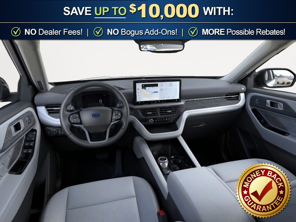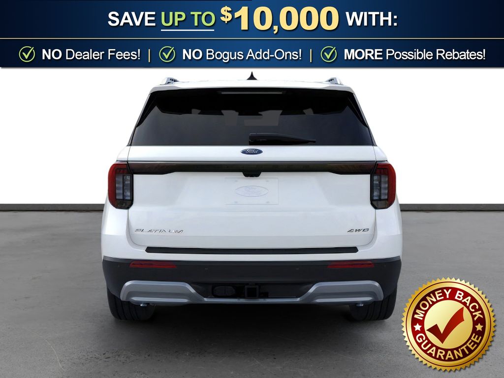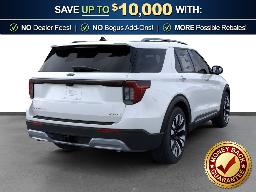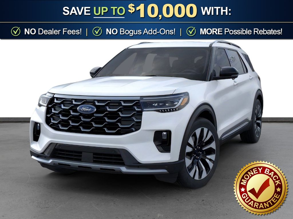 Star White Metallic Tri-Coat 2026 Ford Explorer Platinum FCT 4WD 10-Speed Automatic 2.3L EcoBoost I-4 4WD, 14 Speakers, 3rd row seats: bench, 4-Wheel Disc Brakes, ABS brakes, ActiveX Trimmed Captain's Chairs, Air Conditioning, Alloy wheels, AM/FM radio: SiriusXM with 360L, Apple CarPlay/Android Auto, Auto High-beam Headlights, Auto-dimming door mirrors, Auto-dimming Rear-View mirror, Automatic temperature control, Brake assist, Bumpers: body-color, Compass, Delay-off headlights, Driver door bin, Driver vanity mirror, Dual front impact airbags, Dual front side impact airbags, Electronic Stability Control, Emergency communication system: 911 Assist, Exterior Parking Camera Rear, Four wheel independent suspension, Front anti-roll bar, Front Bucket Seats, Front Center Armrest, Front dual zone A/C, Front fog lights, Front License Plate Bracket, Front reading lights, Fully automatic headlights, Garage door transmitter, Heated door mirrors, Heated front seats, Heated rear seats, Heated steering wheel, Illuminated entry, Knee airbag, Leather steering wheel, Low tire pressure warning, Lux Leather Package, Memory seat, Navigation System, Occupant sensing airbag, Outside temperature display, Overhead airbag, Overhead console, Panic alarm, Panoramic Fixed Glass Roof with Power Shade, Passenger door bin, Passenger vanity mirror, Platinum Badges on Front Row Seats, Power door mirrors, Power driver seat, Power Liftgate, Power passenger seat, Power steering, Power windows, Premium Leather Seating Surfaces Captain's Chairs, Quilting and Stitching on Door Panels, Quilting and Stitching on Seats, Radio data system, Radio: B&O Sound System by Bang & Olufsen with HD, Rain sensing wipers, Rear air conditioning, Rear anti-roll bar, Rear reading lights, Rear window defroster, Rear window wiper, Remote keyless entry, SecuriCode Keyless Entry Keypad, Security system, Speed control, Speed-sensing steering, Speed-Sensitive Wipers, Split folding rear seat, Spoiler, Steering wheel mounted audio controls, Tachometer, Telescoping steering wheel, Tilt steering wheel, Traction control, Trip computer, Turn signal indicator mirrors, Variably intermittent wipers, Ventilated front seats, Wheels: : 21" Bright Machined Aluminum w/Tarnish Dark Pockets, Wheels: 20" Luster Nickel-Painted Aluminum, 4WD.