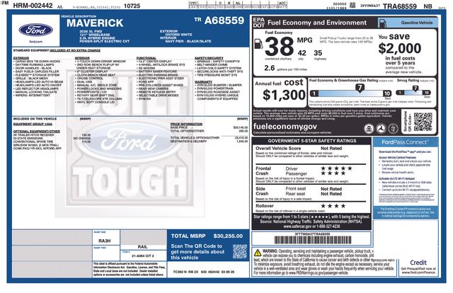 2026 Ford Maverick XL NFT Oxford White XL NFT FWD CVT 2.5L I-4 Hybrid 2.5L I-4 Hybrid, 2.91 Axle Ratio, 2K Trailer Hitch Receiver with 4-Pin Connector, 4-Wheel Disc Brakes, 6 Speakers, ABS brakes, Air Conditioning, AM/FM radio: SiriusXM with 360L, Apple CarPlay/Android Auto, Auto High Beams, Auto High-beam Headlights, Automatic temperature control, Brake assist, Bumpers: body-color, Compass, Delay-off headlights, Driver door bin, Driver vanity mirror, Dual front impact airbags, Dual front side impact airbags, Electronic Stability Control, Emergency communication system: SYNC 4 911 Assist, Exterior Parking Camera Rear, Ford Connectivity Package (1-Year Included), Front anti-roll bar, Front Bucket Seats, Front Center Armrest, Front Cloth Bucket Seats, Front reading lights, Front wheel independent suspension, Fully automatic headlights, Illuminated entry, Internet access capable: 5G Modem - Ford Connectivity Package, Intersection Assist, Knee airbag, Lane-Keeping System, Low tire pressure warning, Occupant sensing airbag, Outside temperature display, Overhead airbag, Overhead console, Panic alarm, Passenger door bin, Passenger vanity mirror, Power steering, Power windows, Pre-Collision Assist with Automatic Emergency Braking, Radio data system, Radio: AM/FM Stereo with 6 Speakers, Rear anti-roll bar, Rear step bumper, Rear-View Camera, Remote keyless entry, SiriusXM with 360L, Speed control, Speed-sensing steering, Steering wheel mounted audio controls, SYNC 4 with Enhanced Voice Recognition, Telescoping steering wheel, Tilt steering wheel, Traction control, Trip computer, Wheels: 17" Steel with Sparkle Silver Painted Cover, 2.5L I-4 Hybrid.