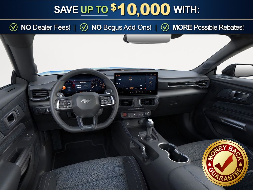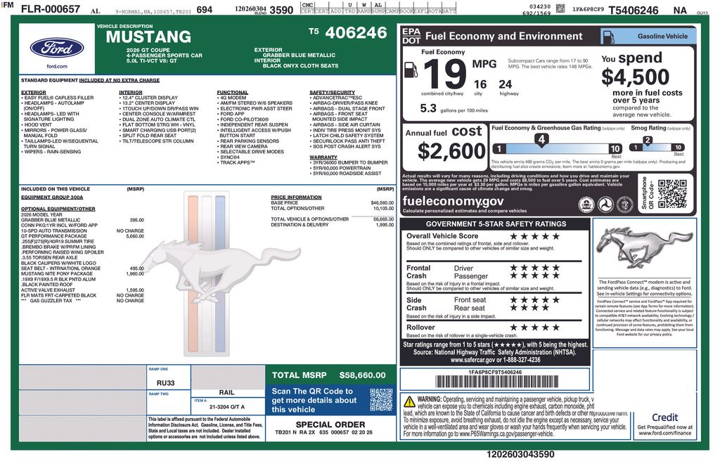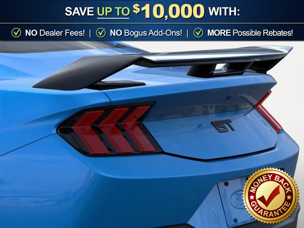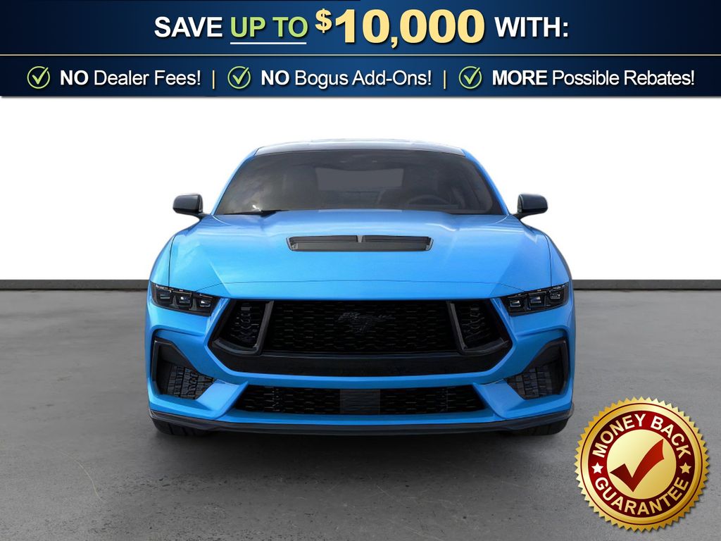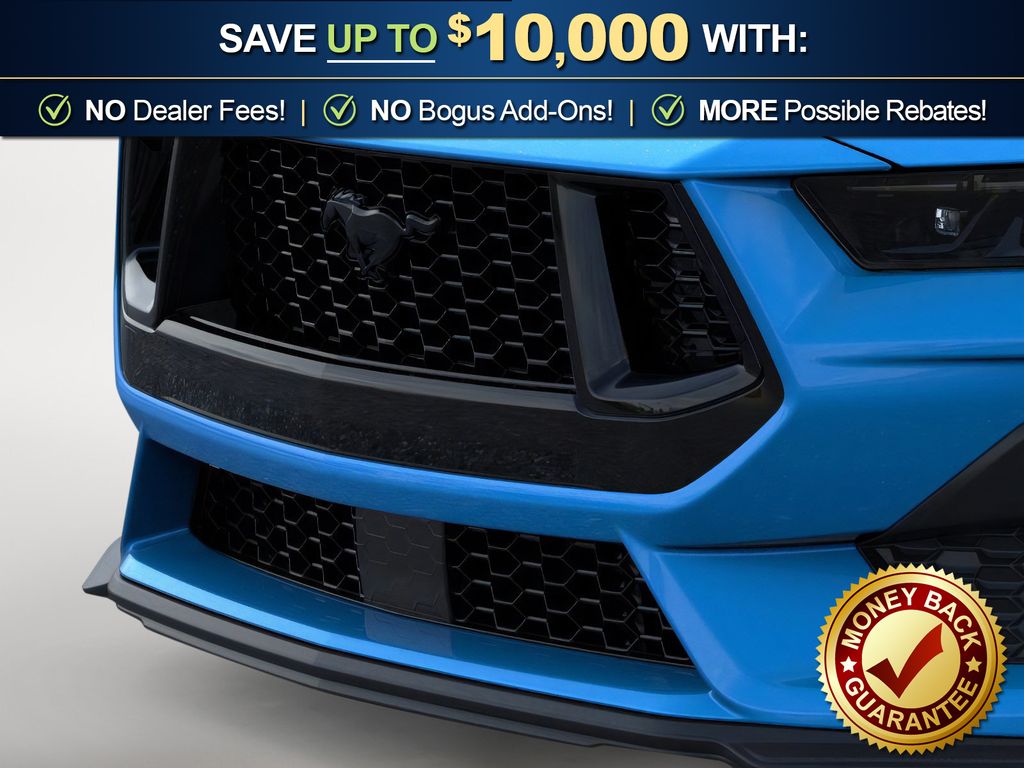 Grabber Blue Metallic 2026 Ford Mustang GT NFC RWD 10-Speed Automatic 5.0L V8 Ti-VCT 1st Row Carpeted Black Floor Mats, 4-Wheel Disc Brakes, ABS brakes, Active Valve Performance Exhaust, Air Conditioning, Alloy wheels, AM/FM Stereo, Auto High-beam Headlights, Automatic temperature control, Black Mirror Caps, Black Painted Strut-Tower Brace, Brake assist, Bumpers: body-color, Cloth Bucket Seats, Compass, Delay-off headlights, Driver door bin, Driver vanity mirror, Dual front impact airbags, Dual front side impact airbags, Electronic Stability Control, Emergency communication system: 911 Assist, Exterior Parking Camera Rear, Four wheel independent suspension, Front anti-roll bar, Front Bucket Seats, Front Center Armrest, Front dual zone A/C, Front reading lights, Fully automatic headlights, GT Performance Package, Illuminated entry, International Orange Seat Belt, Knee airbag, Leather Shift Knob, Leather steering wheel, Low tire pressure warning, Mustang Nite Pony Package, Occupant sensing airbag, Outside temperature display, Overhead airbag, Overhead console, Panic alarm, Passenger door bin, Passenger vanity mirror, Power door mirrors, Power steering, Power windows, Radio data system, Rain sensing wipers, Rear anti-roll bar, Rear Parking Sensors, Rear window defroster, Remote keyless entry, Speed control, Speed-sensing steering, Speed-Sensitive Wipers, Split folding rear seat, Sport steering wheel, Steering wheel mounted audio controls, SYNC 4, Tachometer, Telescoping steering wheel, Tilt steering wheel, Traction control, Trip computer, Variably intermittent wipers, Voltmeter, Wedge Decklid Spoiler.