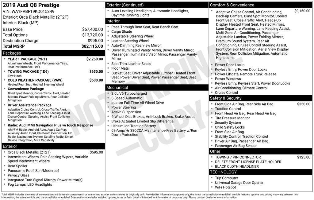 2019 Audi Q8 3.0T Prestige SUV V6 Turbocharged DOHC 24V LEV3-ULEV125 335hp