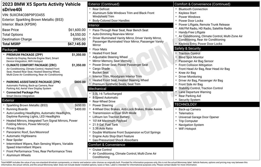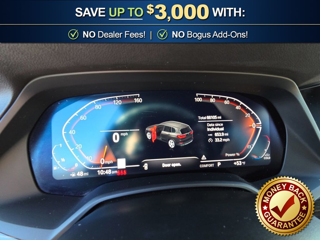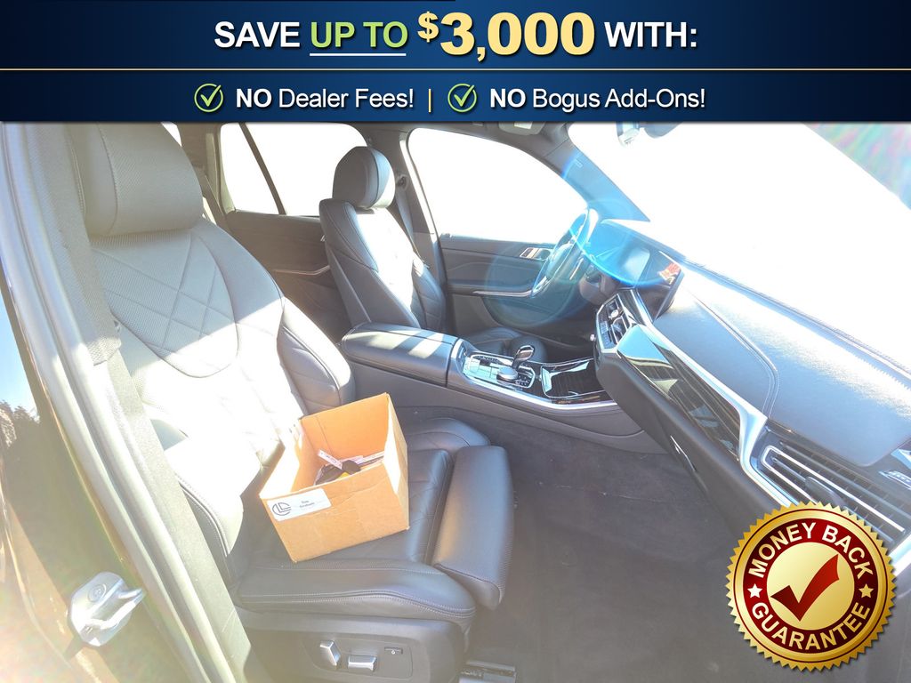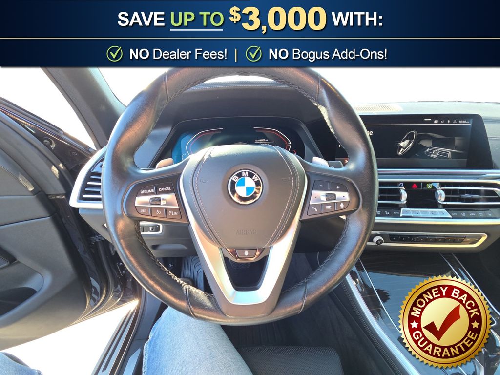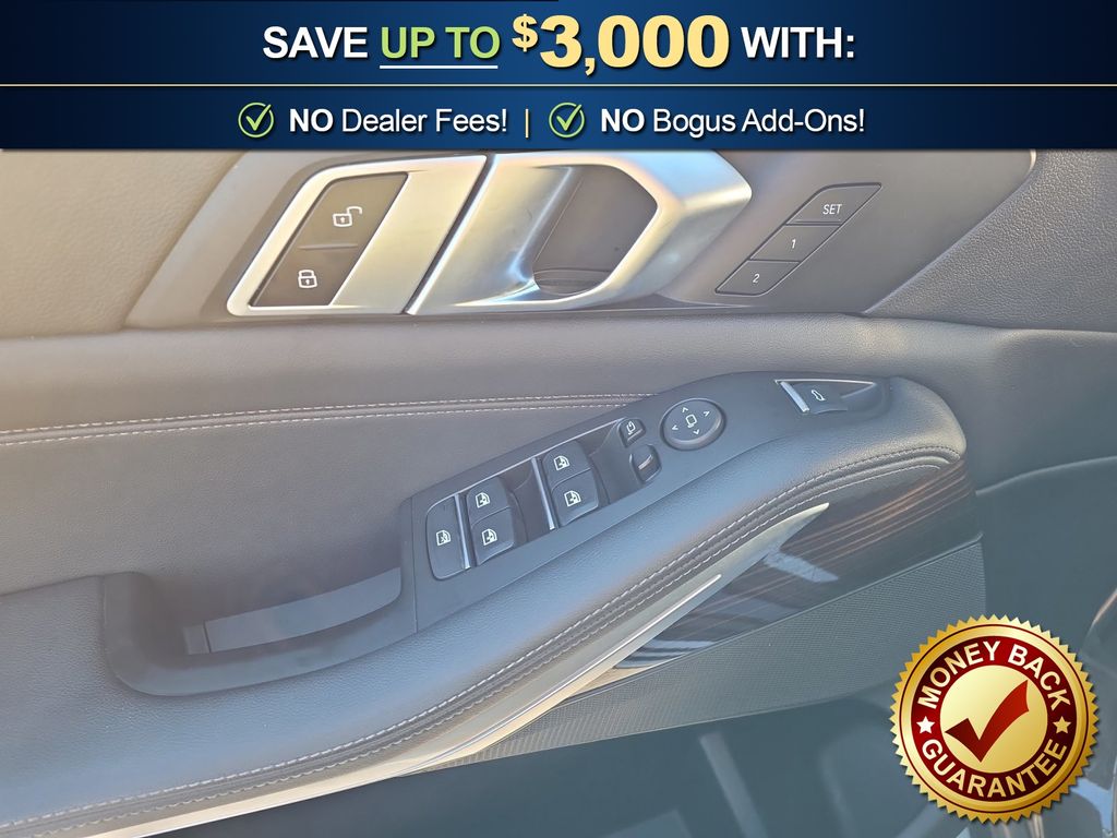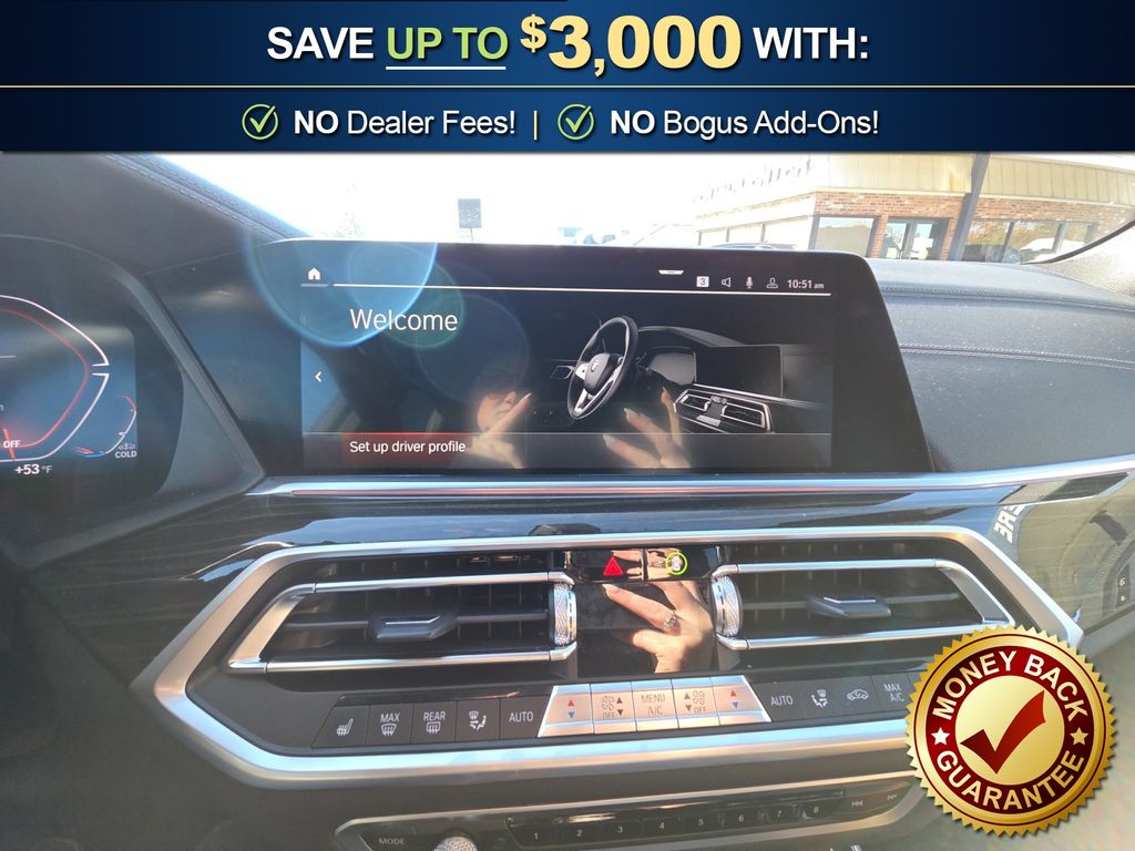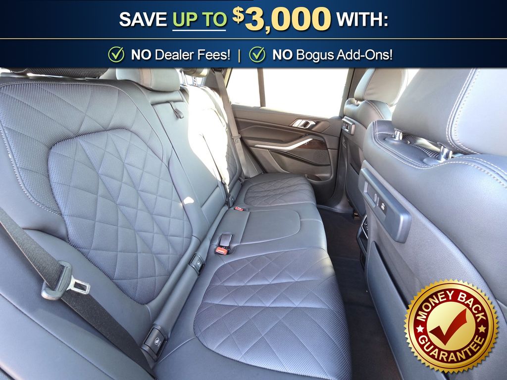 Black Black Sensafin, 10 Speakers, 3.39 Axle Ratio, 4-Wheel Disc Brakes, 4-Zone Automatic Climate Control, ABS brakes, Active Park Distance Control, Air Conditioning, Alloy wheels, Aluminum Running Boards, AM/FM radio: SiriusXM with 360L, AM/FM Stereo, Auto High-beam Headlights, Auto tilt-away steering wheel, Auto-dimming door mirrors, Auto-dimming Rear-View mirror, Automatic temperature control, BMW Assist eCall, BMW TeleServices, Brake assist, Bumpers: body-color, Compass, Connected Package Pro, ConnectedDrive Services, Delay-off headlights, Drive Recorder, Driver door bin, Driver Lumbar Support Only (DISC), Driver vanity mirror, Dual front impact airbags, Dual front side impact airbags, Electronic Stability Control, Emergency communication system: BMW Assist eCall, Enhanced USB & Bluetooth w/Smartphone Integration, Exterior Parking Camera Rear, Four wheel independent suspension, Front & Rear Heated Seats, Front anti-roll bar, Front Bucket Seats, Front Center Armrest, Front dual zone A/C, Front reading lights, Fully automatic headlights, Garage door transmitter, Genuine wood console insert, Genuine wood dashboard insert, Genuine wood door panel insert, Head restraints memory, Head-Up Display, Heated door mirrors, Heated Front Seats, Heated front seats, Heated Front Seats w/Armrests & Steering Wheel, Hi-Fi Sound System, Illuminated entry, Knee airbag, Leather Shift Knob, Leather steering wheel, Live Cockpit Pro w/Navigation, Low tire pressure warning, Lumbar Support, Memory seat, Navigation System, Occupant sensing airbag, Outside temperature display, Overhead airbag, Panic alarm, Parking Assistant Plus, Passenger door bin, Passenger vanity mirror, Power adjustable front head restraints, Power door mirrors, Power driver seat, Power Front Seats, Power moonroof, Power passenger seat, Power steering, Power windows, Radio data system, Rain sensing wipers, Rear anti-roll bar, Rear reading lights, Rear seat center armrest, Rear window defroster, Rear window wiper, Rear-View Camera, Remote Engine Start, Remote keyless entry, Security system, Sensafin Upholstery, SiriusXM Satellite Radio, Speed control, Speed-sensing steering, Speed-Sensitive Wipers, Split folding rear seat, Spoiler, Sport Seats, Sport steering wheel, Steering wheel mounted audio controls, Surround View w/3D View, Tachometer, Telescoping steering wheel, Tilt steering wheel, Traction control, Trip computer, Turn signal indicator mirrors, Variably intermittent wipers, Wheels: 19" x 9" V-Spoke, WiFi Hotspot, Wireless Charging, Black Black Sensafin. 2023 BMW X5 sDrive40i