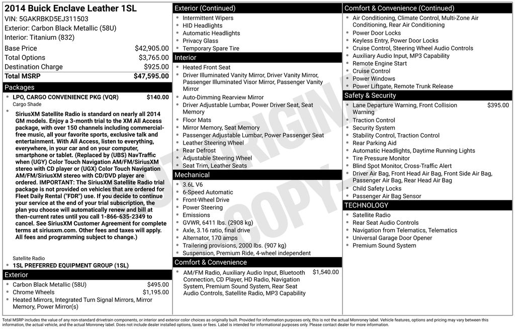 2014 Buick Enclave Leather Group Carbon Black Metallic Leather Group FWD 6-Speed Automatic 3.6L V6 SIDI DOHC VVT FWD, 19" 9-Spoke Chrome-Clad Aluminum Wheels, 19" Aluminum (4) Wheels, 3.16 Axle Ratio, 3rd row seats: split-bench, 4-Wheel Disc Brakes, 6 Speakers, 7-Passenger Seating, 8-Way Power Driver Seat Adjuster, 8-Way Power Passenger Seat Adjuster, ABS brakes, Air Conditioning, Alloy wheels, AM/FM radio: SiriusXM, Auto-dimming Rear-View mirror, Automatic temperature control, Bose Performance Enhanced System, Brake assist, Bumpers: body-color, Cargo Convenience Package, Cargo Net, Cargo Shade Area Cover, CD player, Compass, Delay-off headlights, Driver door bin, Driver vanity mirror, Dual front impact airbags, Dual front side impact airbags, Electronic Stability Control, Emergency communication system: OnStar Directions & Connections, Exterior Parking Camera Rear, Forward Collision Alert & Lane Departure Warning, Four wheel independent suspension, Front anti-roll bar, Front Bucket Seats, Front Center Armrest w/Storage, Front dual zone A/C, Front reading lights, Fully automatic headlights, Garage door transmitter, Heated door mirrors, Heated Driver & Front Passenger Seats, Heated front seats, High intensity discharge headlights: Bi-Xenon, Illuminated entry, Leather steering wheel, Low tire pressure warning, Memory seat, Memory Settings, NavTraffic, Occupant sensing airbag, Outside temperature display, Overhead airbag, Panic alarm, Passenger door bin, Passenger vanity mirror, Perforated Leather Seating Surfaces, Power door mirrors, Power driver seat, Power Liftgate, Power passenger seat, Power steering, Power windows, Preferred Equipment Group 1SL, Premium audio system: IntelliLink, Premium Ride Suspension, Radio data system, Radio: Color Touch AM/FM/HD/CD Player, Radio: Color Touch AM/FM/HD/CD w/Navigation, Rear air conditioning, Rear anti-roll bar, Rear Audio System Controls, Rear reading lights, Rear window defroster, Rear window wiper, Remote keyless entry, Roof rack: rails only, Security system, Side Blind Zone Alert w/Cross Traffic Alert, SiriusXM Satellite Radio, Speed control, Speed-sensing steering, Spoiler, Steering wheel mounted audio controls, Tachometer, Telescoping steering wheel, Tilt steering wheel, Traction control, Trip computer, Turn signal indicator mirrors, Variably intermittent wipers, Voltmeter, FWD.