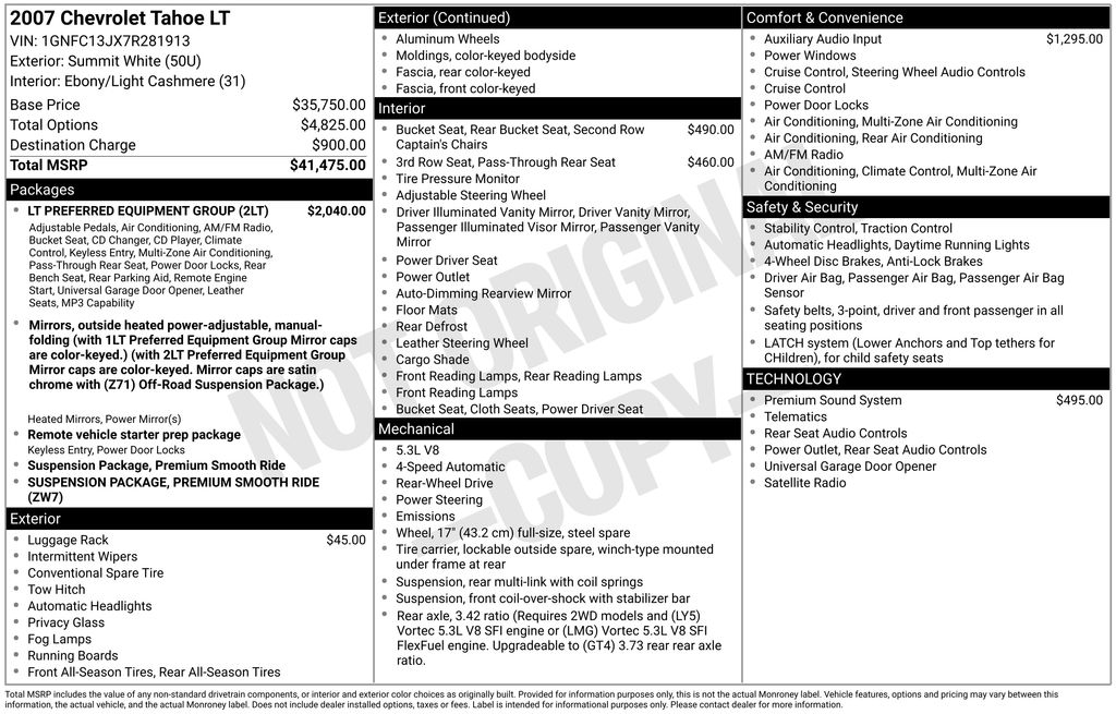 Ebony/Light Cashmere Cloth, 17" x 7.5" 5-Spoke Aluminum Wheels, 2nd Row Reclining Bucket Seats, 3.42 Rear Axle Ratio, 3rd Row 3-Passenger Cloth 50/50 Split-Bench Seat, 4-Wheel Disc Brakes, 8 Speakers, ABS brakes, Air Conditioning, Alloy wheels, AM/FM radio: XM, AM/FM Stereo w/CD/DVD Player & XM Satellite, AM/FM Stereo w/XM Satellite, Auto-dimming Rear-View mirror, Automatic Dual-Zone Climate Control, Bodyside moldings, Bumpers: body-color, Cargo Shade, CD player, Color-Keyed Door Handles, Compass, Custom Cloth Seat Trim, Custom Leather Appointed Seating Surfaces, Delay-off headlights, Driver door bin, Driver vanity mirror, Dual front impact airbags, Electronic Stability Control, Emergency communication system: OnStar, Floor Console, Front anti-roll bar, Front Bucket Seats, Front Center Armrest, Front dual zone A/C, Front fog lights, Front reading lights, Front Reclining Bucket Seats, Front Round Fog Lamps, Front wheel independent suspension, Fully automatic headlights, Heated door mirrors, Illuminated entry, Low tire pressure warning, Luggage Rack Center Rails, Occupant sensing airbag, Outside temperature display, Overhead console, Panic alarm, Passenger door bin, Passenger vanity mirror, Power Adjustable Pedals For Accelerator & Brake, Power door mirrors, Power driver seat, Power Heated Manual-Folding Outside Mirrors, Power steering, Power windows, Preferred Equipment Group 2LT, Premium Smooth Ride Suspension Package, Radio data system, Rear air conditioning, Rear anti-roll bar, Rear audio controls, Rear Audio System Controls, Rear reading lights, Rear seat center armrest, Rear Seat Entertainment System, Rear window defroster, Rear window wiper, Remote keyless entry, Remote Vehicle Starter System, Roof rack: rails only, Security system, Speed control, Split folding rear seat, Spoiler, Steering Wheel Mounted Audio Controls, Steering wheel mounted audio controls, Tachometer, Tilt steering wheel, Traction control, Trip computer, Ultrasonic Rear Parking Assist, Universal Home Remote, Variably intermittent wipers, Voltmeter, XM Satellite Radio, Ebony/Light Cashmere Cloth. 2007 Chevrolet Tahoe LT