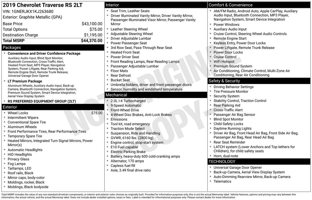 2019 Chevrolet Traverse RS 2LT Graphite Metallic RS 2LT FWD 9-Speed Automatic 2.0L Turbocharged 10 Speakers, 3.49 Axle Ratio, 3rd row seats: split-bench, 4-Wheel Disc Brakes, 7-Passenger Seating (2-2-3 Seating Configuration), ABS brakes, Air Conditioning, Alloy wheels, AM/FM radio: SiriusXM, Apple CarPlay/Android Auto, Auto-dimming door mirrors, Auto-dimming Rear-View mirror, Automatic temperature control, Bose Premium 10-Speaker Audio System Feature, Brake assist, Bumpers: body-color, Compass, Delay-off headlights, Driver door bin, Driver vanity mirror, Dual front impact airbags, Dual front side impact airbags, Electronic Stability Control, Emergency communication system, Four wheel independent suspension, Front anti-roll bar, Front Bucket Seats, Front Center Armrest, Front dual zone A/C, Front fog lights, Front reading lights, Fully automatic headlights, Garage door transmitter, Heated door mirrors, Heated front seats, High-Intensity Discharge Headlights, Illuminated entry, Leather-Appointed Seat Trim, Low tire pressure warning, Navigation System, Occupant sensing airbag, Outside temperature display, Overhead airbag, Overhead console, Panic alarm, Passenger door bin, Passenger vanity mirror, Power door mirrors, Power driver seat, Power Liftgate, Power passenger seat, Power steering, Power windows, Preferred Equipment Group 2LT, Premium audio system: Chevrolet MyLink, Radio data system, Radio: Chevrolet Infotainment AM/FM Stereo w/Navigation, Rear air conditioning, Rear anti-roll bar, Rear reading lights, Rear window defroster, Rear window wiper, Remote keyless entry, Roof rack: rails only, Security system, SiriusXM Radio, Speed control, Speed-sensing steering, Spoiler, Steering wheel mounted audio controls, Tachometer, Telescoping steering wheel, Tilt steering wheel, Traction control, Trip computer, Turn signal indicator mirrors, Variably intermittent wipers, Voltmeter, Wheel Locks, Wheels: 20" Dark Android Painted Aluminum.