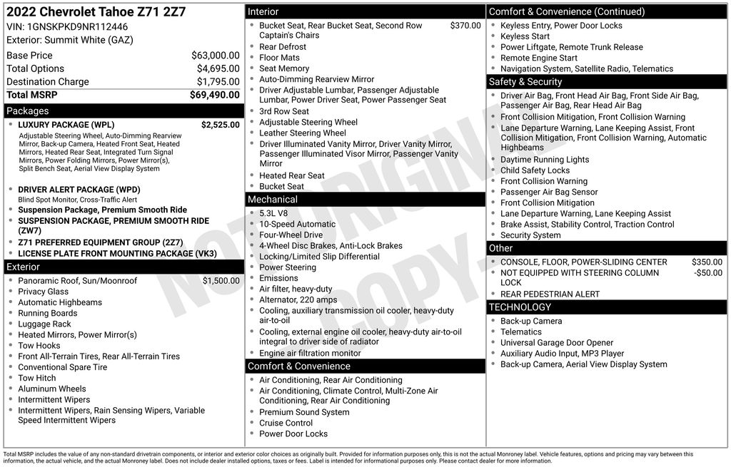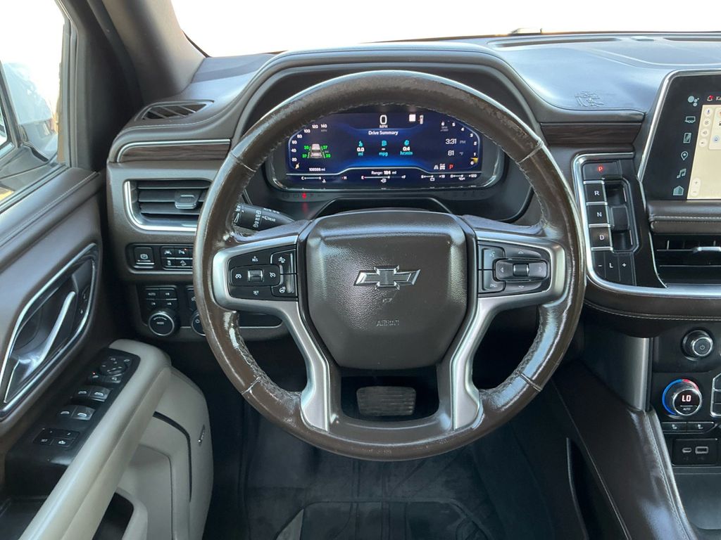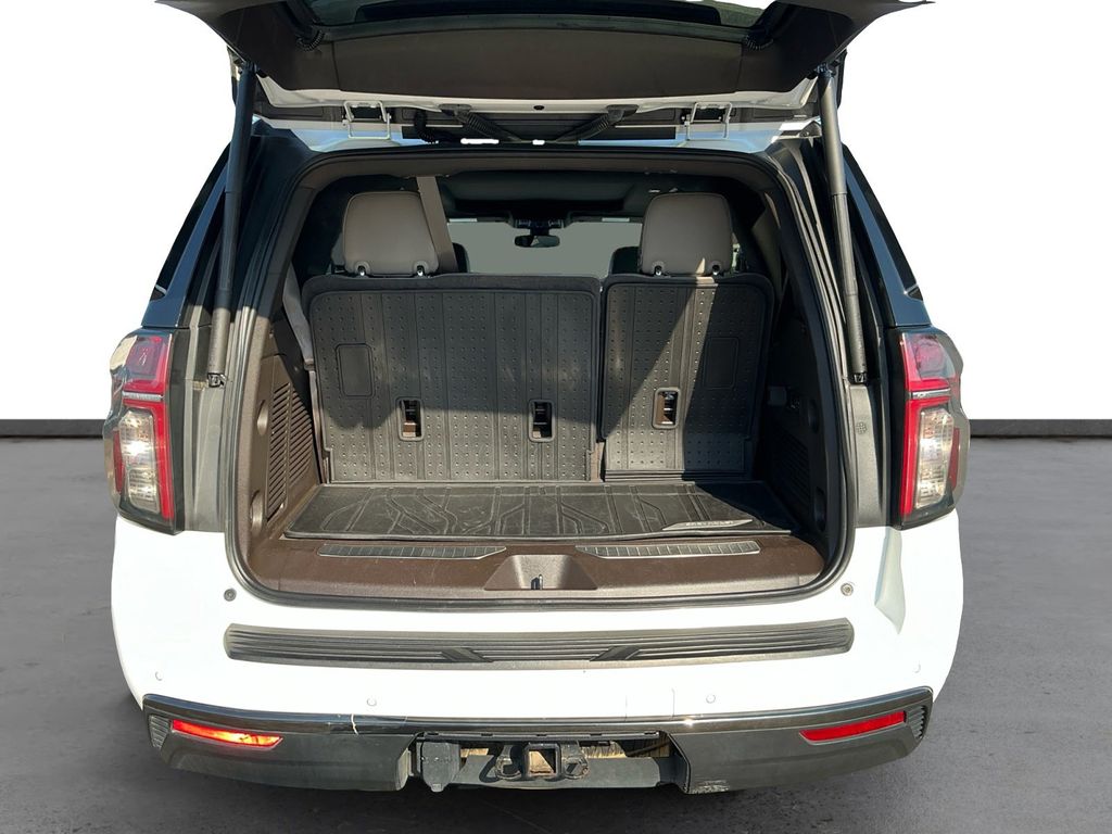 2022 Chevrolet Tahoe Z71 Summit White Z71 4WD 10-Speed Automatic with Overdrive EcoTec3 5.3L V8 4WD, Gideon/Very Dark Atmosphere Leather, 10-Way Power Driver & Passenger Seat Adjusters, 1st & 2nd Row Color-Keyed Carpeted Floor Mats, 2-Speed Active Electronic AutoTrac Transfer Case, 2nd Row Pwr Release 60/40 Split-Folding Bench Seat, 3.23 Rear Axle Ratio, 3rd Row 60/40 Power-Folding Split-Bench Seat, 3rd row seats: split-bench, 4-Wheel Disc Brakes, 9 Speakers, ABS brakes, Air Conditioning, Alloy wheels, AM/FM radio: SiriusXM with 360L, Apple CarPlay/Android Auto, Auto High-beam Headlights, Auto-Dimming Inside Rear-View Mirror, Auto-dimming Rear-View mirror, Automatic Stop/Start, Automatic temperature control, Black Tubular Assist Steps, Bose 9-Speaker Stereo Audio System Feature, Brake assist, Bright Front & Rear Door Sill Plates, Bumpers: body-color, Color-Keyed Carpeting Floor Covering, Compass, Delay-off headlights, Driver & Front Outboard Passenger Airbags, Driver Alert Package, Driver door bin, Driver vanity mirror, Dual front impact airbags, Dual front side impact airbags, Dual-Pane Power Panoramic Sunroof, Electronic Stability Control, Emergency communication system: OnStar and Chevrolet connected services capable, Enhanced Driver Information Center, Floor Console, Floor Console w/Storage Area, Four wheel independent suspension, Front anti-roll bar, Front Bucket Seats, Front Center Armrest, Front dual zone A/C, Front High-Approach Angle Fascia, Front High-Back Reclining Bucket Seats, Front reading lights, Fully automatic headlights, Garage door transmitter, Hands-Free Rear Power Programmable Liftgate, HD Surround Vision, Heated 2nd Row Outboard Seats, Heated door mirrors, Heated Driver & Front Passenger Seats, Heated front seats, Heated Steering Wheel, Hill Descent Control, Illuminated entry, Infotainment Display, Lane Change Alert w/Side Blind Zone Alert, Leather steering wheel, Leather-Appointed Seat Trim, Leather-Wrapped Steering Wheel, LED Daytime Running Lamps, License Plate Front Mounting Package, Low tire pressure warning, Luxury Package, Memory seat, Memory Settings, Memory Settings for Driver, Navigation System, Not Equipped w/Steering Column Lock, Occupant sensing airbag, Outside Heated Power-Adjustable Mirrors, Outside temperature display, Overhead airbag, Overhead console, Panic alarm, Passenger door bin, Passenger vanity mirror, Power door mirrors, Power driver seat, Power Liftgate, Power passenger seat, Power Release 2nd Row Bucket Seats, Power steering, Power Tilt & Telescopic Steering Column, Power windows, Preferred Equipment Group 2Z7, Premium audio system: Chevrolet Infotainment System 3, Premium Smooth Ride Suspension, Radio: Chevrolet Infotainment 3 Premium System, Rain sensing wipers, Rear air conditioning, Rear anti-roll bar, Rear Cross Traffic Alert, Rear Pedestrian Alert, Rear reading lights, Rear seat center armrest, Rear window defroster, Rear window wiper, Red Horizontal-Mounted Recovery Hooks, Remote keyless entry, Remote Start, Roof rack: rails only, Security system, SiriusXM Radio w/360L, Speed control, Speed-sensing steering, Split folding rear seat, Spoiler, Start/Stop System Disable Button, Steering wheel mounted audio controls, Tachometer, Telescoping steering wheel, Tilt steering wheel, Traction control, Trip computer, Universal Home Remote, Variably intermittent wipers, Voltmeter, Wheels: 20" x 9" Machined Aluminum, Wireless Charging, 4WD, Gideon/Very Dark Atmosphere Leather.