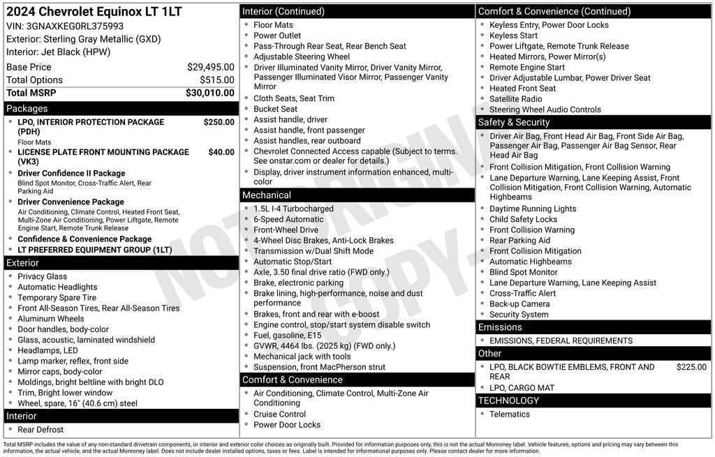 Turn heads in this stylish Sterling Gray Metallic 2024 Chevy Equinox LT with a sleek Jet Black Cloth Interior. Powered by a fuel-efficient 1.5L Turbocharged 4-Cylinder Engine paired with a smooth 6-Speed Automatic Transmission, this Equinox delivers both performance and comfort.