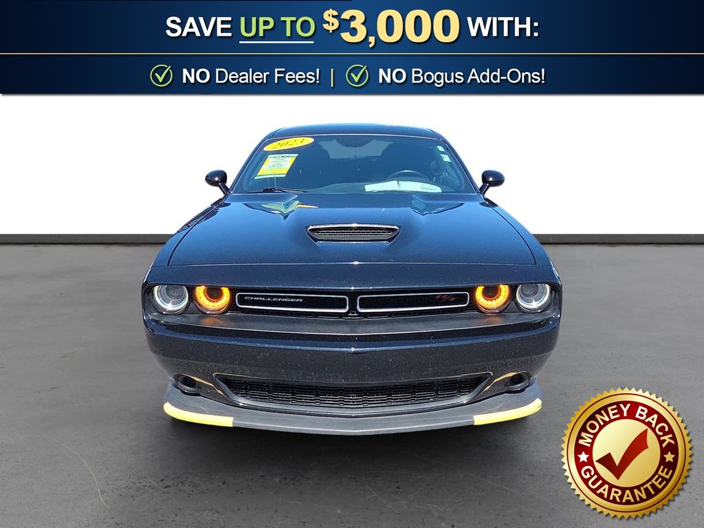 276 Watt Amplifier, 4-Wheel Disc Brakes, 6 Speakers, ABS brakes, Air Conditioning, Alloy wheels, AM/FM radio, Anti-whiplash front head restraints, Apple CarPlay, Apple CarPlay/Android Auto, Auto-dimming Rear-View mirror, Automatic temperature control, Body Color Exterior Mirrors, Brake assist, Bumpers: body-color, Delay-off headlights, Driver door bin, Driver vanity mirror, Dual front impact airbags, Dual front side impact airbags, Electronic Stability Control, Exterior Mirrors w/Heating Element, For More Info, Call 800-643-2112, Four wheel independent suspension, Front anti-roll bar, Front Bucket Seats, Front Center Armrest, Front dual zone A/C, Front License Plate Bracket, Front reading lights, Fully automatic headlights, Garage door transmitter, Google Android Auto, GPS Antenna Input, Heated door mirrors, Houndstooth Cloth Performance Seats, Illuminated entry, Integrated Center Stack Radio, Integrated Voice Command w/Bluetooth, Leather Shift Knob, Low tire pressure warning, Manuf Statement of Origin, Media Hub (2 USB, AUX), Outside temperature display, Overhead airbag, Overhead console, Panic alarm, ParkView Rear Back-Up Camera, Passenger door bin, Passenger vanity mirror, Power door mirrors, Power driver seat, Power steering, Power windows, Quick Order Package 28H, Radio data system, Radio: Uconnect 4 w/7" Display, Rear anti-roll bar, Rear reading lights, Rear seat center armrest, Rear window defroster, Remote keyless entry, Rhombi 2-Pc Wheel Center Cap, Security system, SiriusXM Radio Service, SiriusXM Satellite Radio, Speed control, Speed-sensing steering, Split folding rear seat, Spoiler, Sport steering wheel, Steering wheel mounted audio controls, Tachometer, Telescoping steering wheel, Tilt steering wheel, Traction control, Trip computer, USB Host Flip, Variably intermittent wipers, Wheels: 20" x 8.0" Machined w/Granite Pocket. 2023 Dodge Challenger R/T