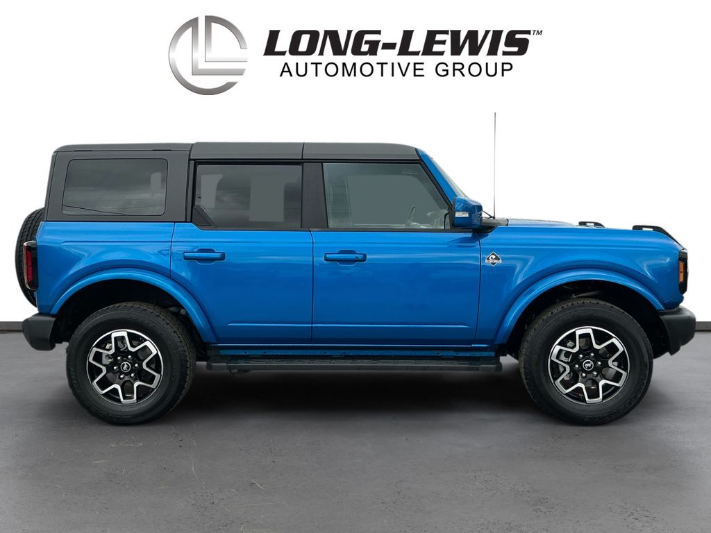 2024 Ford Bronco Outer Banks Velocity Blue Metallic Outer Banks 4WD 10-Speed Automatic 2.3L EcoBoost I-4 10 Speakers w/Subwoofer, 18" Bright Machined Aluminum Wheels, 3.73 Axle Ratio, 360-Degree Camera, 4-Wheel Disc Brakes, 7 Speakers, ABS brakes, Adaptive Cruise Control, Additional Sound Deadening, Air Conditioning, Alloy wheels, AM/FM radio: SiriusXM with 360L, AM/FM Stereo, Auto High-beam Headlights, Auto-dimming Rear-View mirror, Automatic temperature control, Brake assist, Carbonized Gray Molded-In-Color Hard Top, Compass, Connected Navigation, Delay-off headlights, Driver door bin, Driver vanity mirror, Dual front impact airbags, Dual front side impact airbags, Electronic Stability Control, Emergency communication system: 911 Assist, Equipment Group 314A High/Lux Package, Evasive Steering Assist, Exterior Parking Camera Rear, Front anti-roll bar, Front Bucket Seats, Front Center Armrest, Front dual zone A/C, Front fog lights, Front License Plate Bracket, Front Parking Sensors, Front reading lights, Front Row Top Panels Storage Bag, Front wheel independent suspension, Fully automatic headlights, Hard Top Sound Deadening Headliner, Heated door mirrors, Heated front seats, Heated Leather-Trimmed/Vinyl Bucket Seats, Heated Steering Wheel, Illuminated entry, Information on Demand Panel, Integrated roll-over protection, Leather Shift Knob, Low tire pressure warning, Navigation system: Connected Navigation, Occupant sensing airbag, Outside temperature display, Overhead airbag, Overhead console, Panic alarm, Passenger door bin, Passenger vanity mirror, Power door mirrors, Power driver seat, Power passenger seat, Power steering, Power windows, Radio data system, Radio: B&O Sound System by Bang & Olufsen, Rear seat center armrest, Rear-Window Defroster & Washer, Remote keyless entry, Security system, Sideview Mirrors, SiriusXM Radio w/360L, Speed control, Split folding rear seat, Steering wheel mounted audio controls, SYNC 4, Tachometer, Telescoping steering wheel, Tilt steering wheel, Traction control, Trip computer, Universal Garage Door Opener, Variably intermittent wipers, Voltmeter, Wireless Charging Pad.