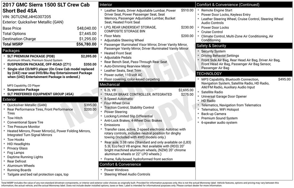 2017 GMC Sierra 1500 SLT Quicksilver Metallic SLT 4WD 8-Speed Automatic with Overdrive EcoTec3 6.2L V8 8-Speed Automatic with Overdrive, 4WD, Cocoa/Dune Leather, 10-Way Power Driver's Seat Adjuster, 110-Volt AC Power Outlet, 150 Amp Alternator, 1st & 2nd Row Color-Keyed Carpeted Floor Mats, 2-Speed Active Electronic AutoTrac Transfer Case, 20" x 9" Polished Aluminum Wheels, 4-Wheel Disc Brakes, 4.2" Diagonal Color Display Driver Info Center, 40/20/40 Front Split Bench Seat, 6 Speaker Audio System, 6 Speakers, 6-Speaker Audio System, 6" Rectangular Chromed Tubular Assist Steps, ABS brakes, Active Noise Cancellation, Adjustable pedals, Air Conditioning, All-Weather Floor Liner (LPO), Alloy wheels, AM/FM radio, Auto-dimming door mirrors, Auto-Dimming Inside Rear-View Mirror, Auto-dimming Rear-View mirror, Automatic temperature control, Auxiliary External Transmission Oil Cooler, Bodyside moldings, Brake assist, Bumpers: chrome, CD player, Chrome Bodyside Moldings, Chrome Door Handles, Chrome Mirror Caps, Color-Keyed Carpeting, Compass, Composite Storage Bin Under Rear Seat, Deep-Tinted Glass, Delay-off headlights, Driver & Front Passenger Illuminated Vanity Mirrors, Driver door bin, Driver vanity mirror, Dual front impact airbags, Dual front side impact airbags, Dual-Zone Automatic Climate Control, Electric Rear-Window Defogger, Electronic Stability Control, Emergency communication system: OnStar Guidance, Exterior Parking Camera Rear, EZ Lift & Lower Tailgate, Floor Mounted Console, Front anti-roll bar, Front Center Armrest w/Storage, Front dual zone A/C, Front fog lights, Front Frame-Mounted Black Recovery Hooks, Front Full Feature Power Reclining Bucket Seats, Front reading lights, Front wheel independent suspension, Fully automatic headlights, Garage door transmitter: HomeLink, HD Radio, Heated door mirrors, Heated Driver & Front Passenger Seats, Heated front seats, Heavy Duty Suspension, Heavy-Duty Rear Locking Differential, High-Intensity Discharge Headlights, Hill Descent Control, Illuminated entry, Integrated Trailer Brake Controller, Leather Appointed Seat Trim, Leather Wrapped Steering Wheel w/Cruise Controls, LED Cargo Box Lighting, LED Tailamps w/Signature, Low tire pressure warning, Manual Tilt/Telescoping Steering Column, Memory seat, Occupant sensing airbag, Off-Road Suspension Package, OnStar 3 Month Guidance Plan, OnStar w/4G LTE, Outside temperature display, Overhead airbag, Overhead console, Panic alarm, Passenger door bin, Passenger vanity mirror, Power Adjustable Pedals, Power door mirrors, Power driver seat, Power Folding & Adjustable Heated Outside Mirrors, Power passenger seat, Power steering, Power windows, Power Windows w/Driver Express Up & Down, Preferred Equipment Group 4SA, Radio data system, Radio: AM/FM Stereo w/8" Diagonal Color Touch Nav., Radio: AM/FM Stereo w/8" Diagonal Color Touch Screen, Rear 60/40 Folding Bench Seat (Folds Up), Rear reading lights, Rear seat center armrest, Rear step bumper, Rear Vision Camera, Rear Wheelhouse Liners, Rear window defroster, Remote Keyless Entry, Remote keyless entry, Remote Vehicle Starter System, Security system, Single Slot CD/MP3 Player, SiriusXM Satellite Radio, SLT Premium Package, Speed control, Speed-sensing steering, Split folding rear seat, Steering Wheel Audio Controls, Steering wheel mounted audio controls, Tachometer, Telescoping steering wheel, Theft Deterrent System (Unauthorized Entry), Thin Profile LED Fog Lamps, Tilt steering wheel, Traction control, Trailering Equipment, Trip computer, Turn signal indicator mirrors, Universal Home Remote, Variably intermittent wipers, Voltmeter, Wheels: 18" x 8.5" Polished Aluminum, Wireless Charging, 8-Speed Automatic with Overdrive, 4WD, Cocoa/Dune Leather.